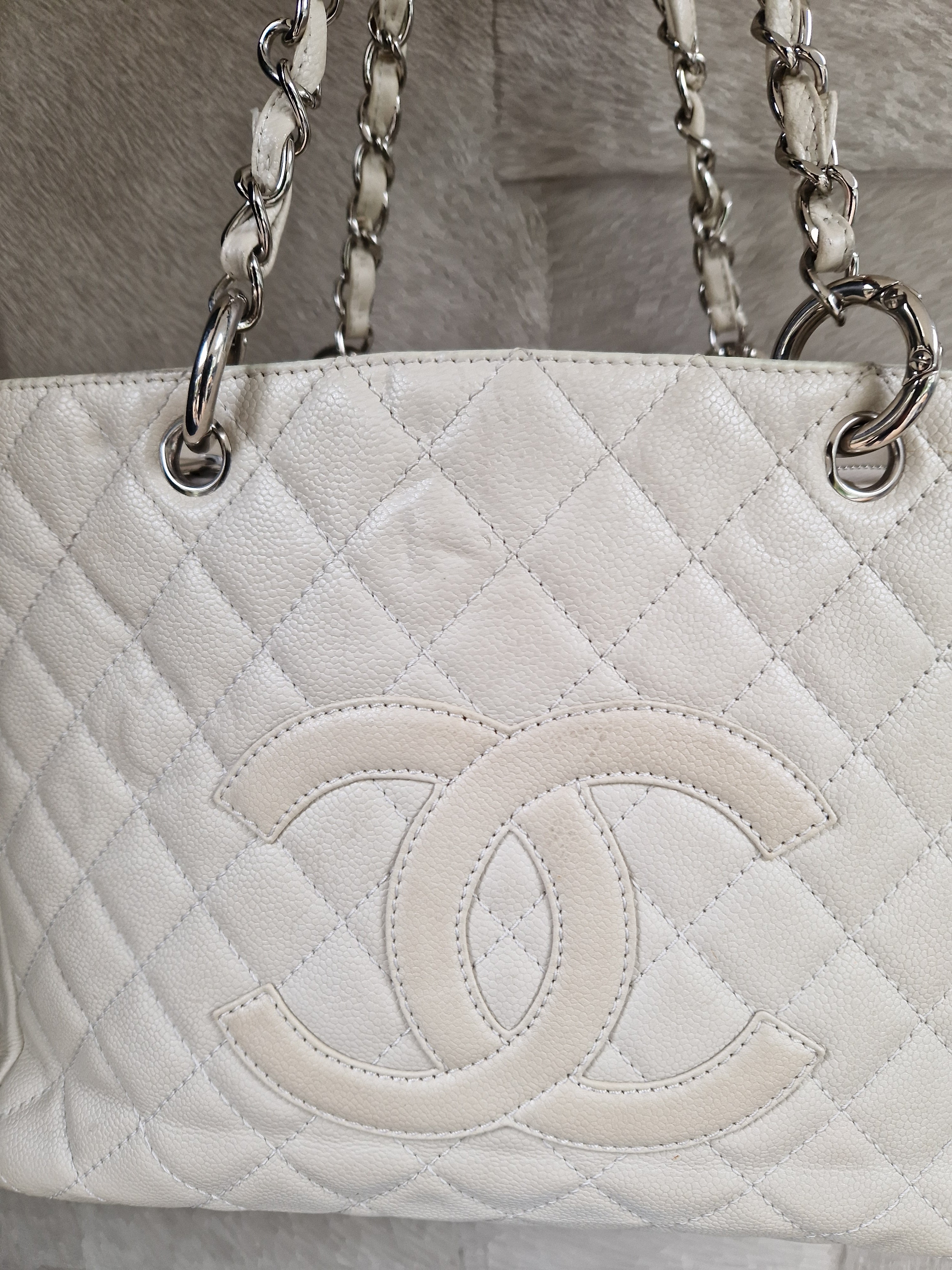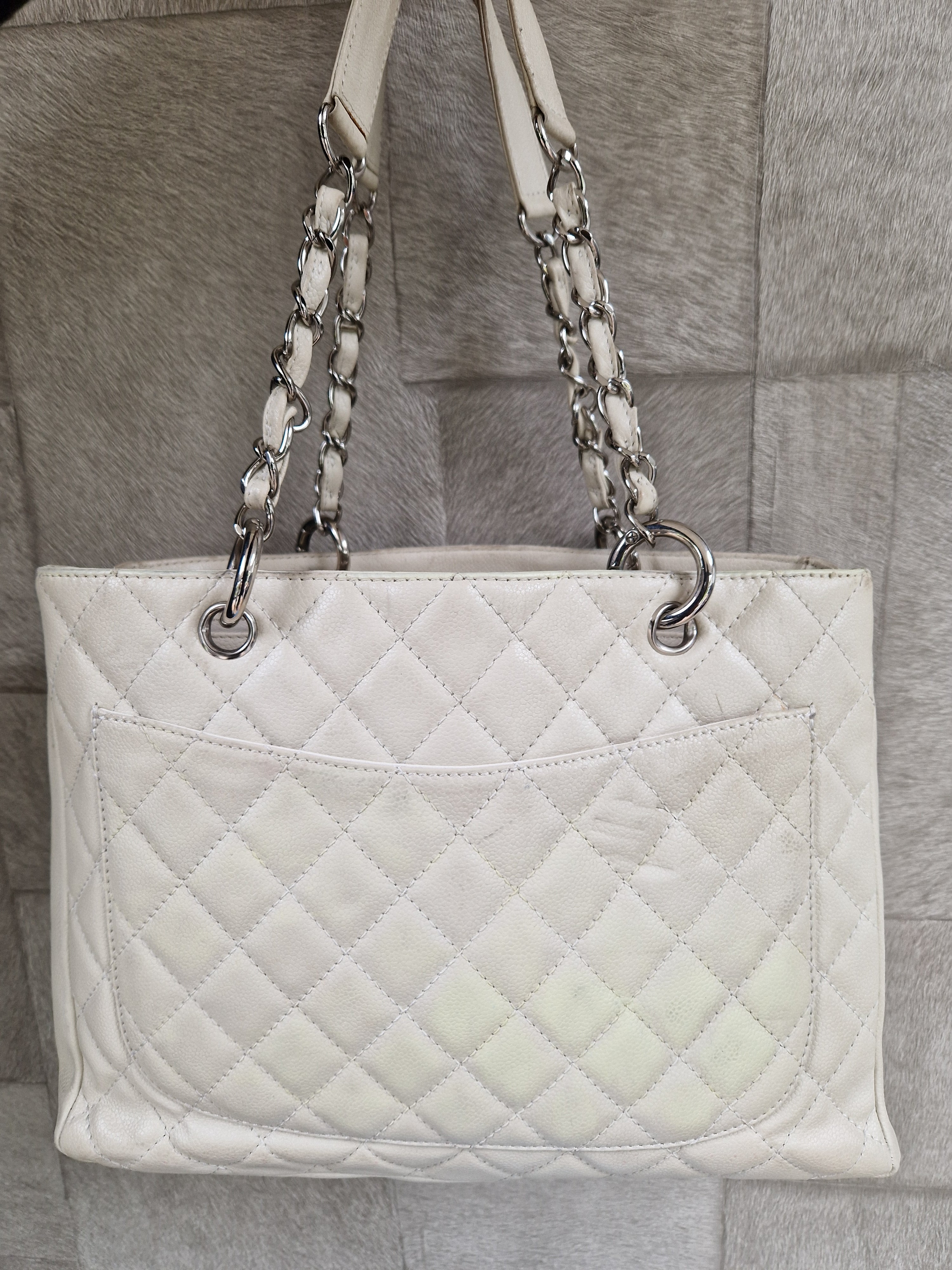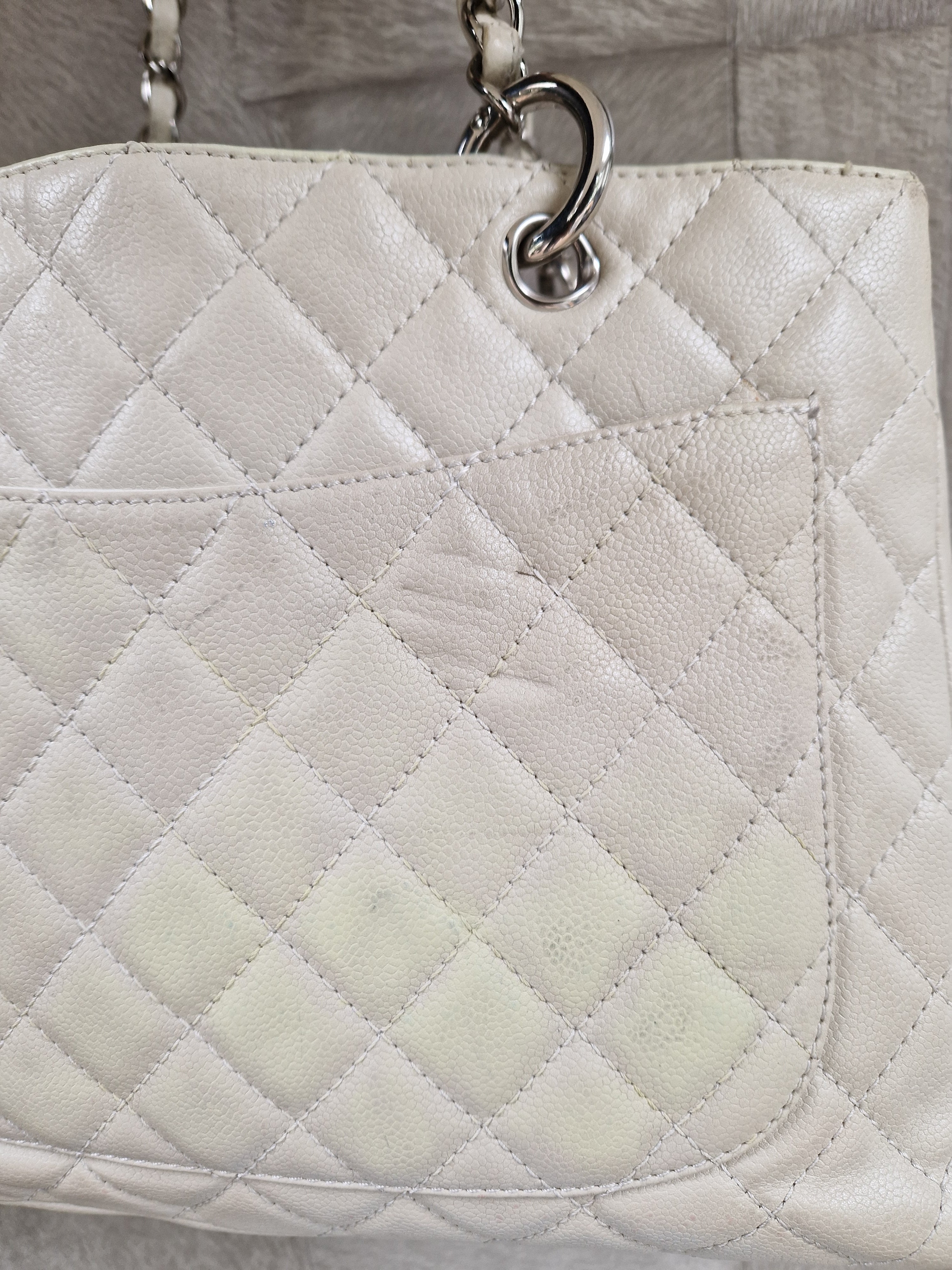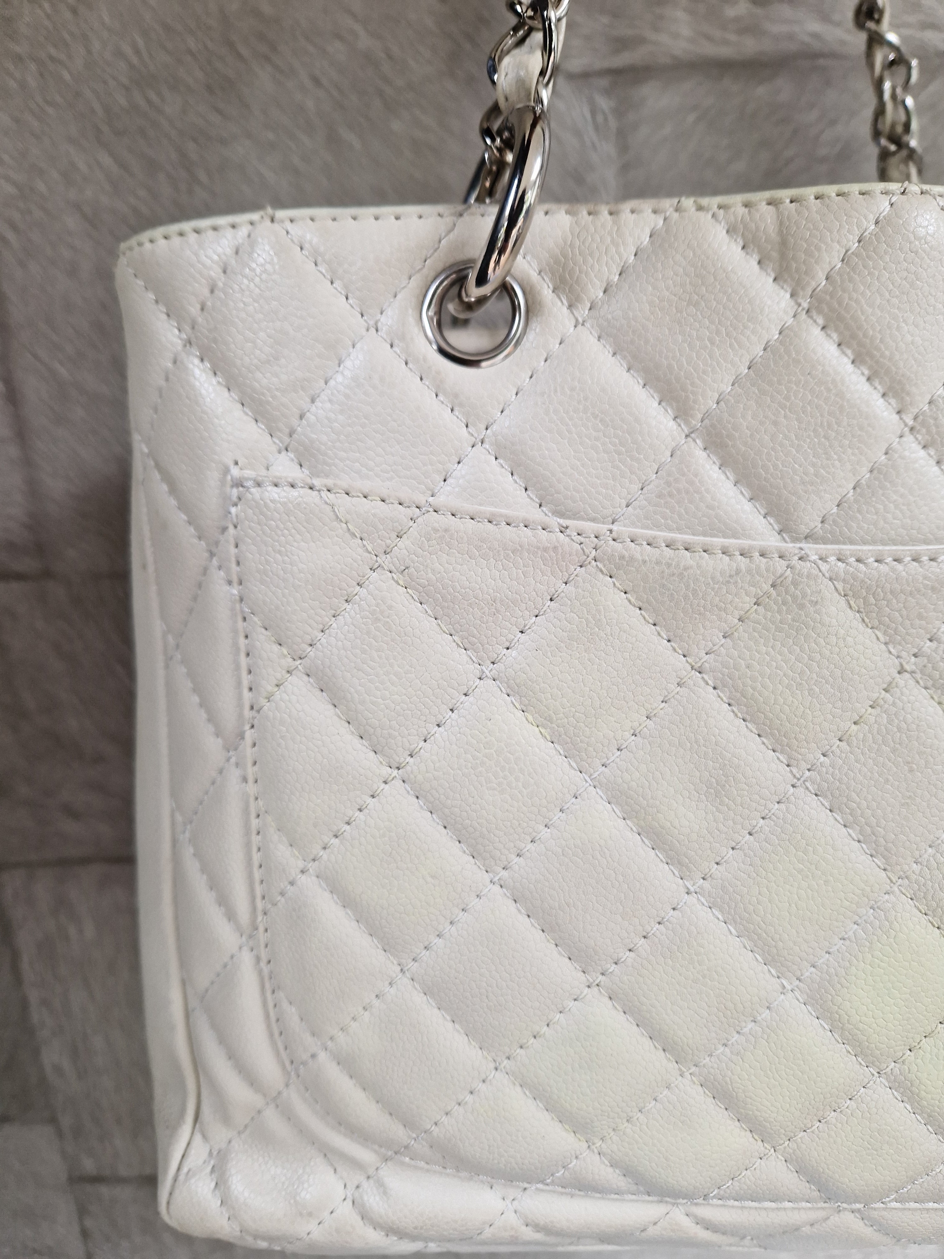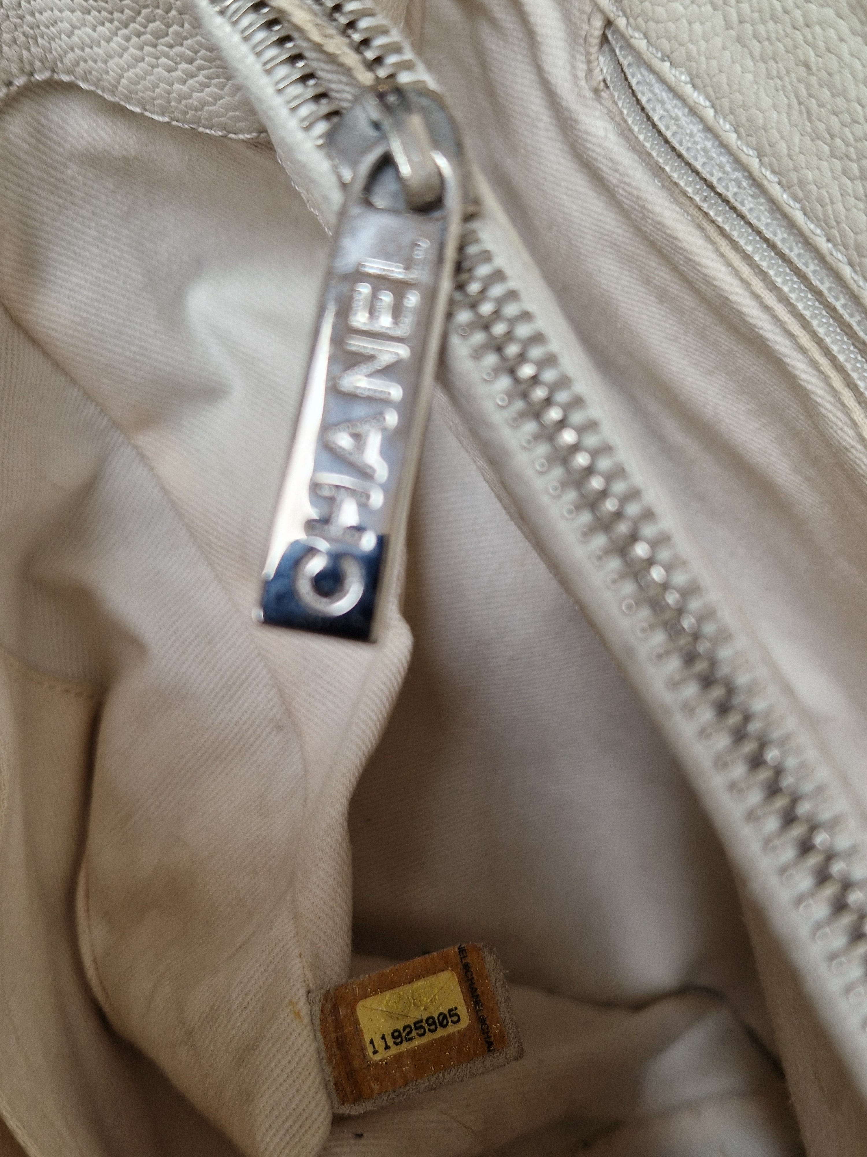 Brand:Chanel Model:GST tote Exterior material:Cavier Exterior colour:white Print:plain Interior material:fabric Closure:middle zipper Hardware tone:silver Type:shoulder bag Accessories: Features:features a double...