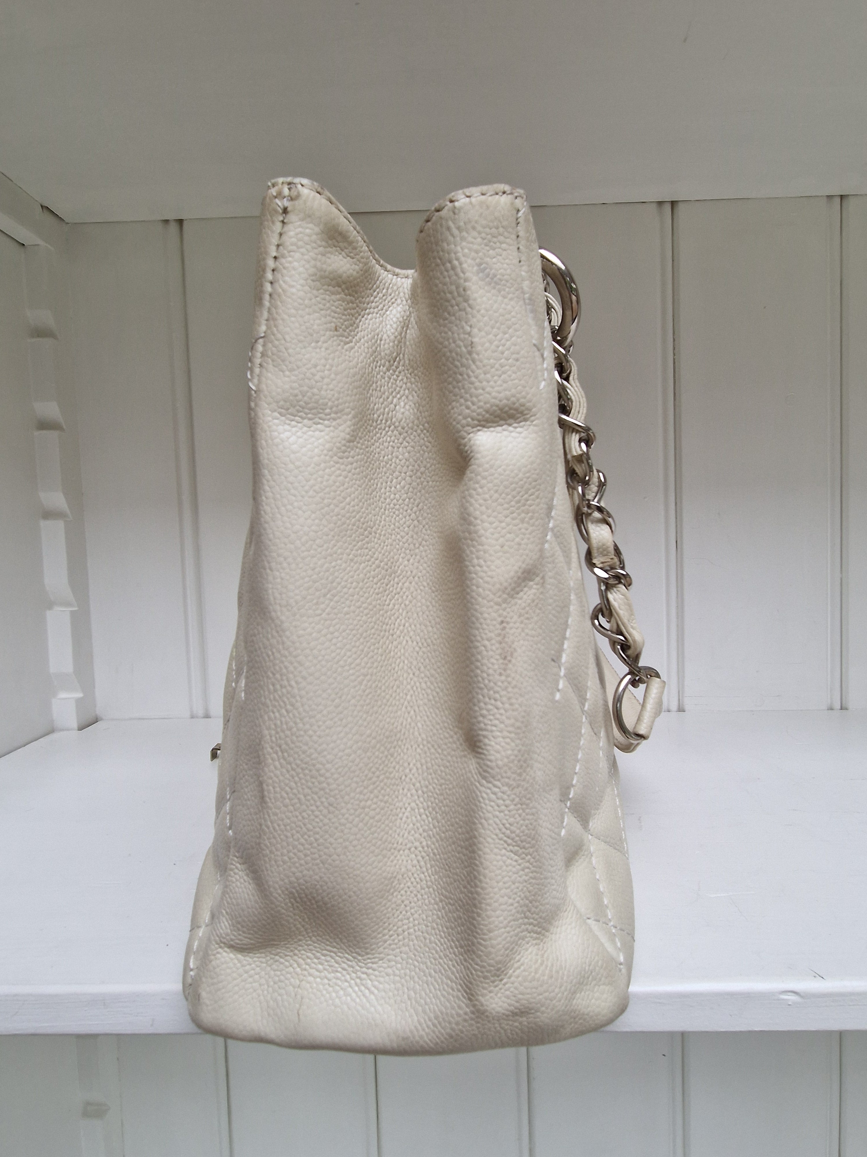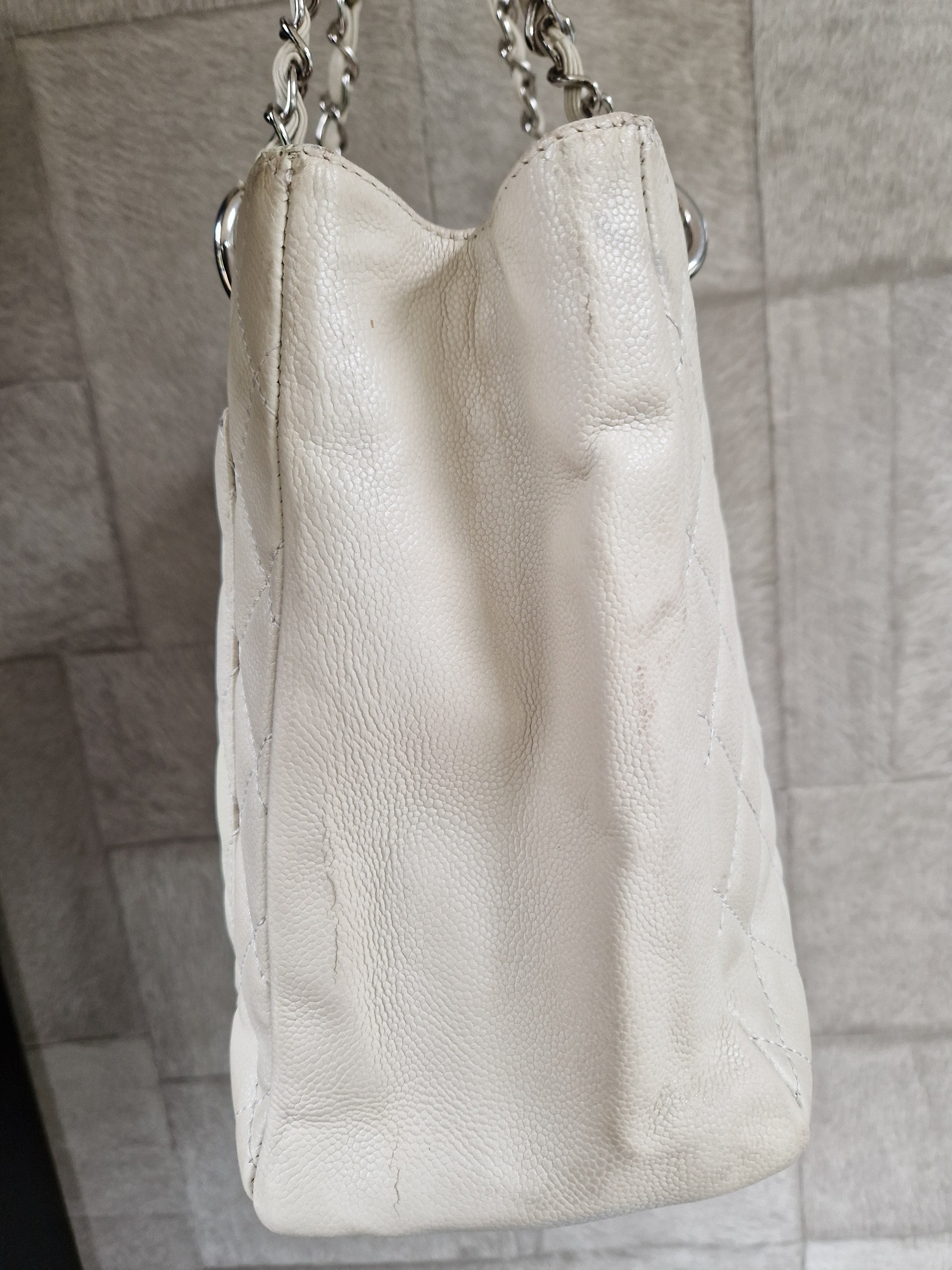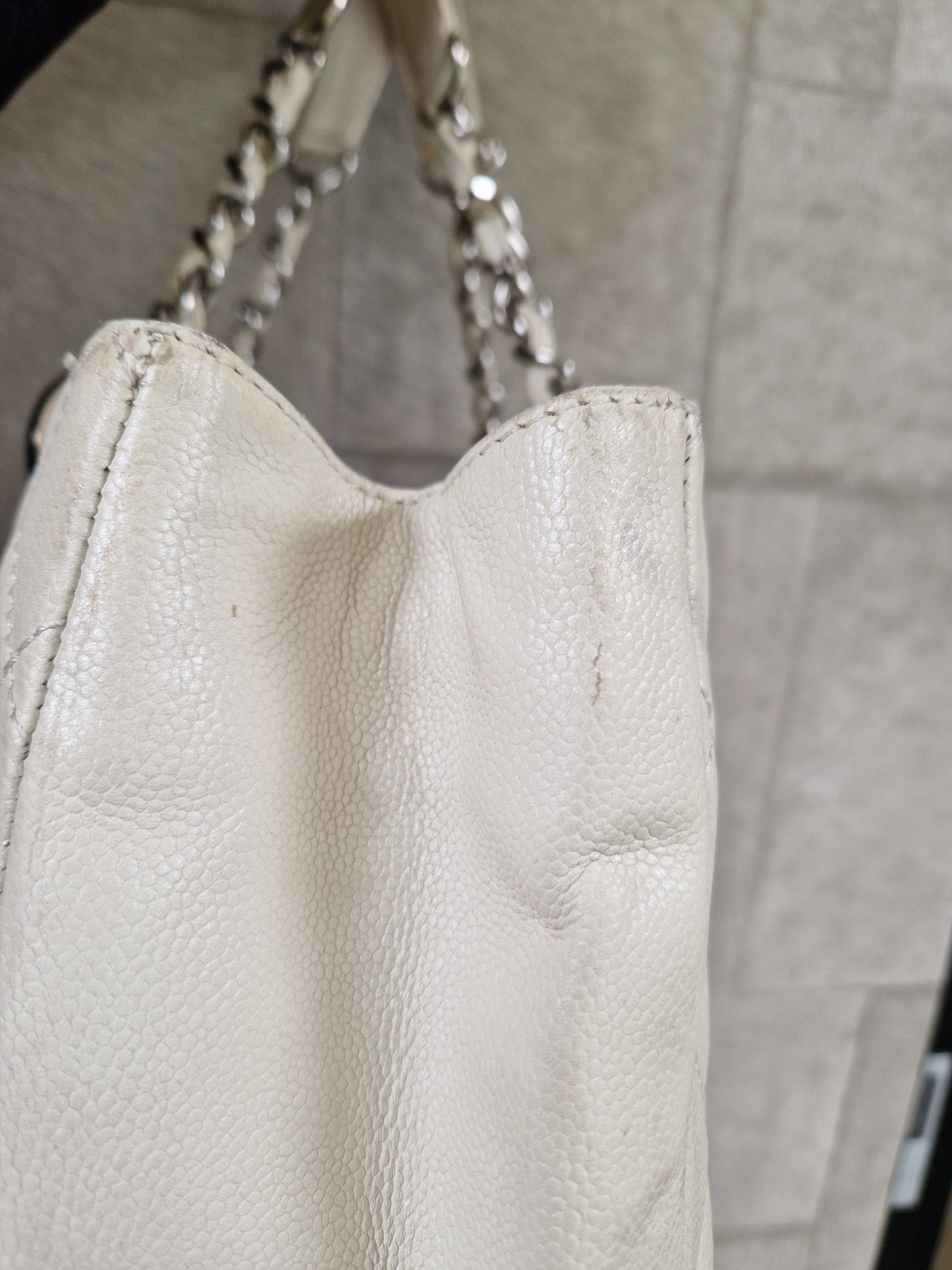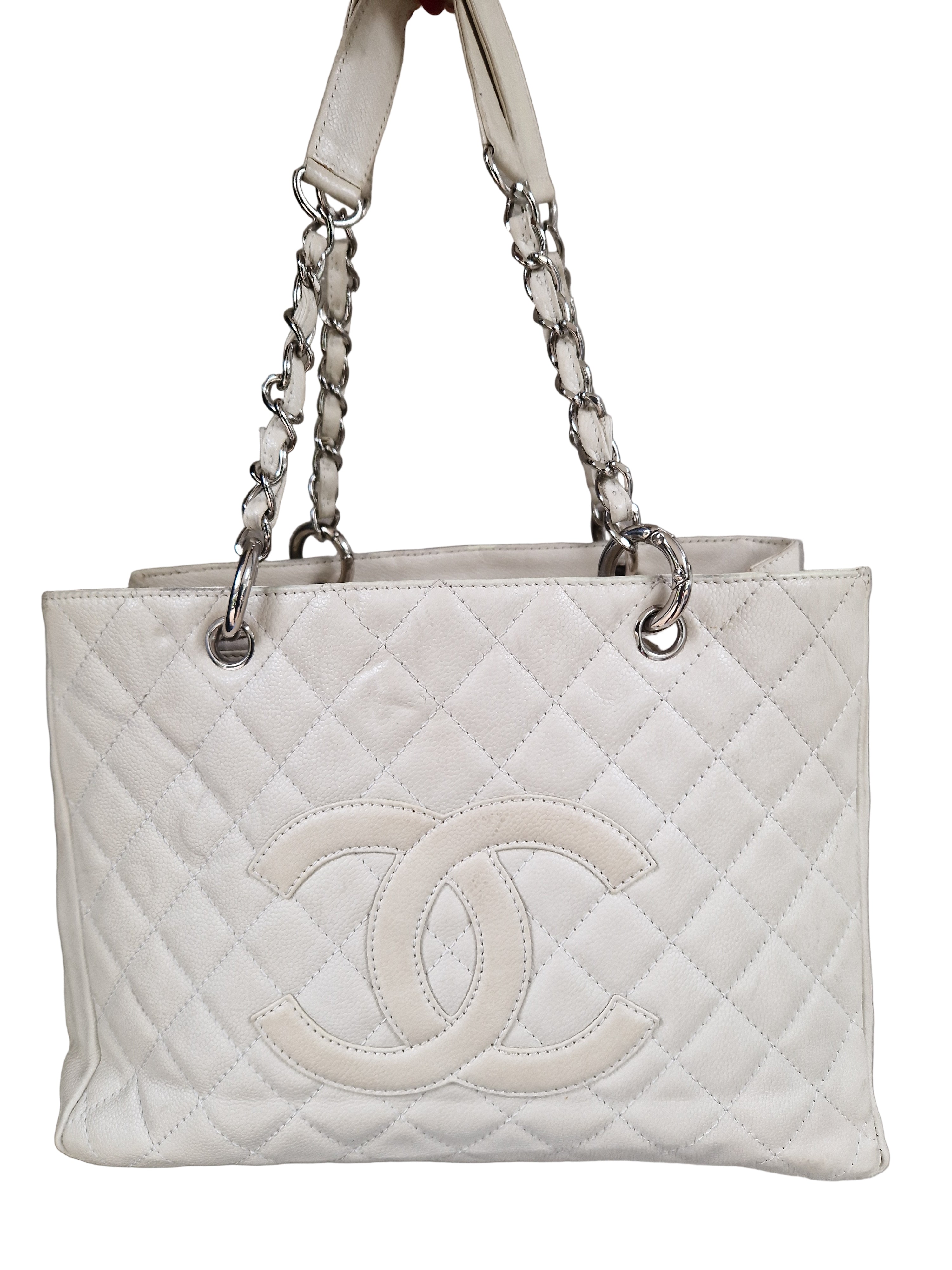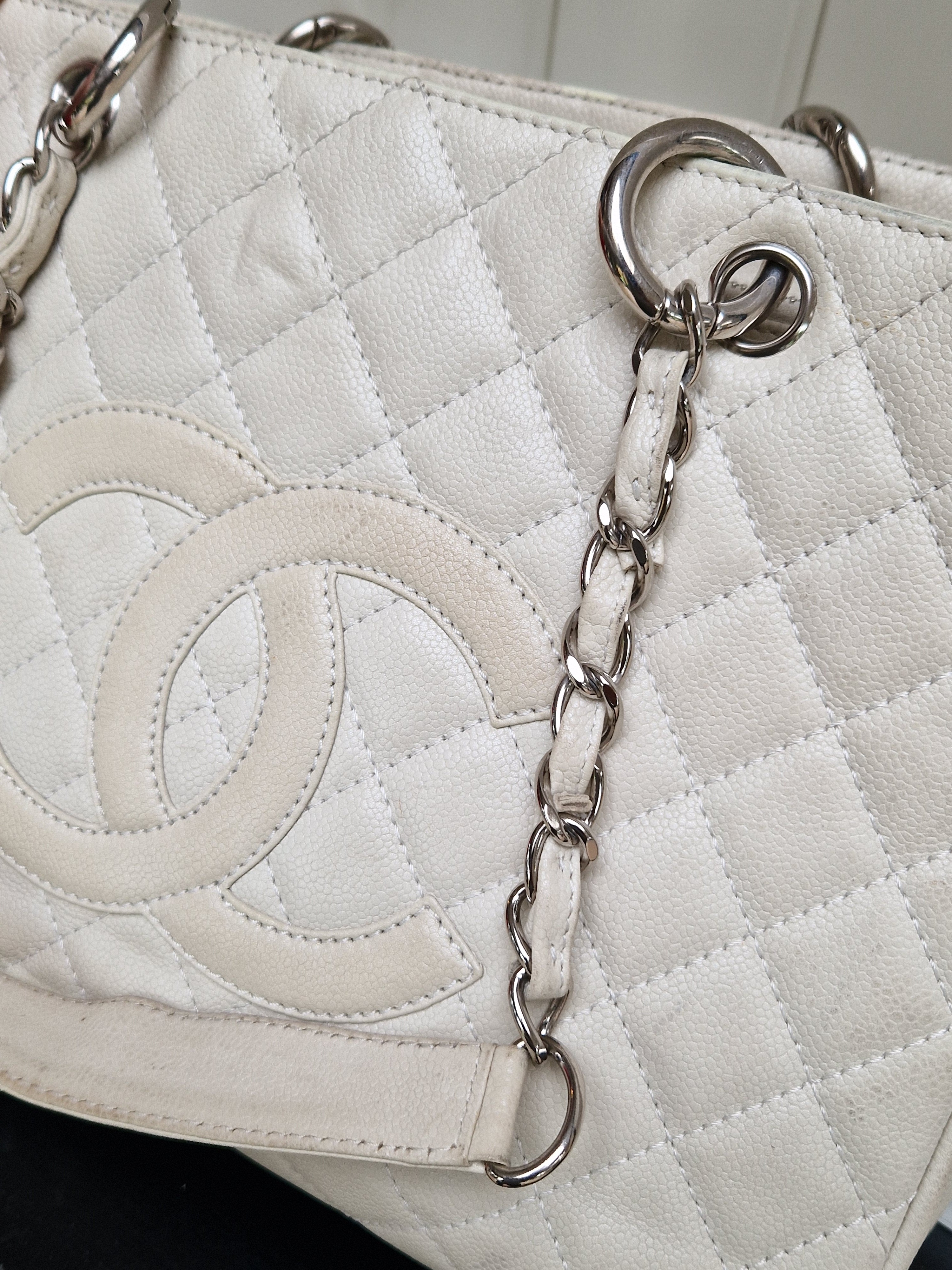 Brand:Chanel Model:GST tote Exterior material:Cavier Exterior colour:white Print:plain Interior material:fabric Closure:middle zipper Hardware tone:silver Type:shoulder bag Accessories: Features:features a double...