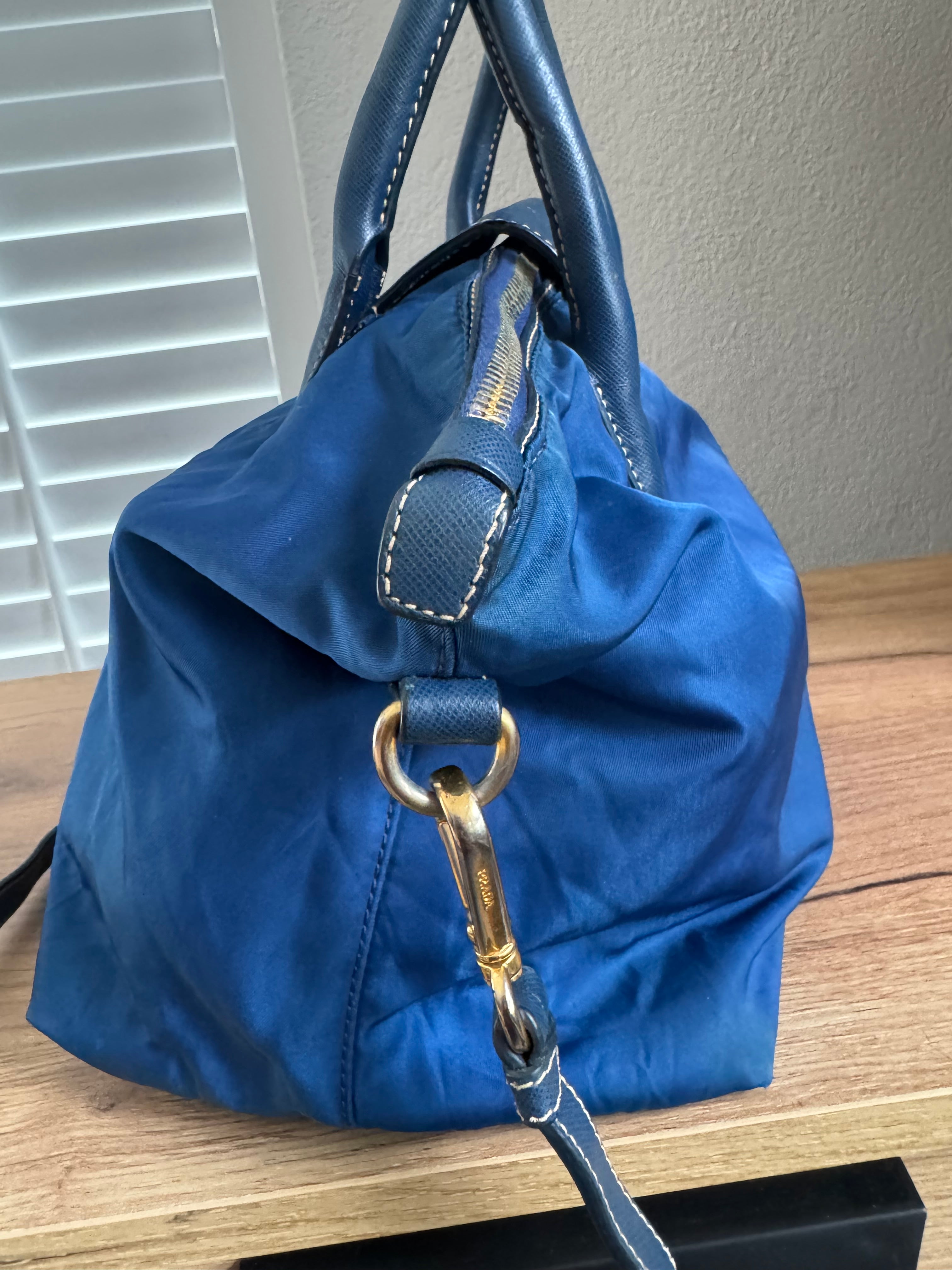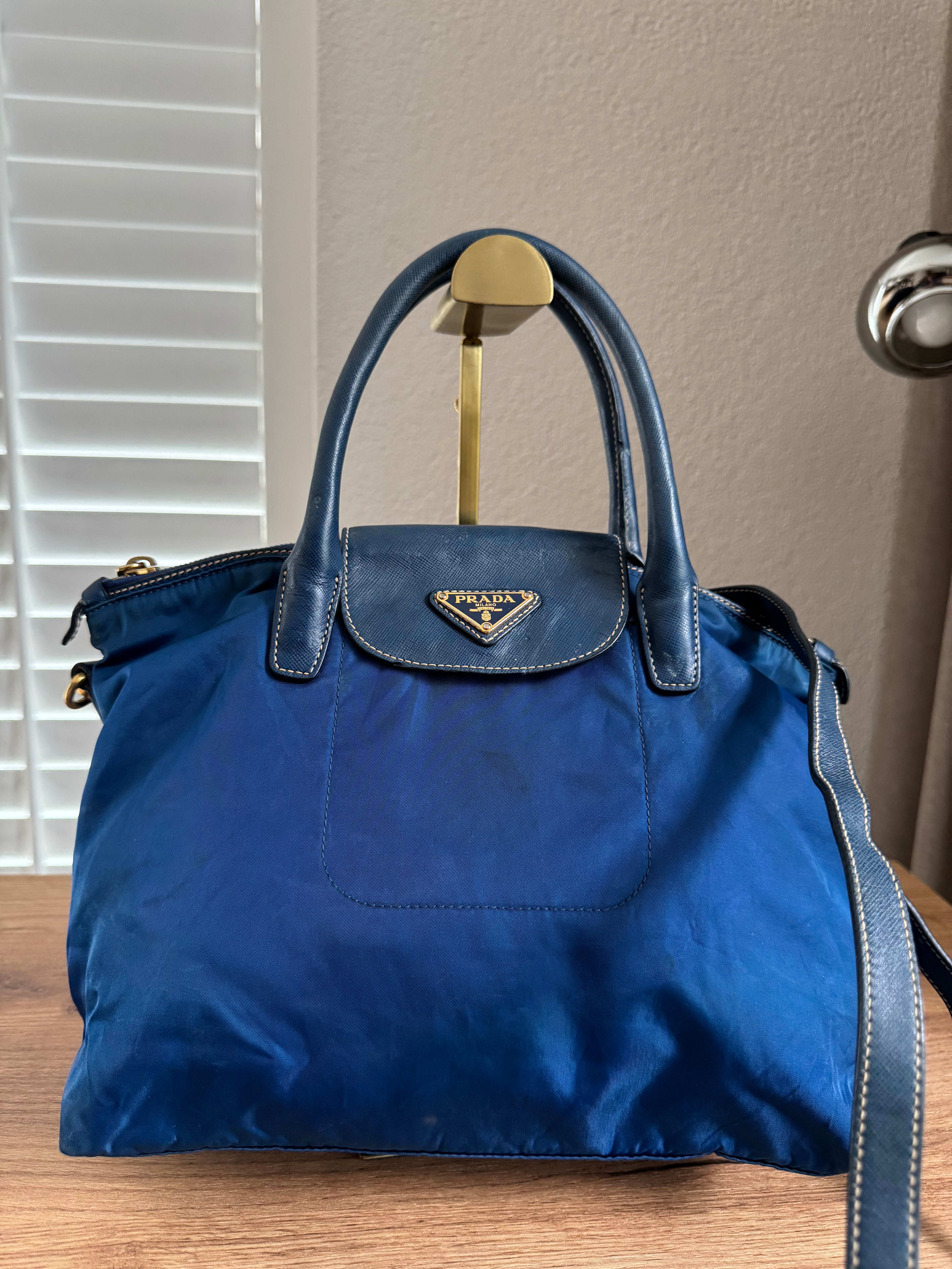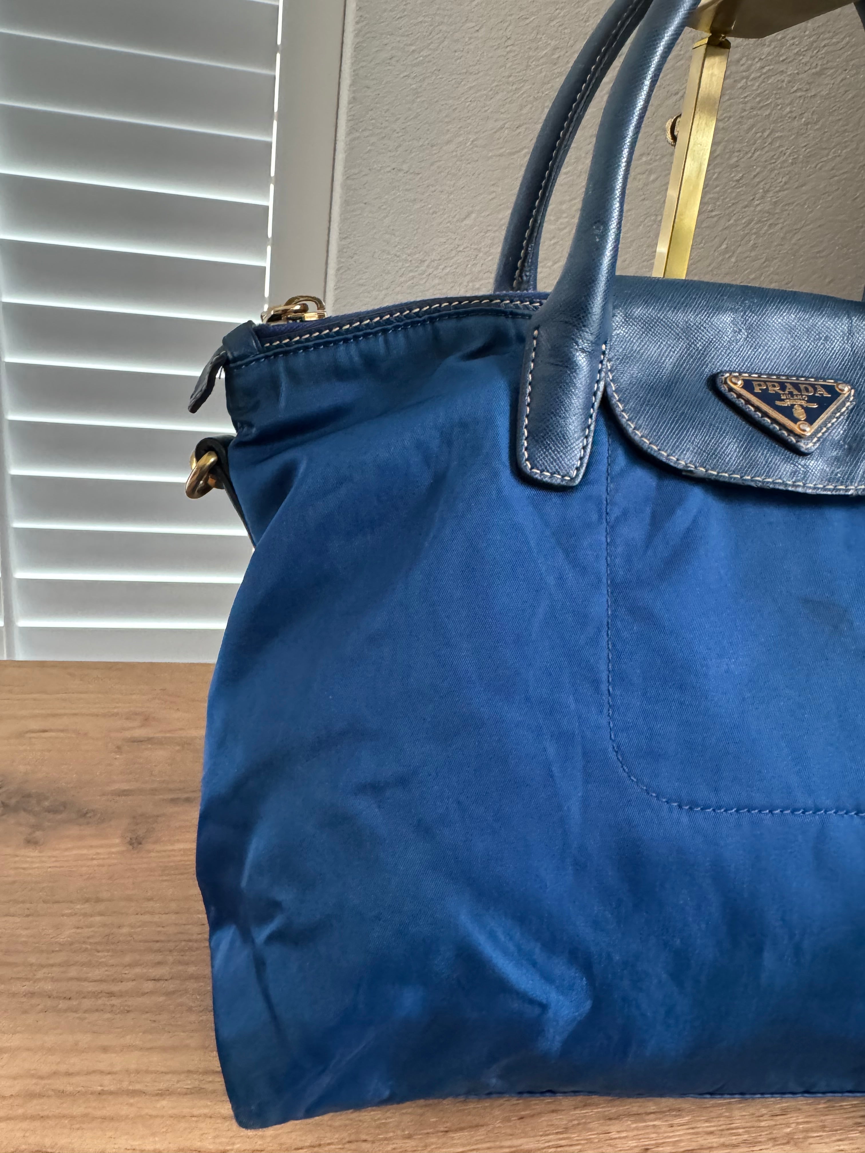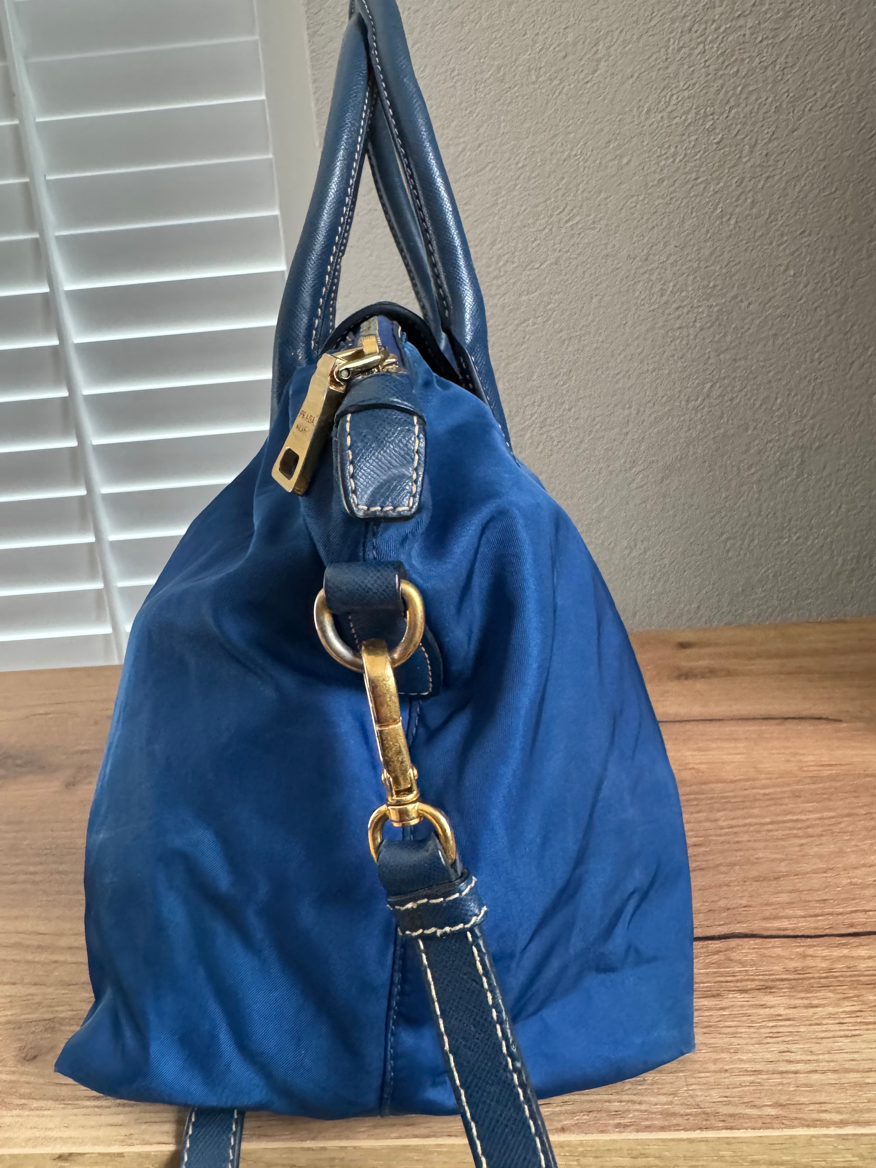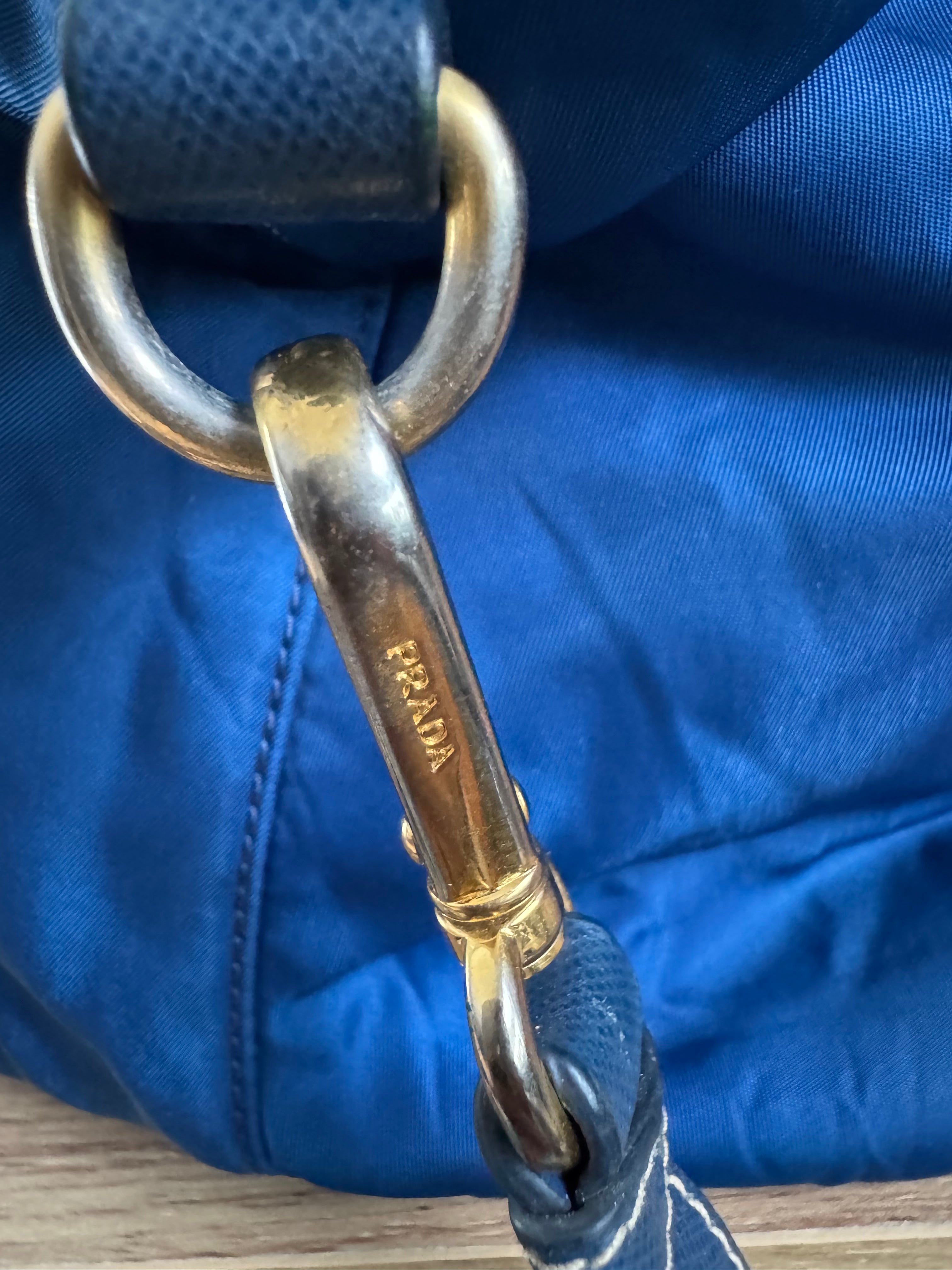Brand:Prada Model:re nylon handbag Exterior material:nylon Exterior colour:blue Print:plain Interior material:nylon Closure:zip Hardware tone:gold Type:handbag Accessories:removable crossbody bag Features:adjustable strap... Read more Read more