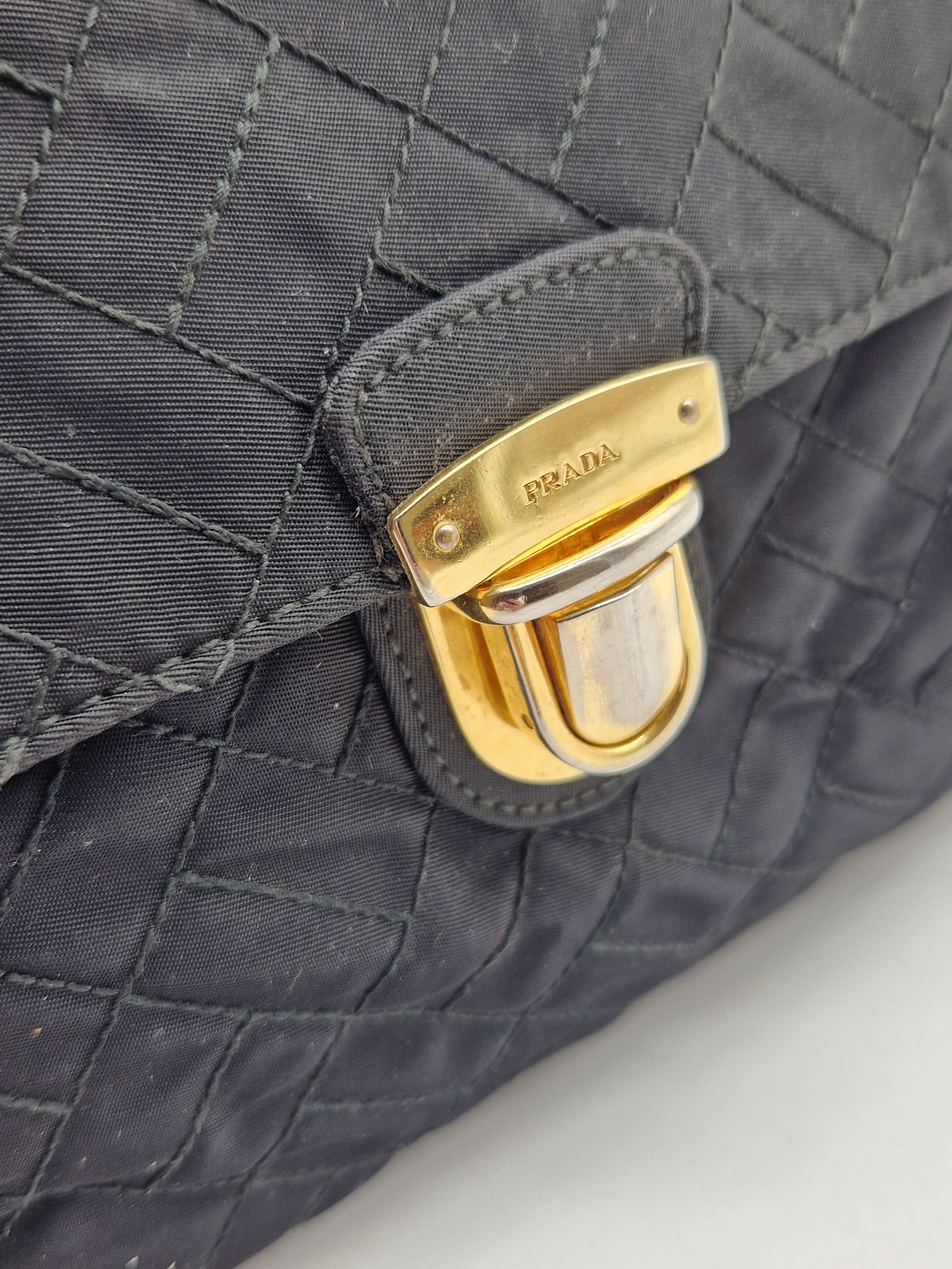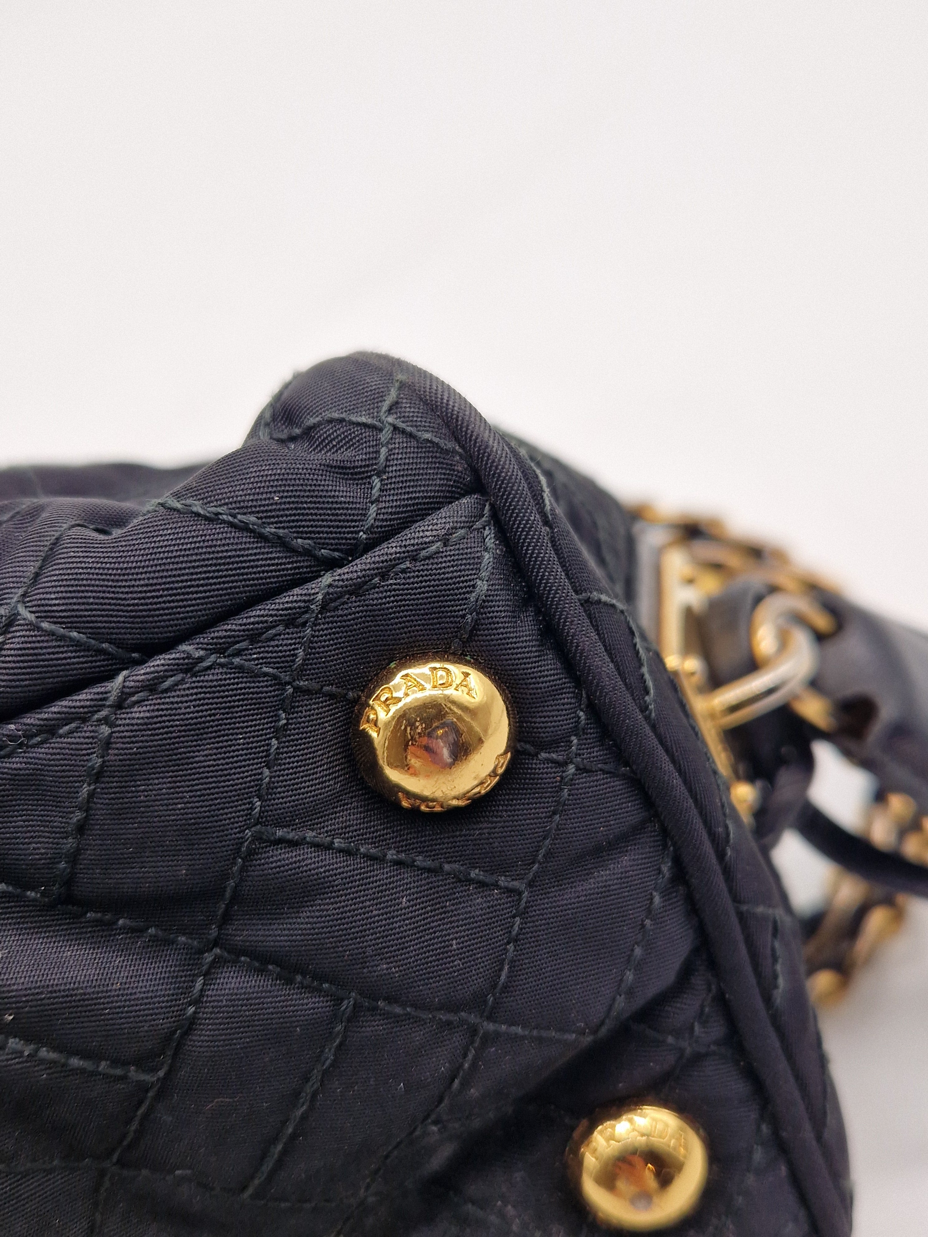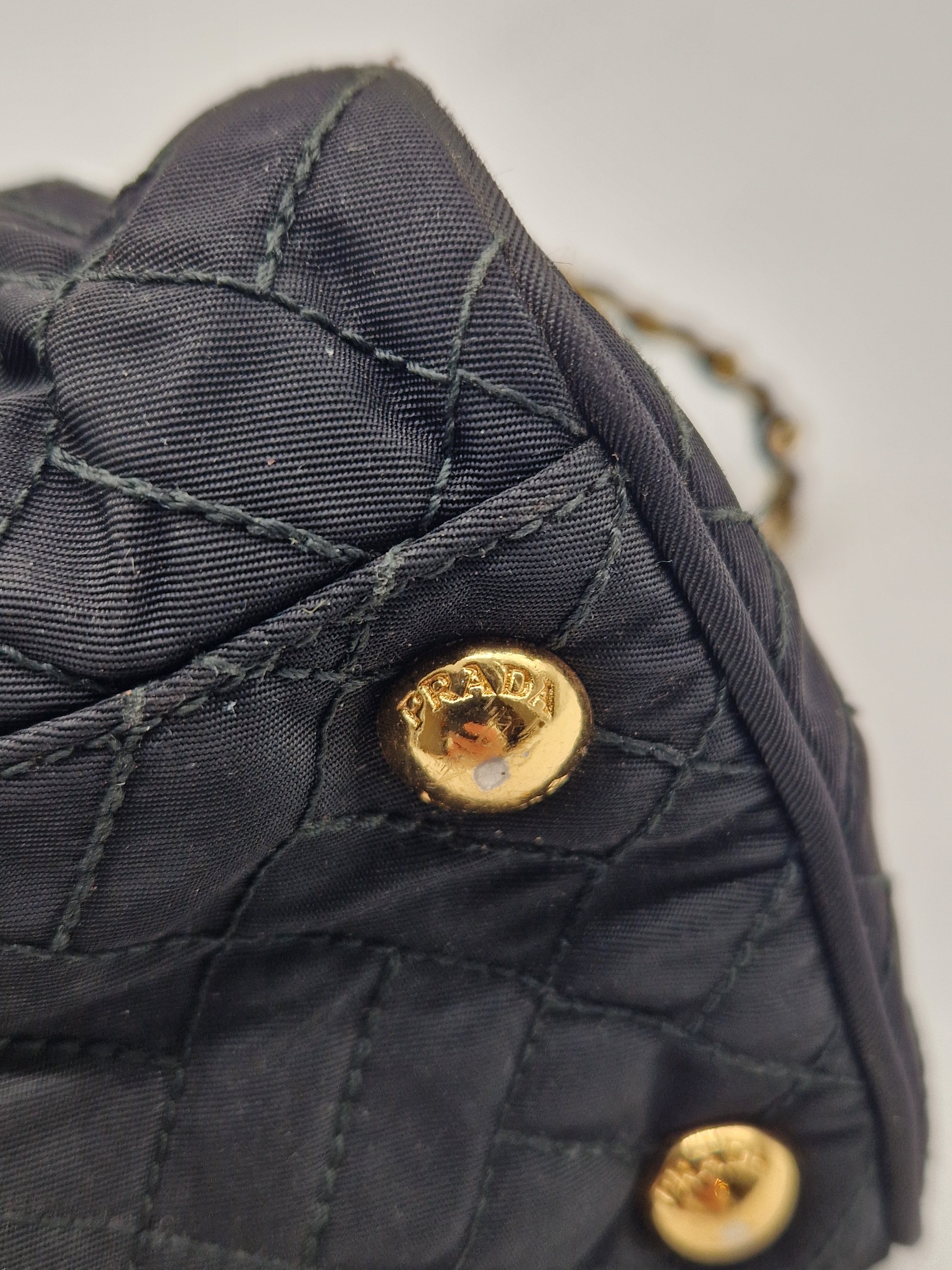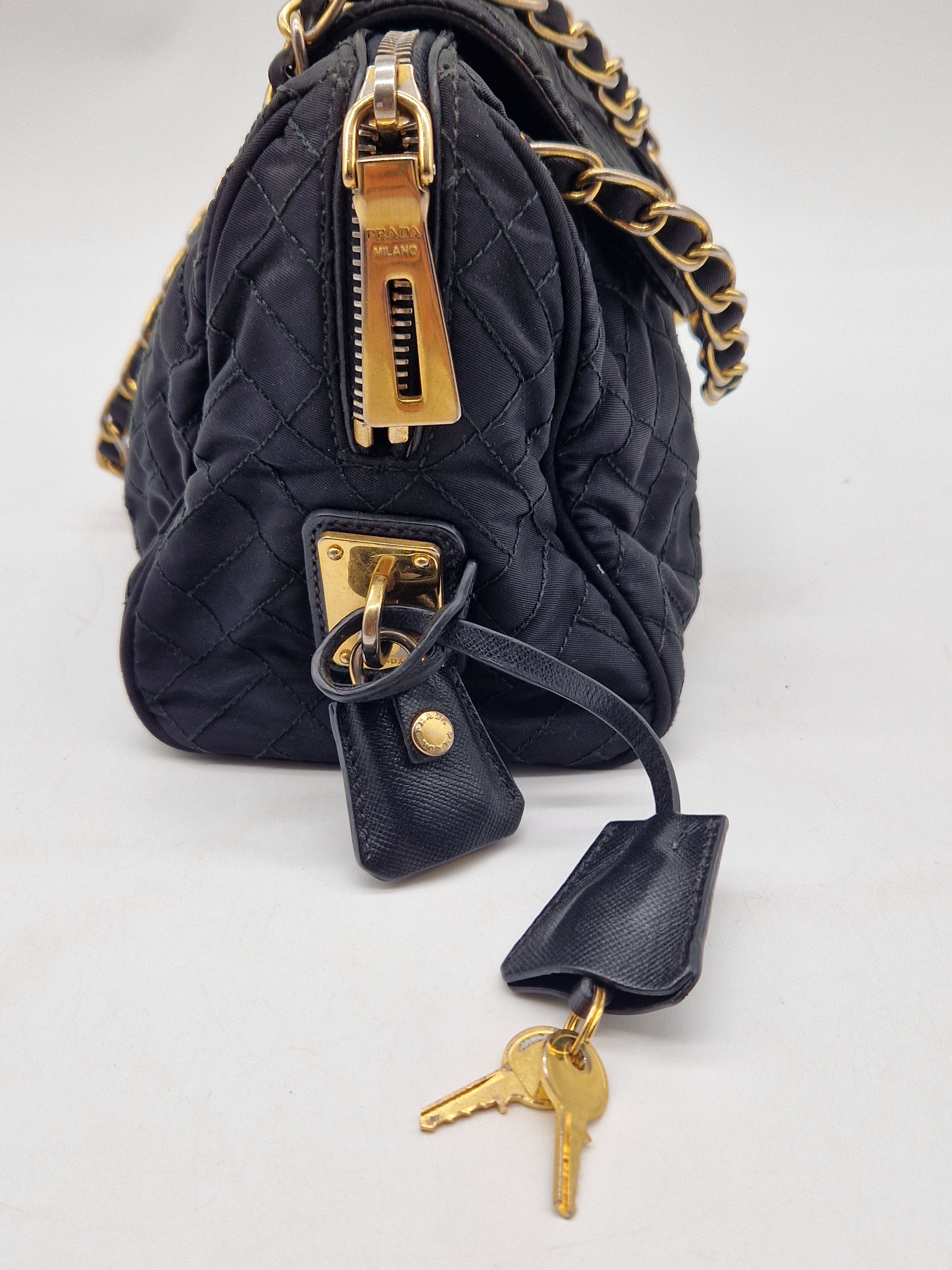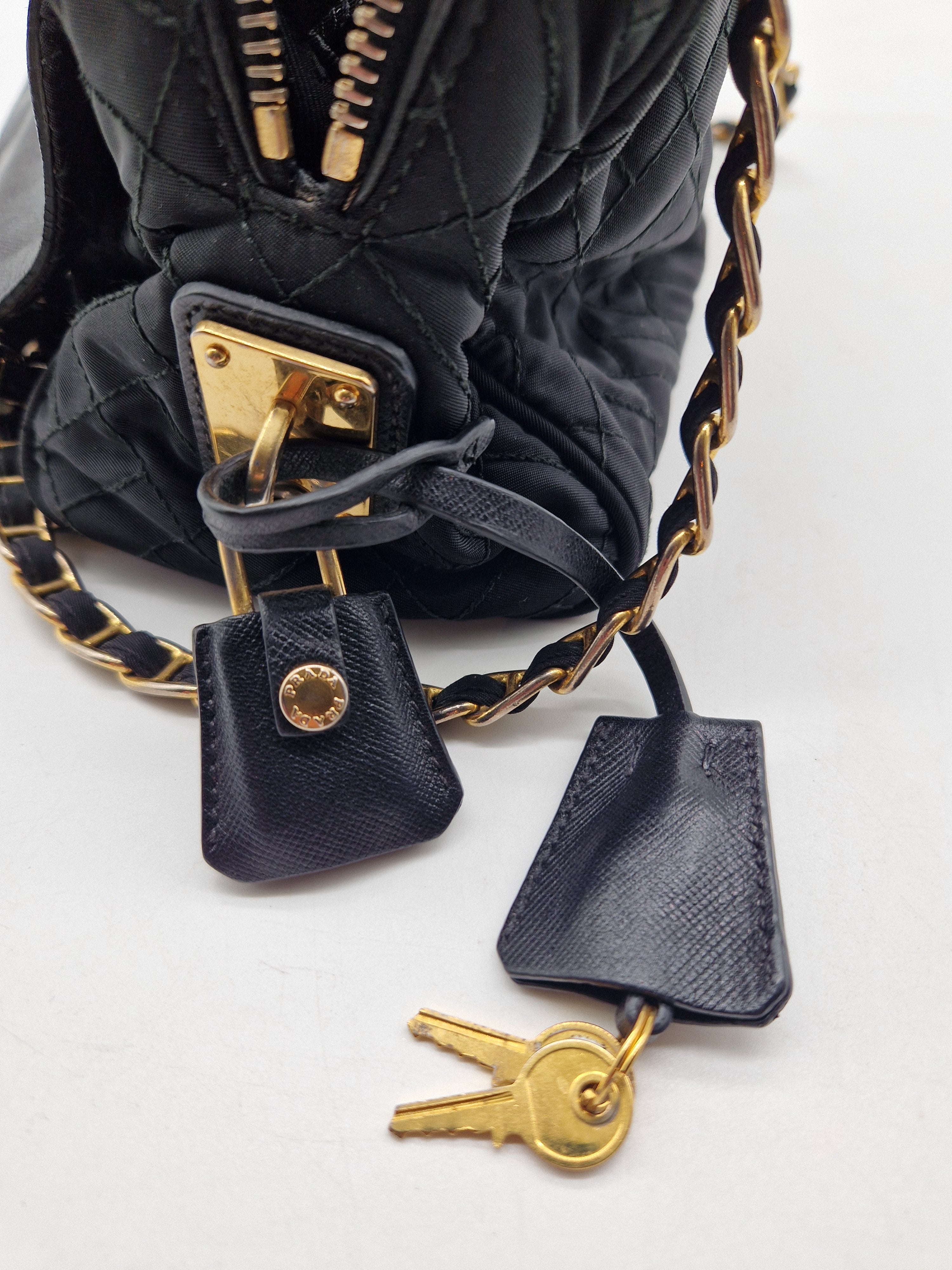 Brand:Prada Model:quilted Exterior material:cloth Exterior colour:black Print:plain Interior material:cloth Closure:flap Hardware tone:gold Type:shoulder/crossbody bag Accessories: Features:padlock and key Serial number:present...