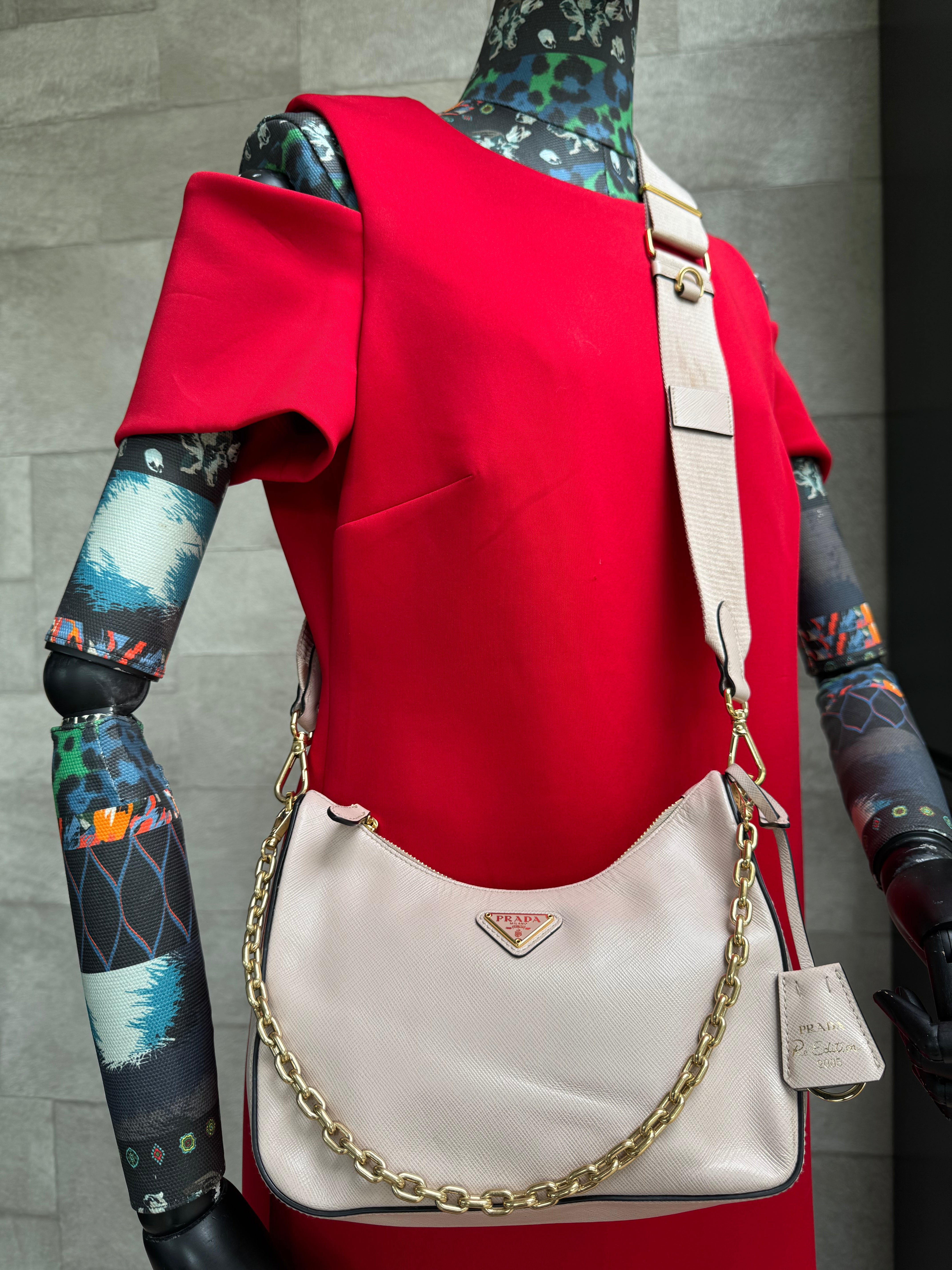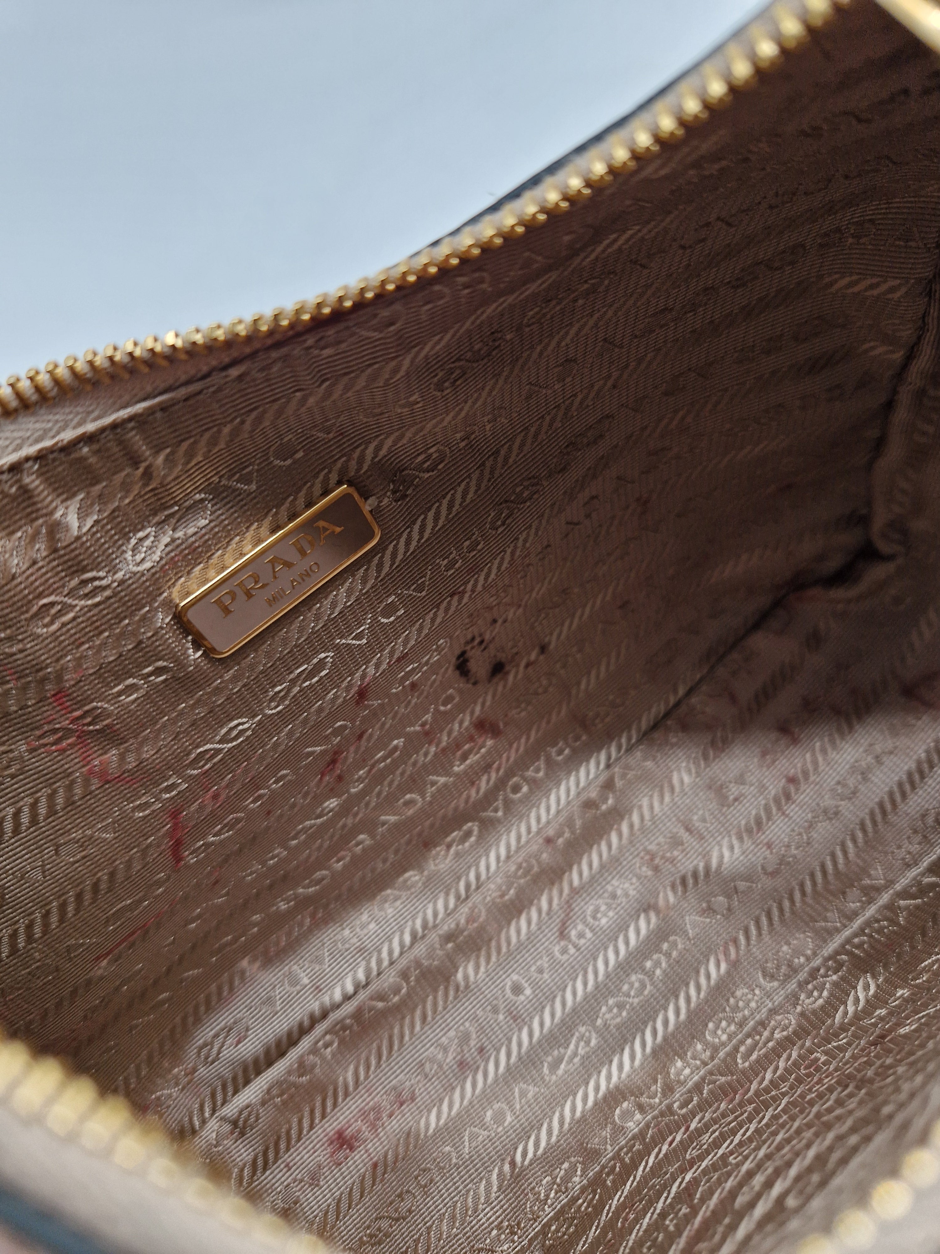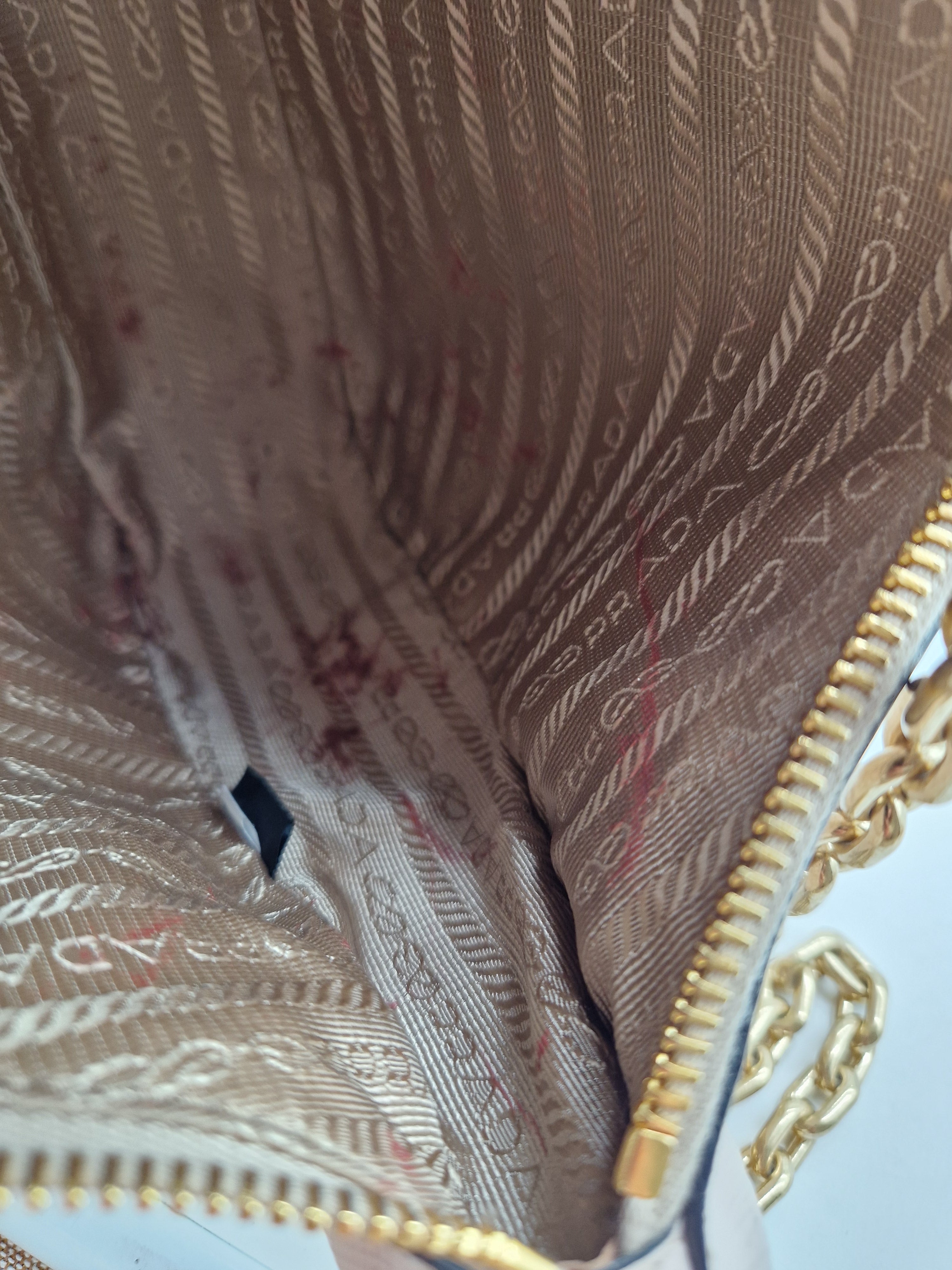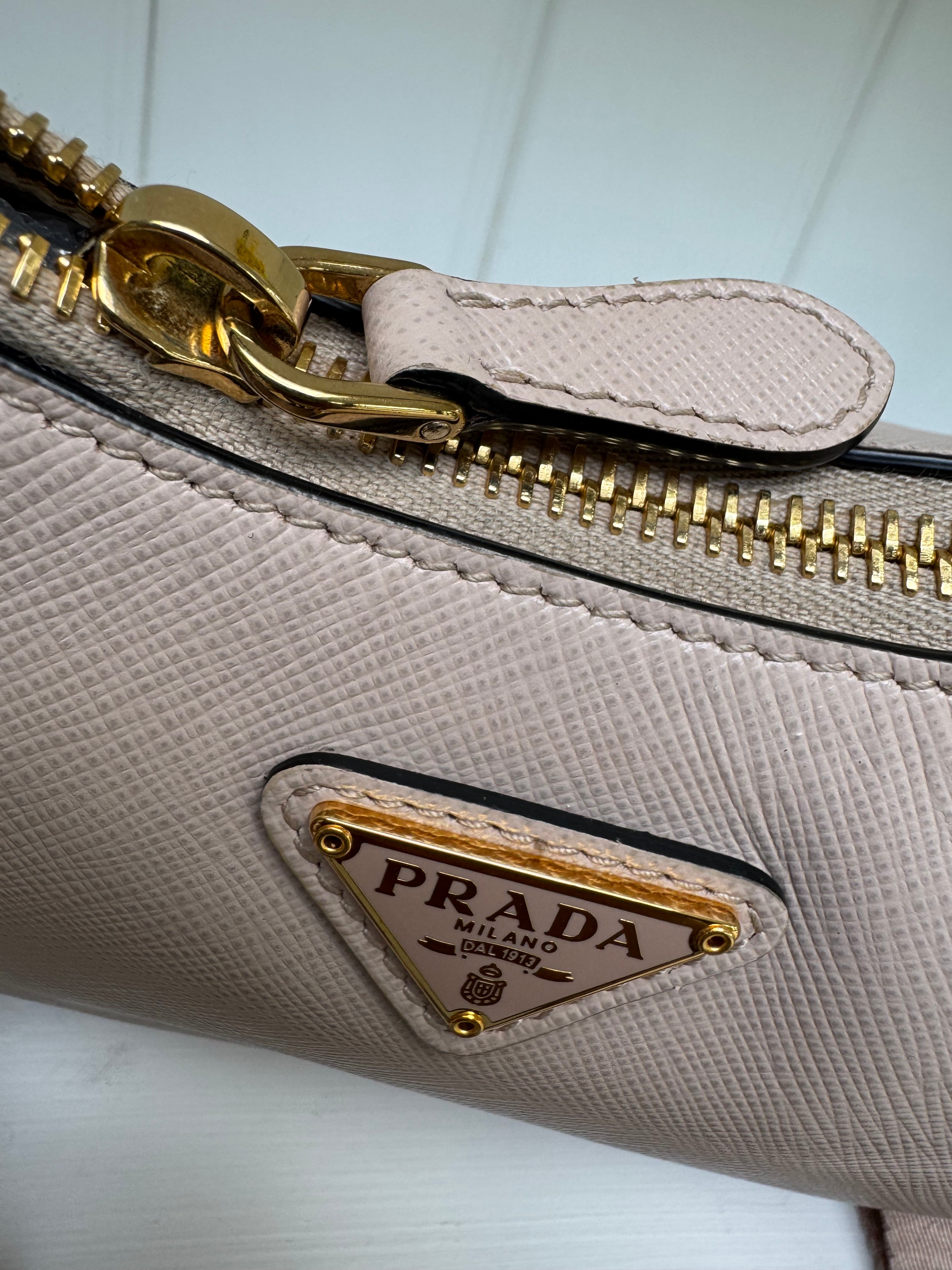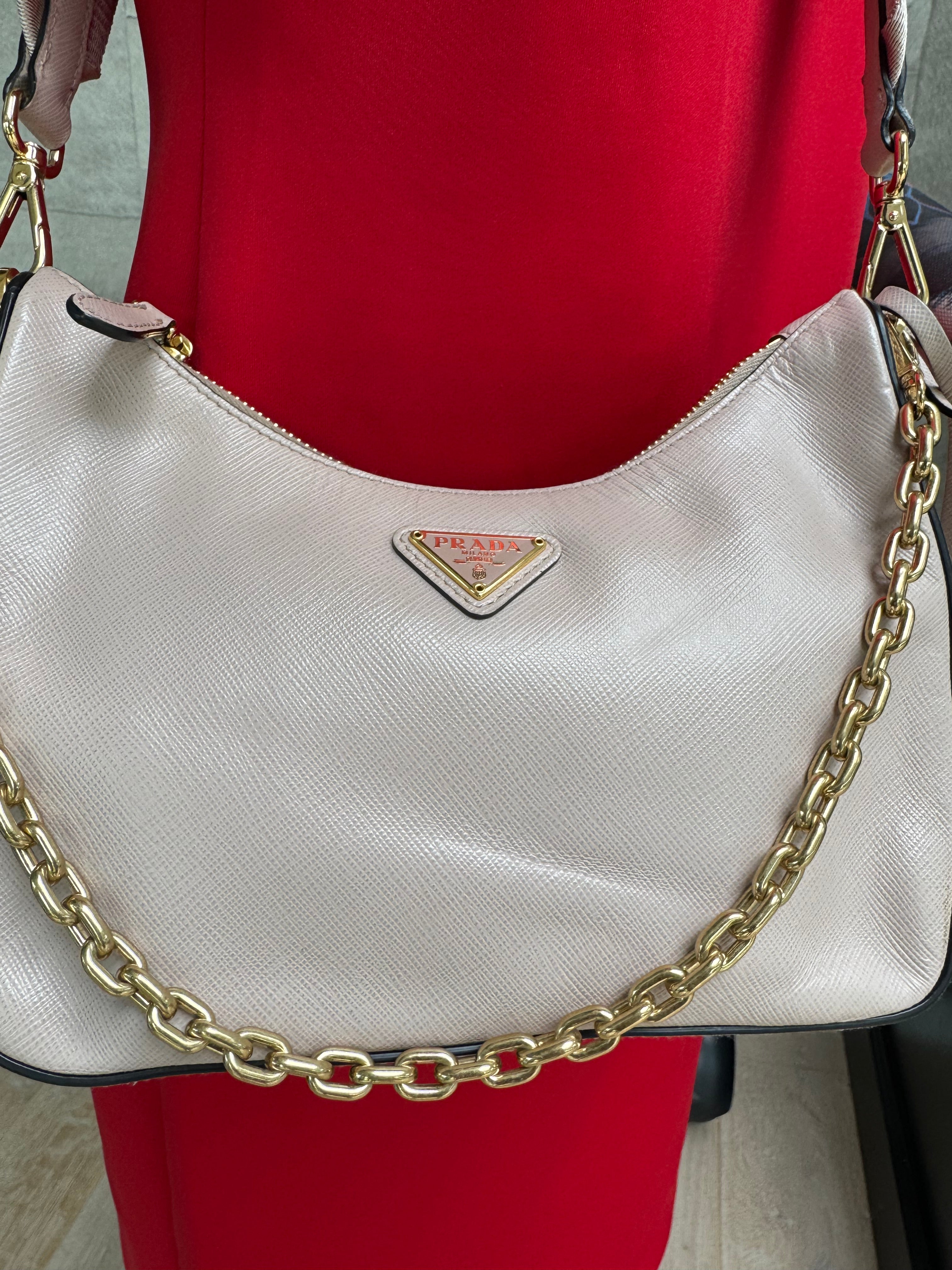 Brand:Prada Model:re edition Exterior material:saffiano leather Exterior colour:beige Print:plain Interior material:nylon Closure:zip Hardware tone:gold Type:crossbody/shoulder bag Accessories: Features:long adjustable crossbody...