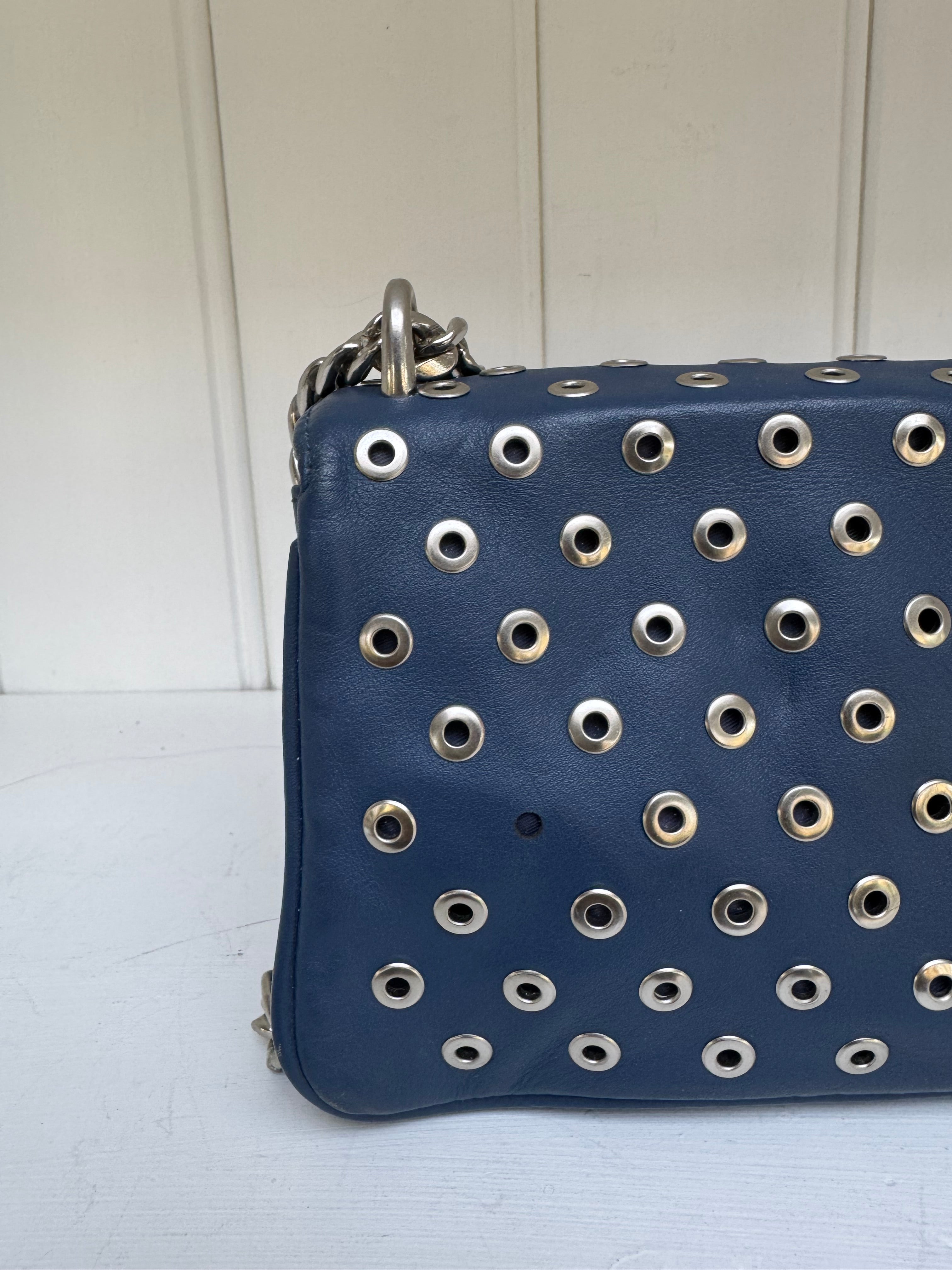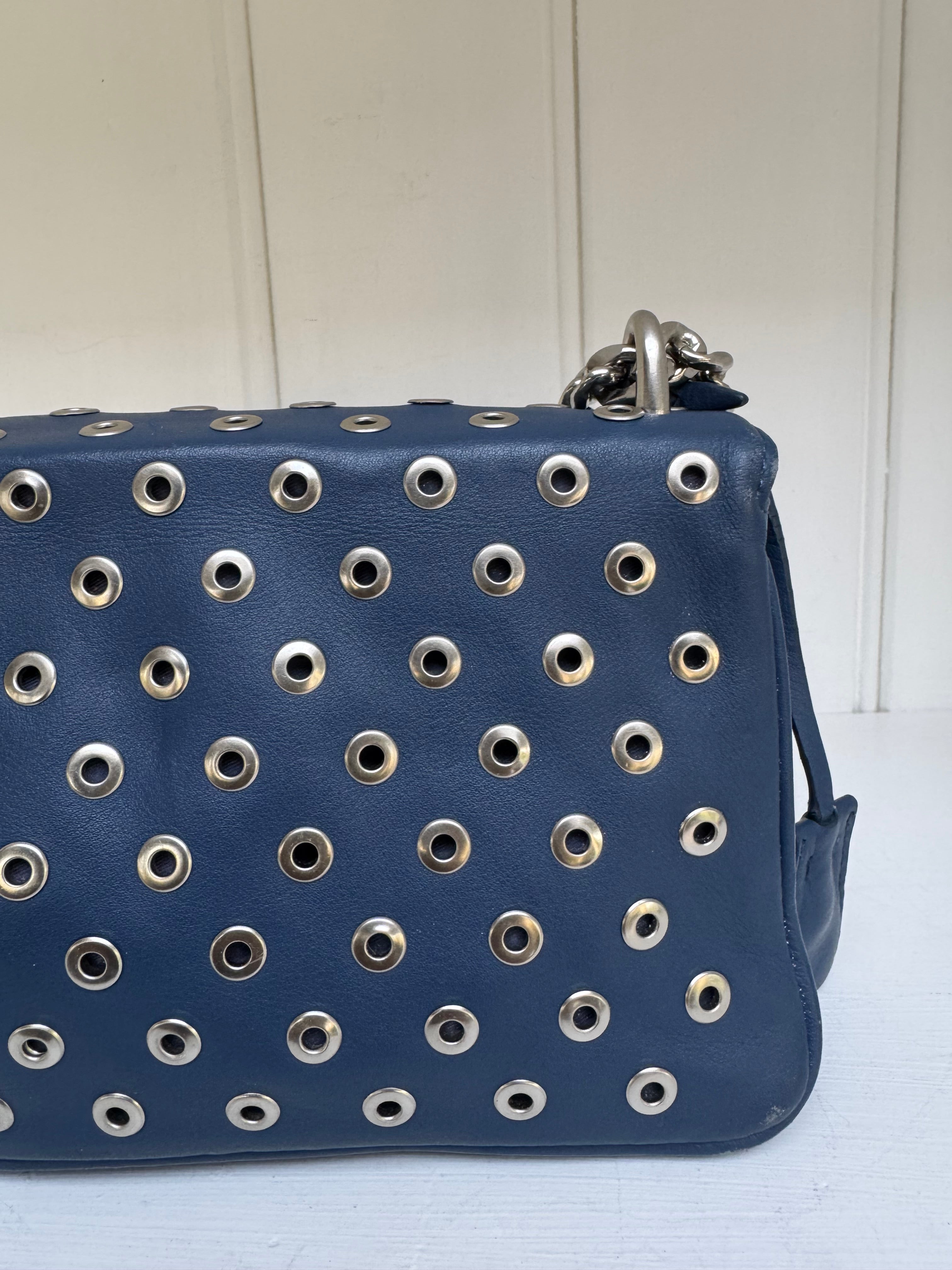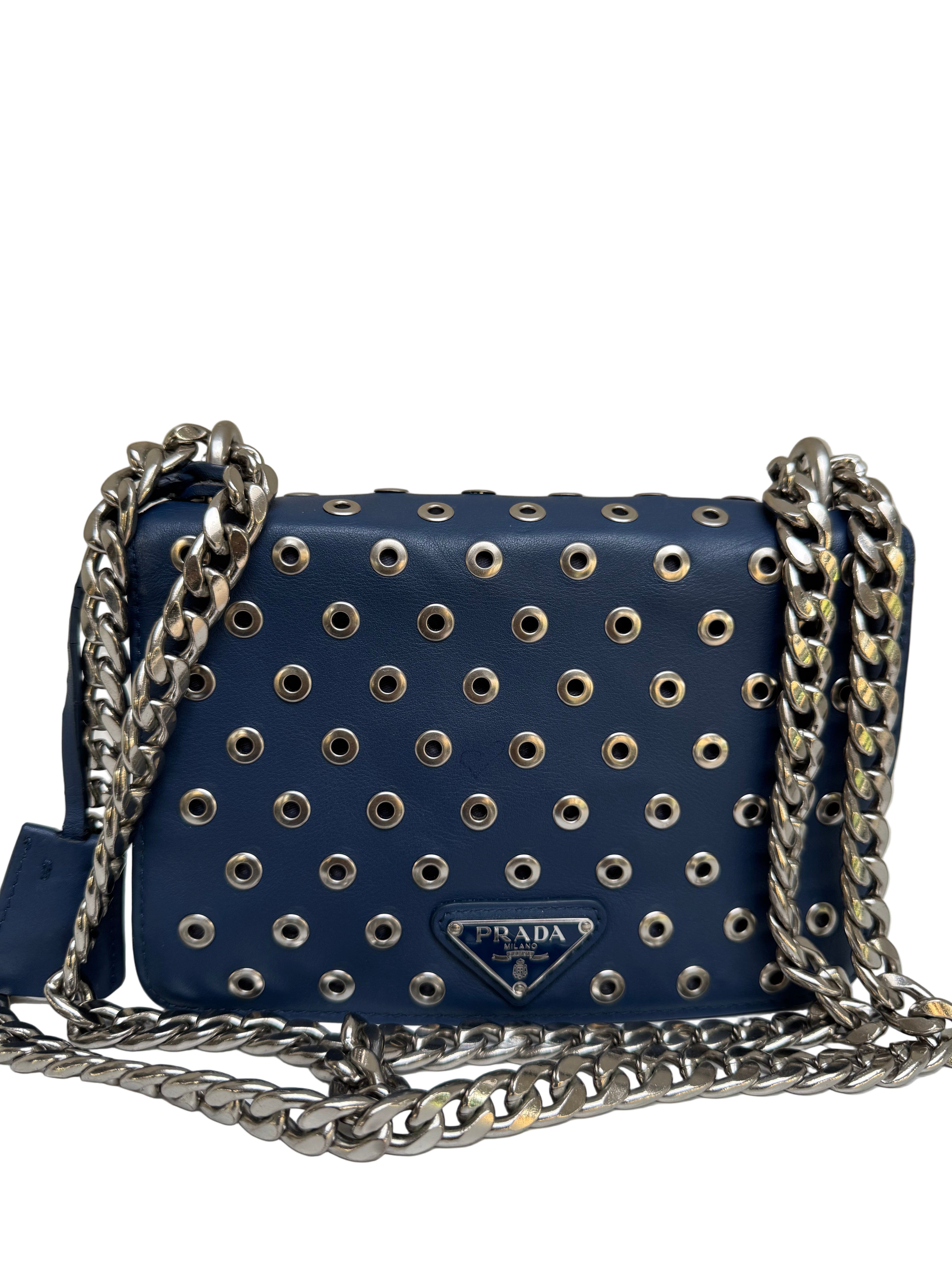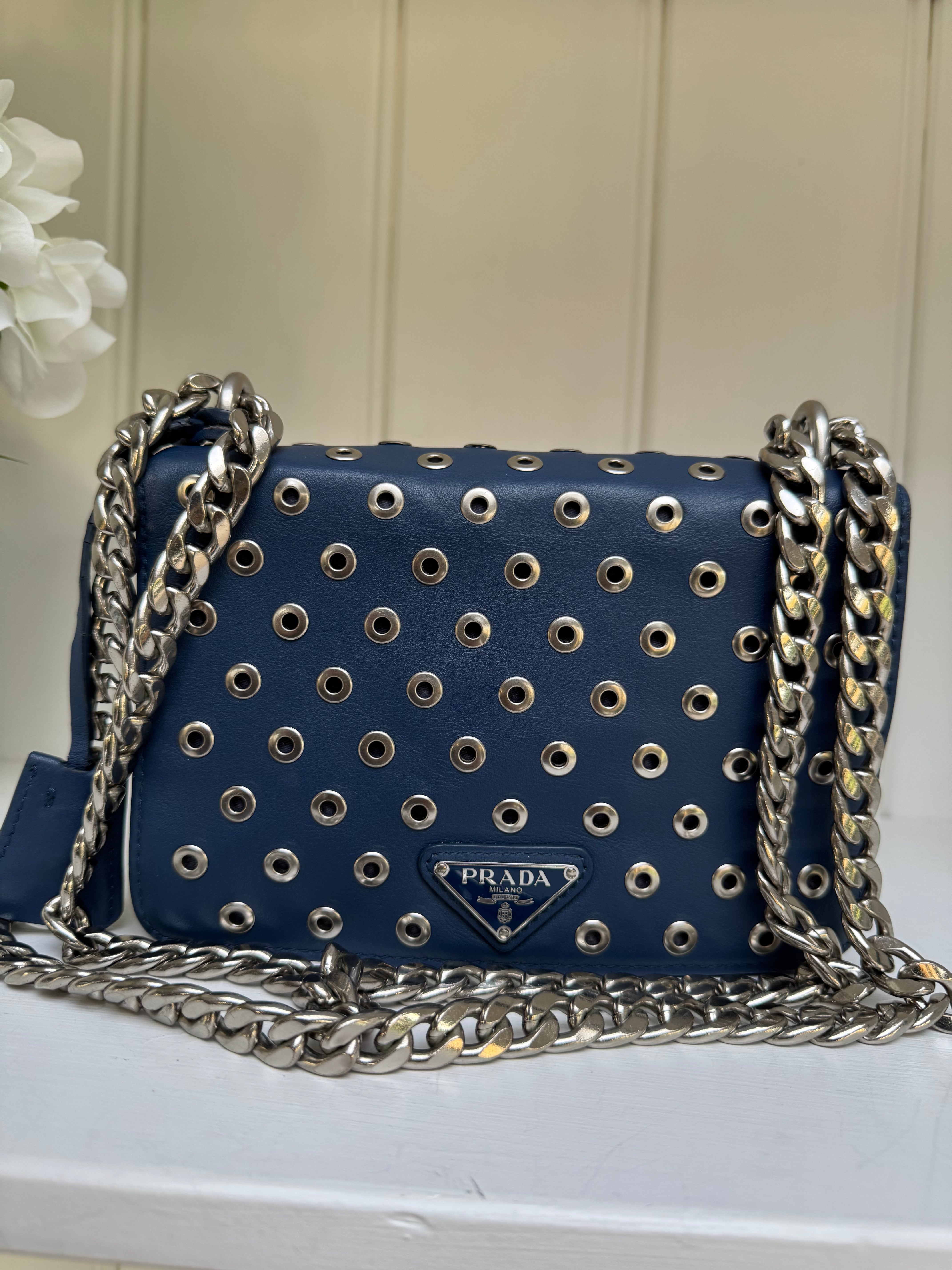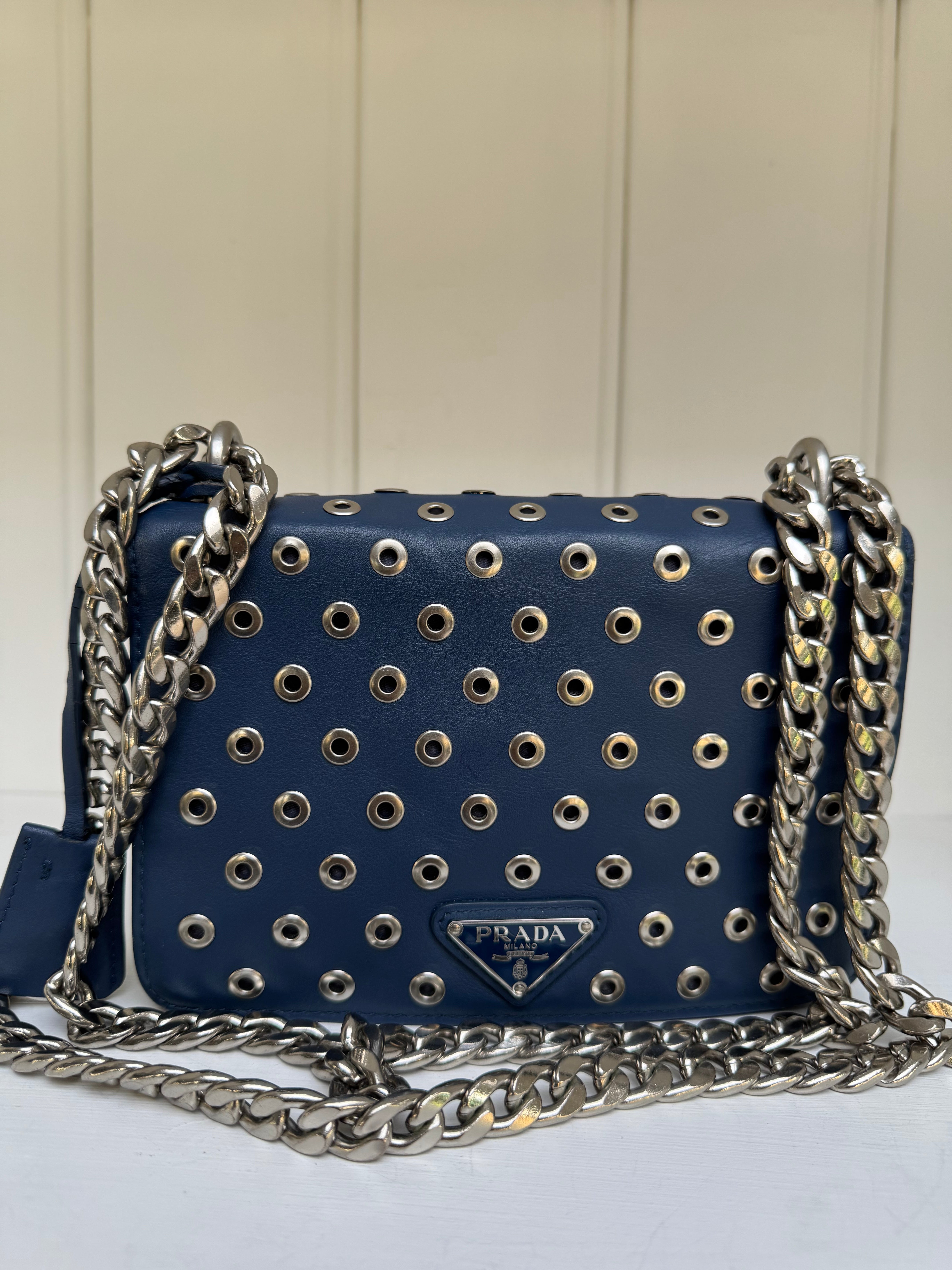 Brand:Prada Model:rivet crossbody Exterior material:leather Exterior colour:blue Print:plain Interior material:leather Closure:flap Hardware tone:silver Type:crossbody Accessories:chain strap Features: Serial number:present Condition:good...