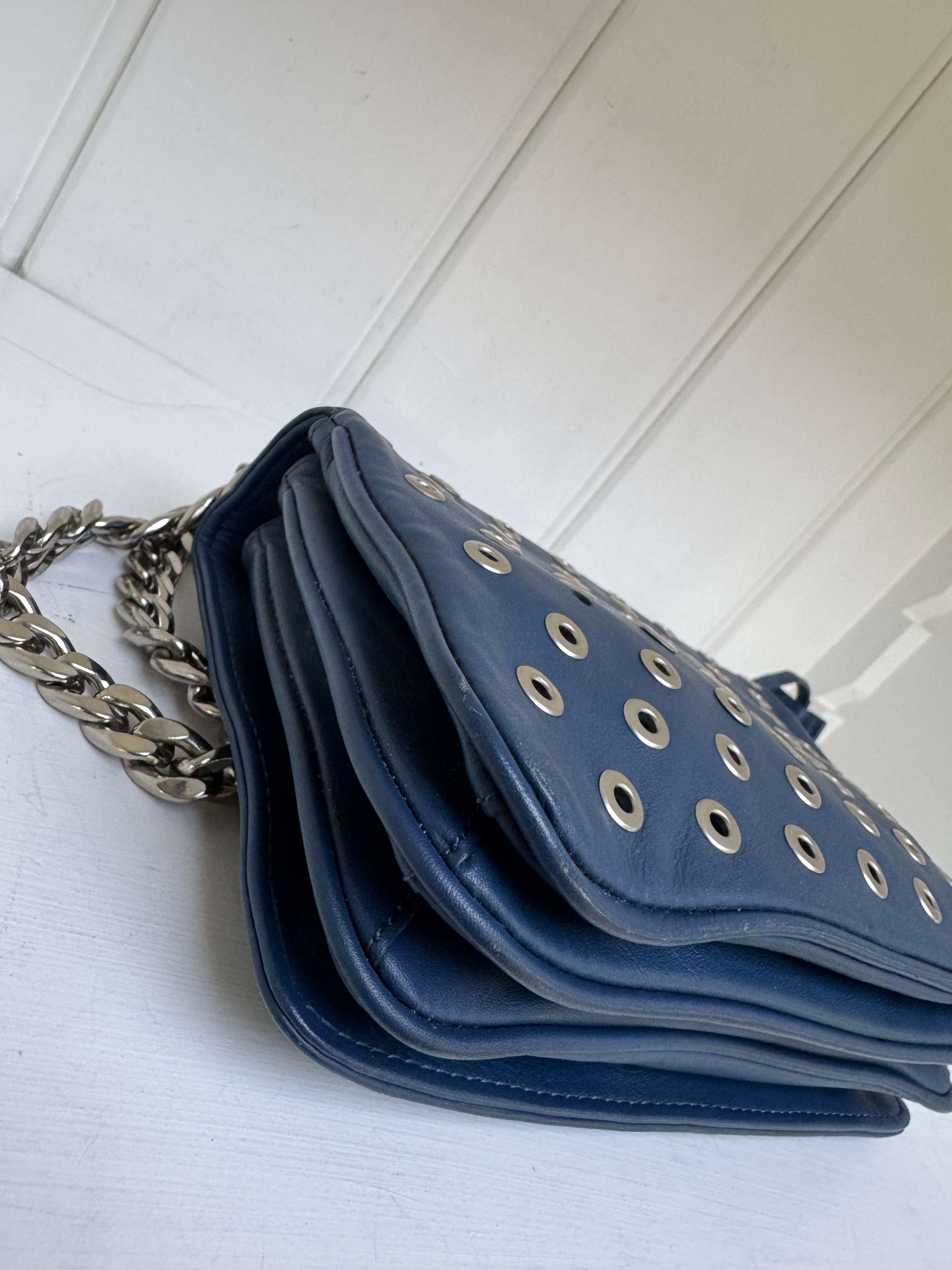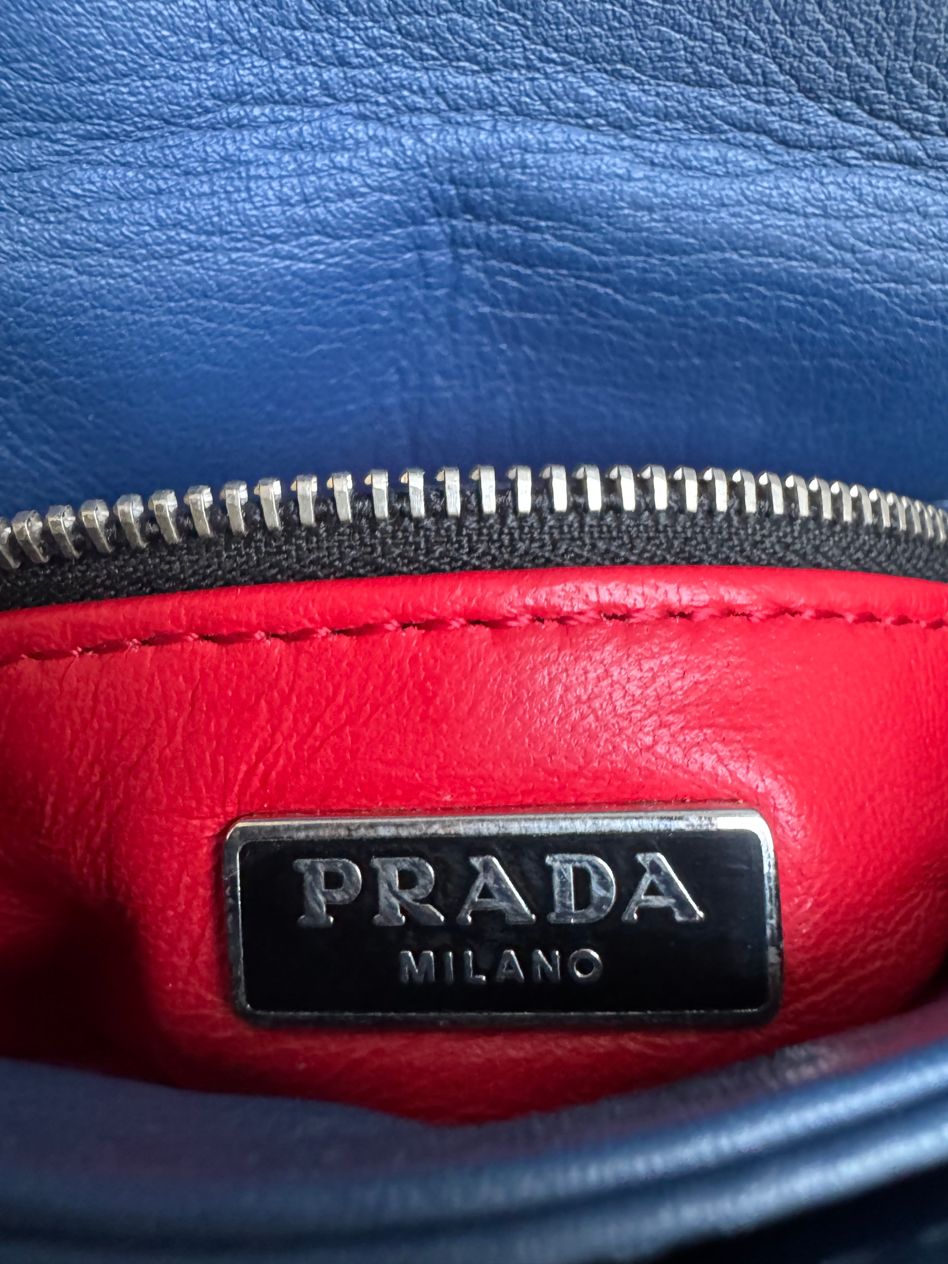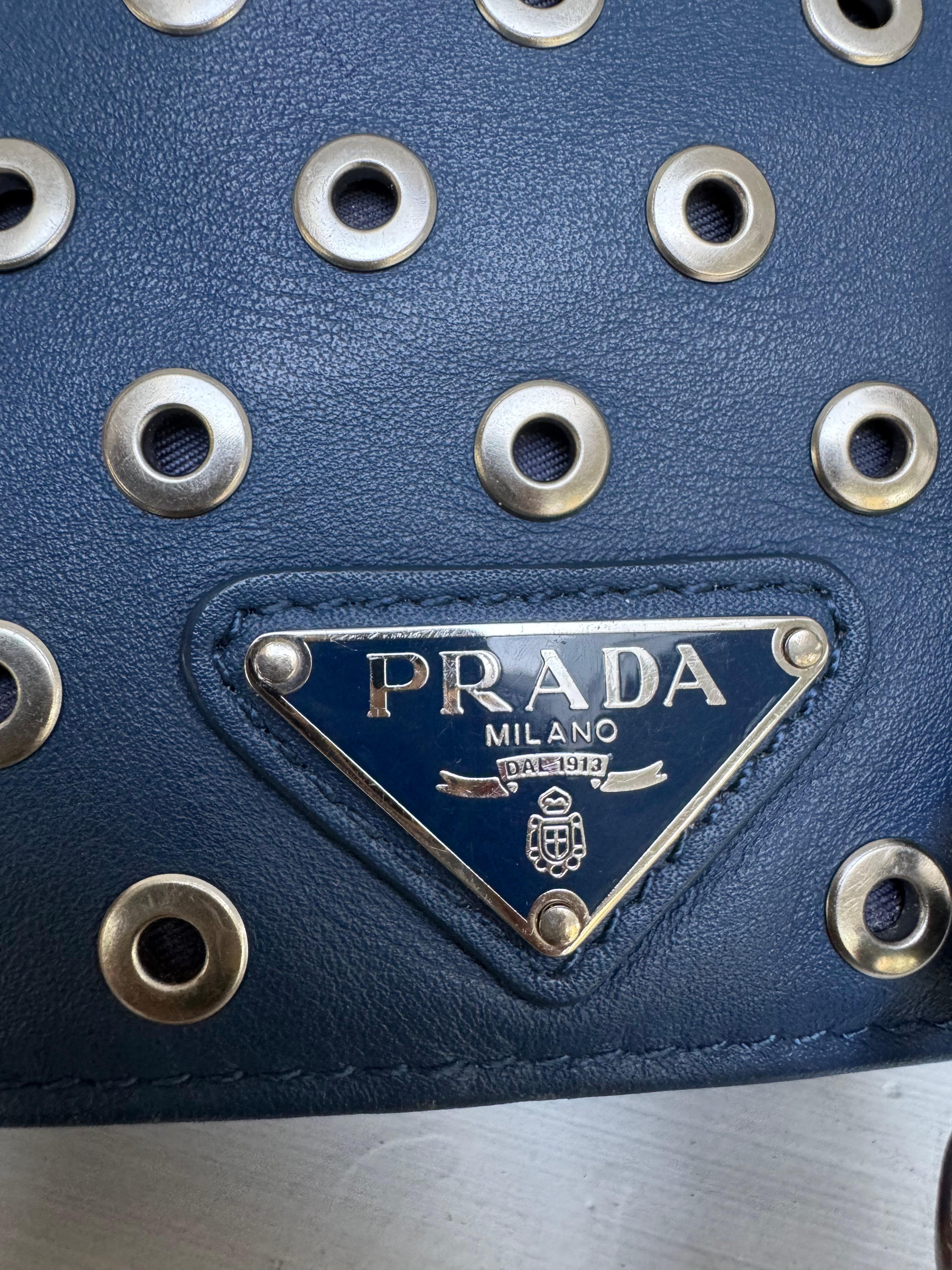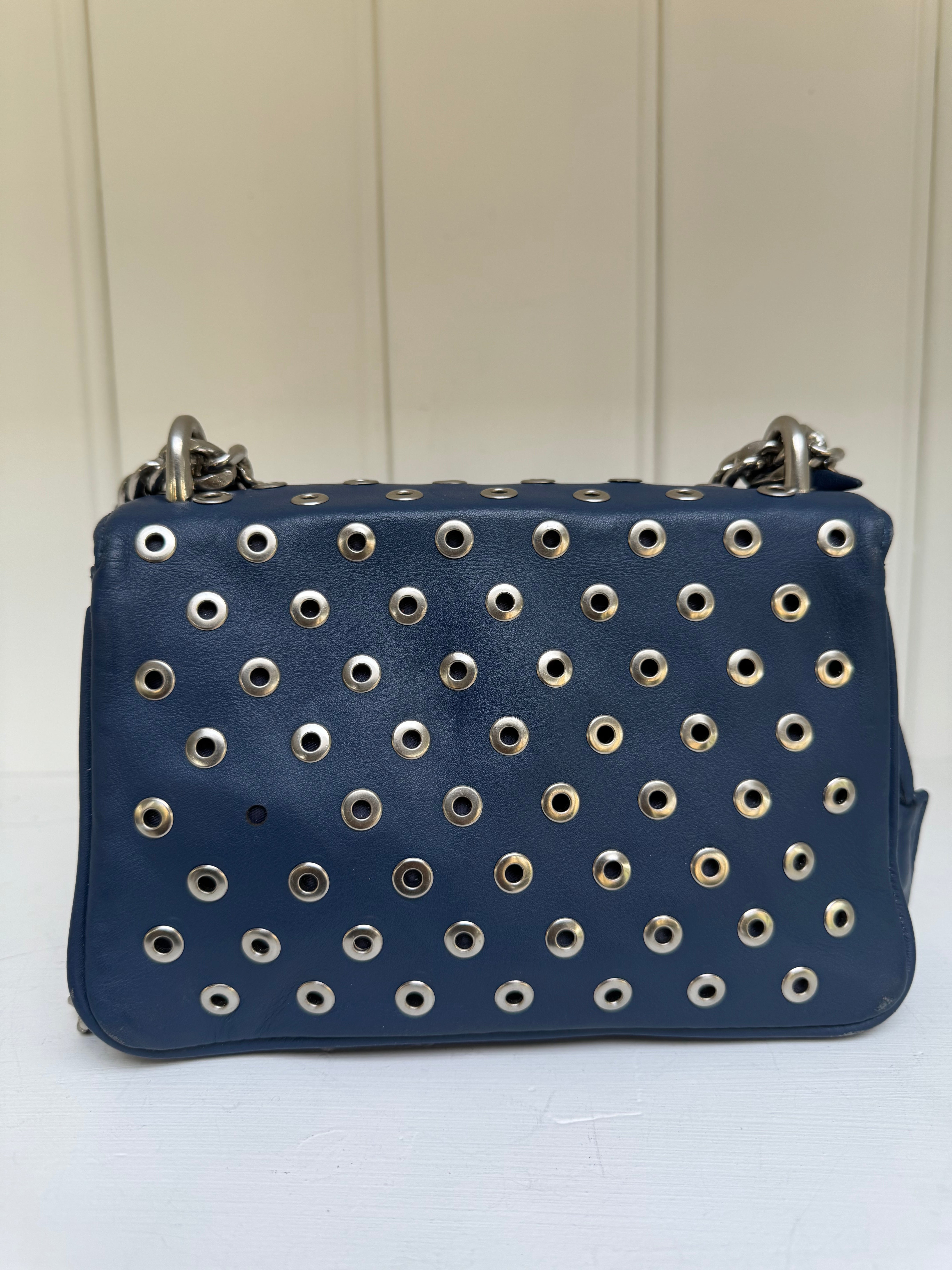 Brand:Prada Model:rivet crossbody Exterior material:leather Exterior colour:blue Print:plain Interior material:leather Closure:flap Hardware tone:silver Type:crossbody Accessories:chain strap Features: Serial number:present Condition:good...