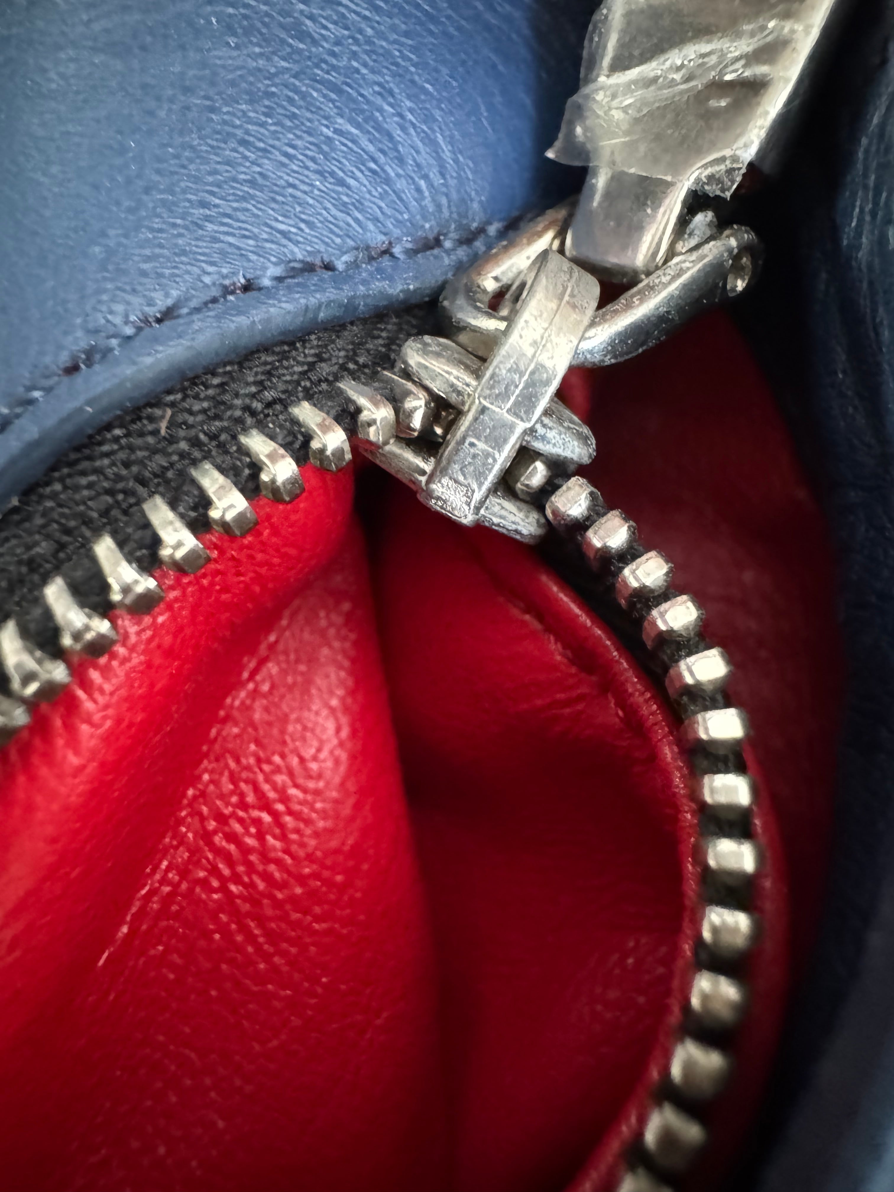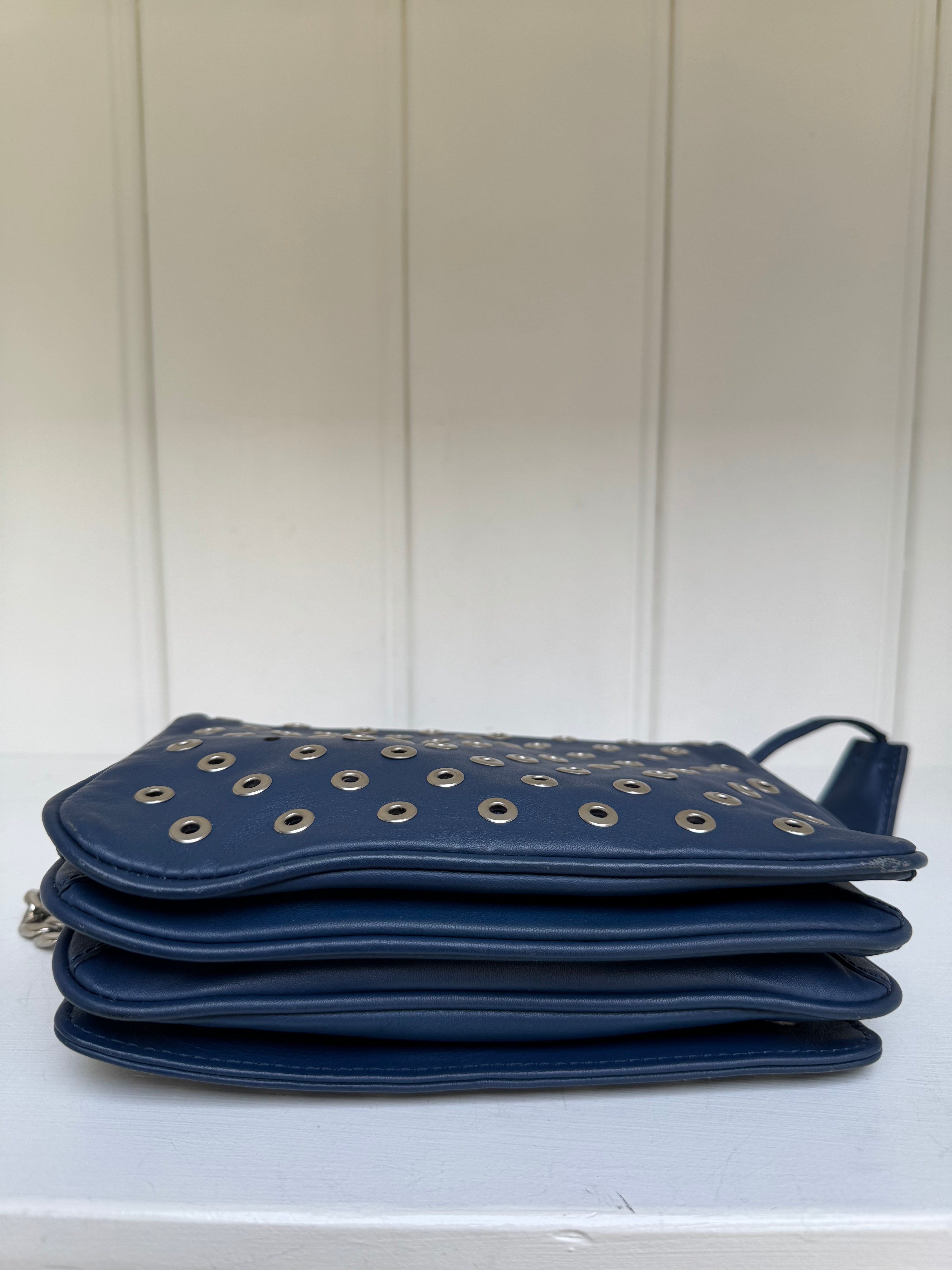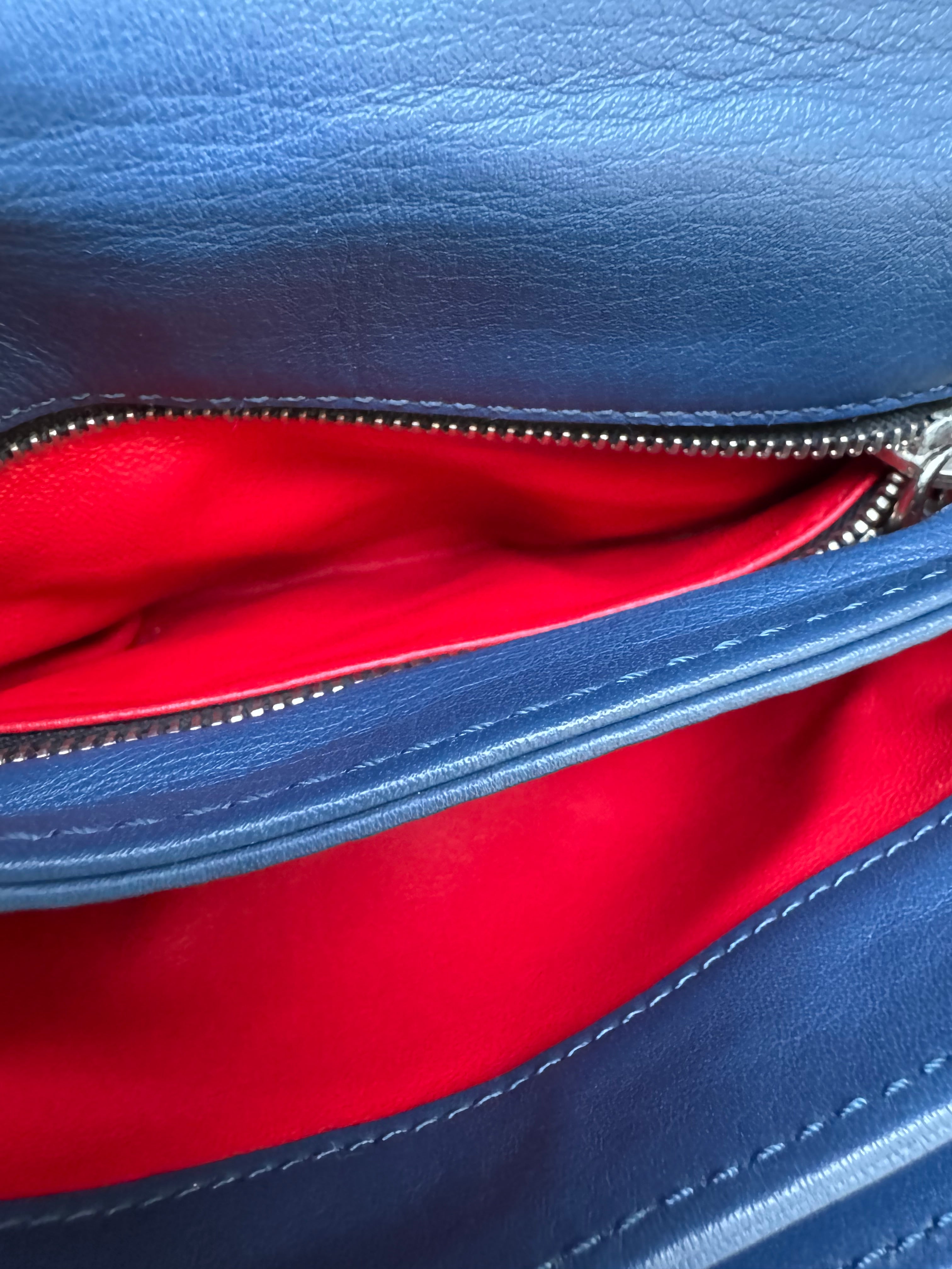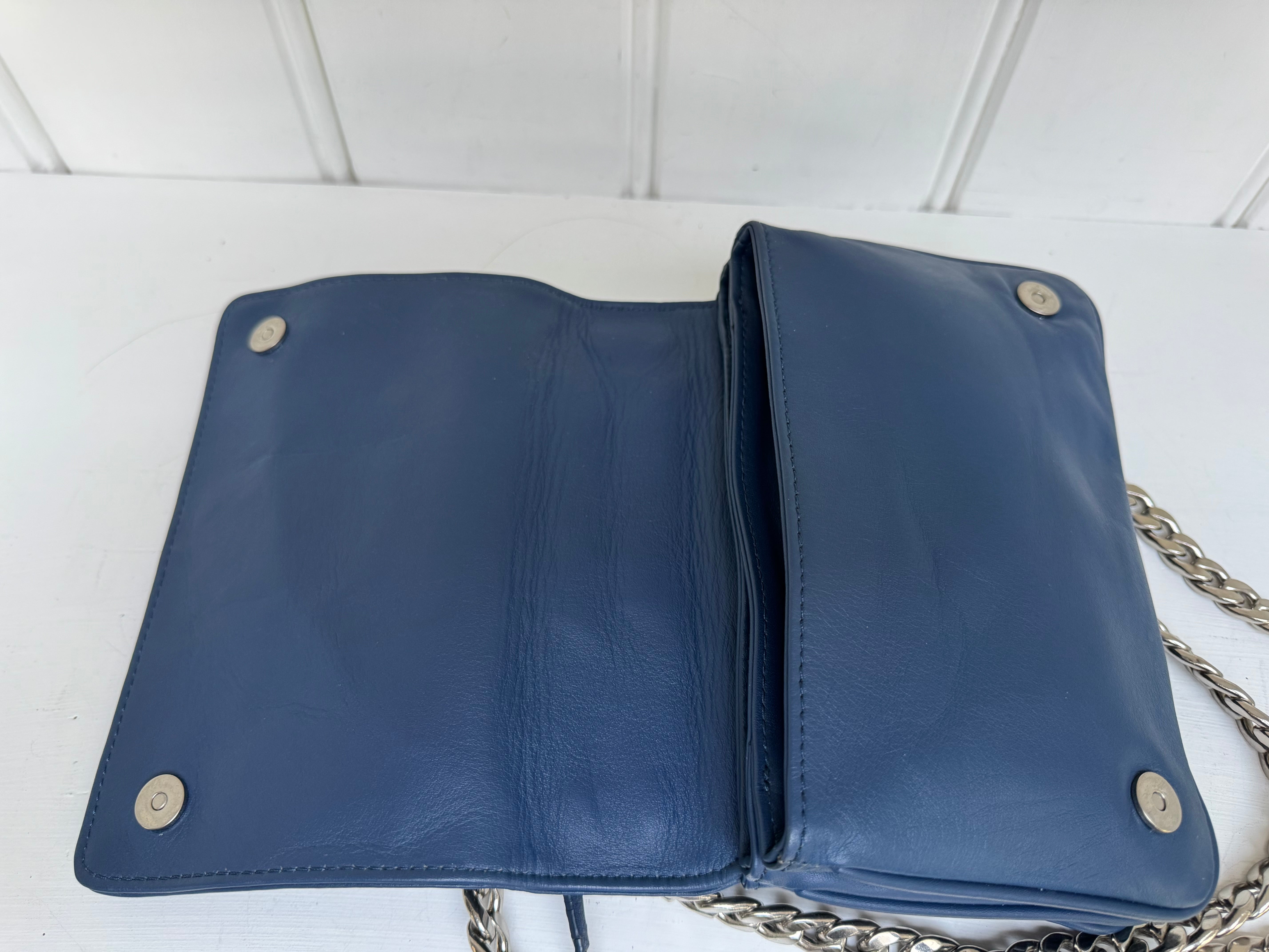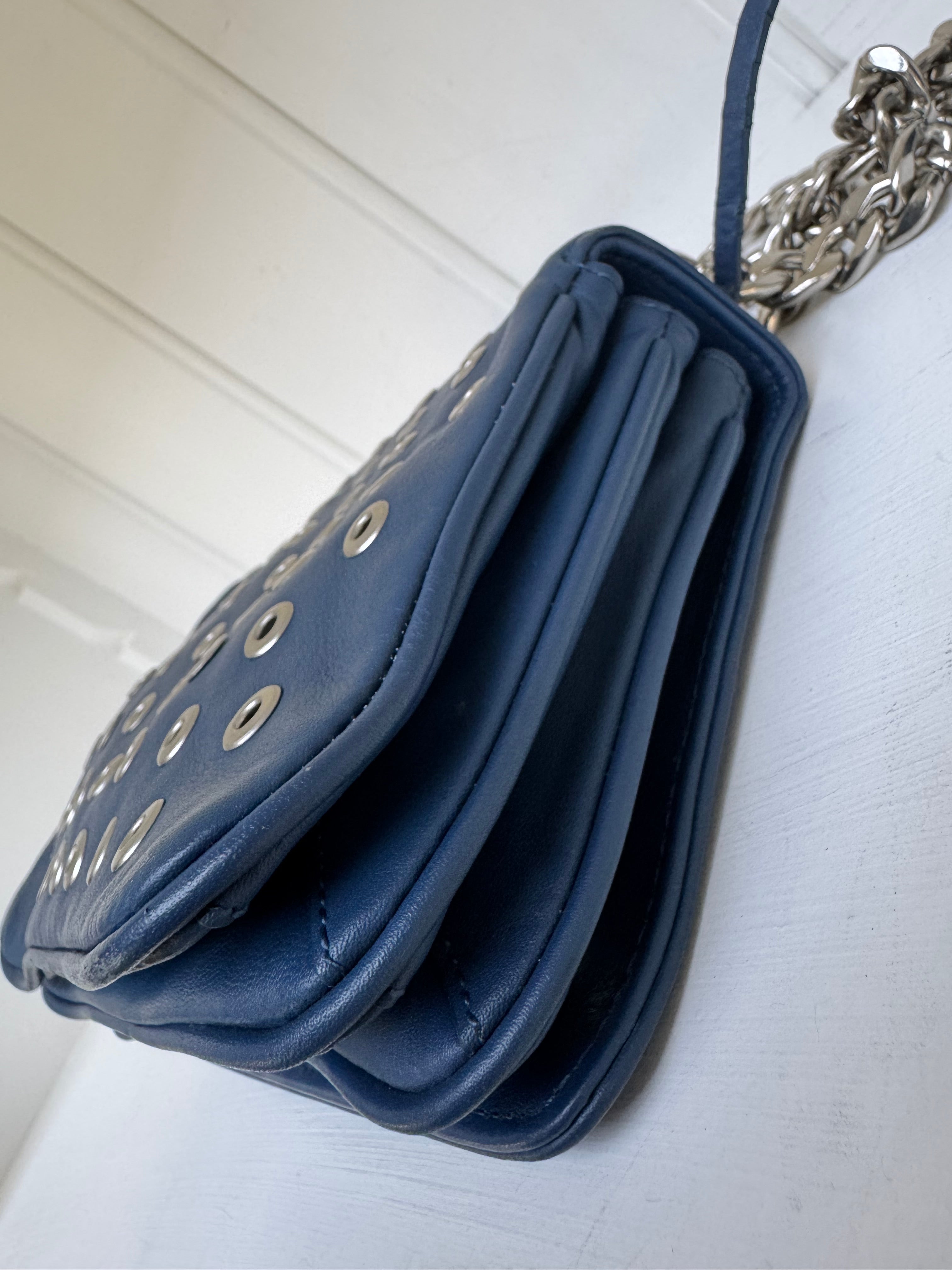 Brand:Prada Model:rivet crossbody Exterior material:leather Exterior colour:blue Print:plain Interior material:leather Closure:flap Hardware tone:silver Type:crossbody Accessories:chain strap Features: Serial number:present Condition:good...