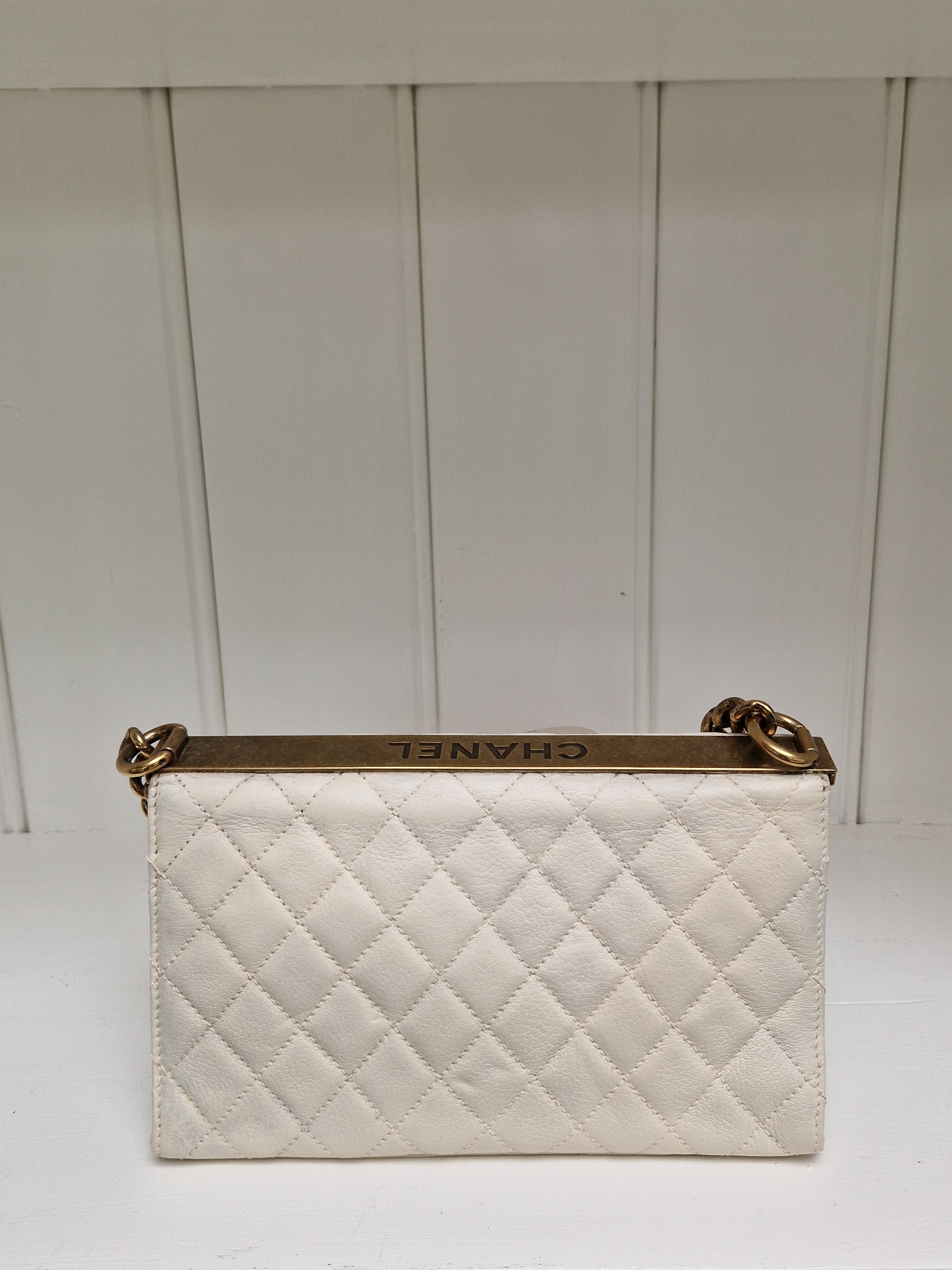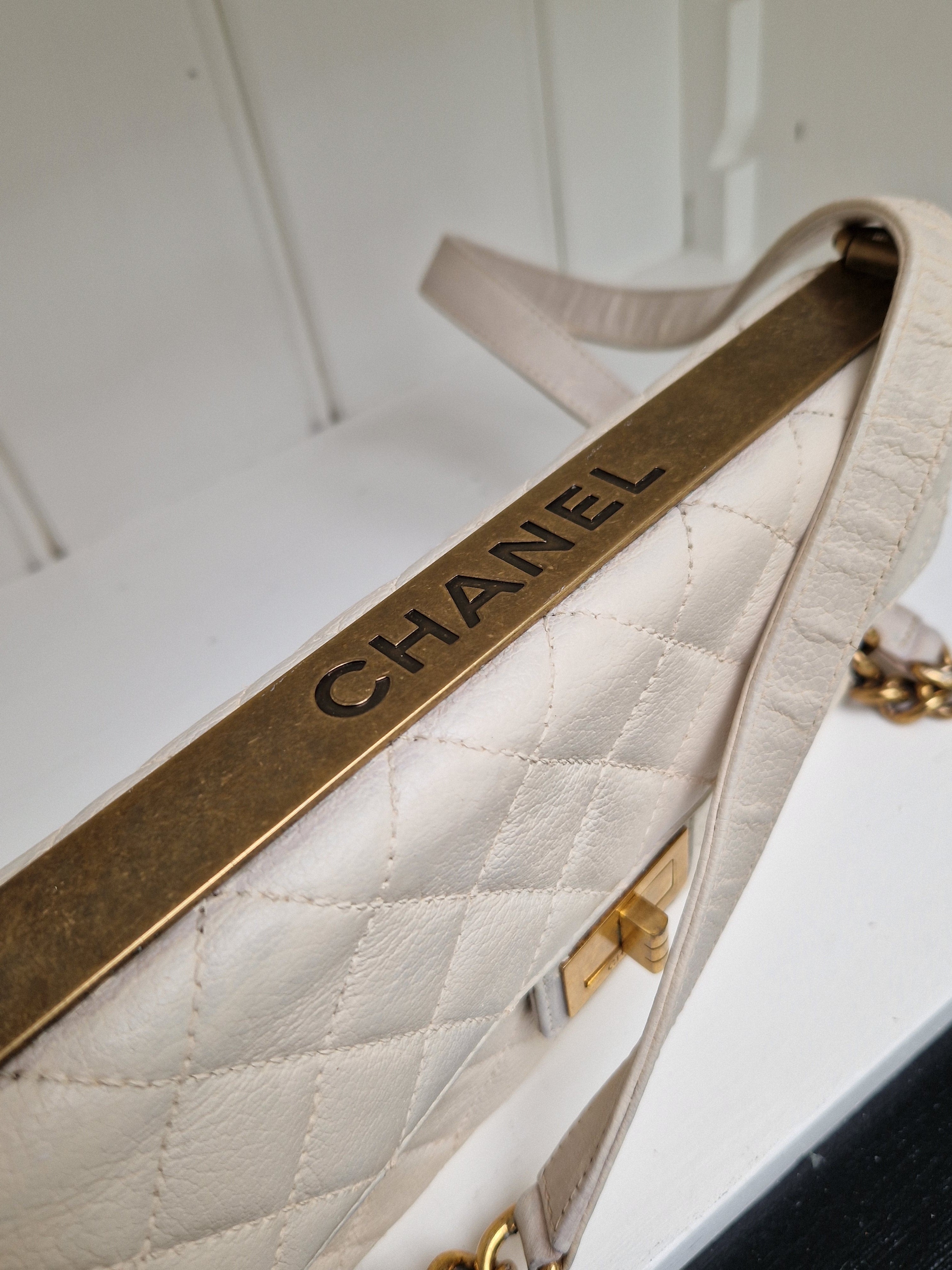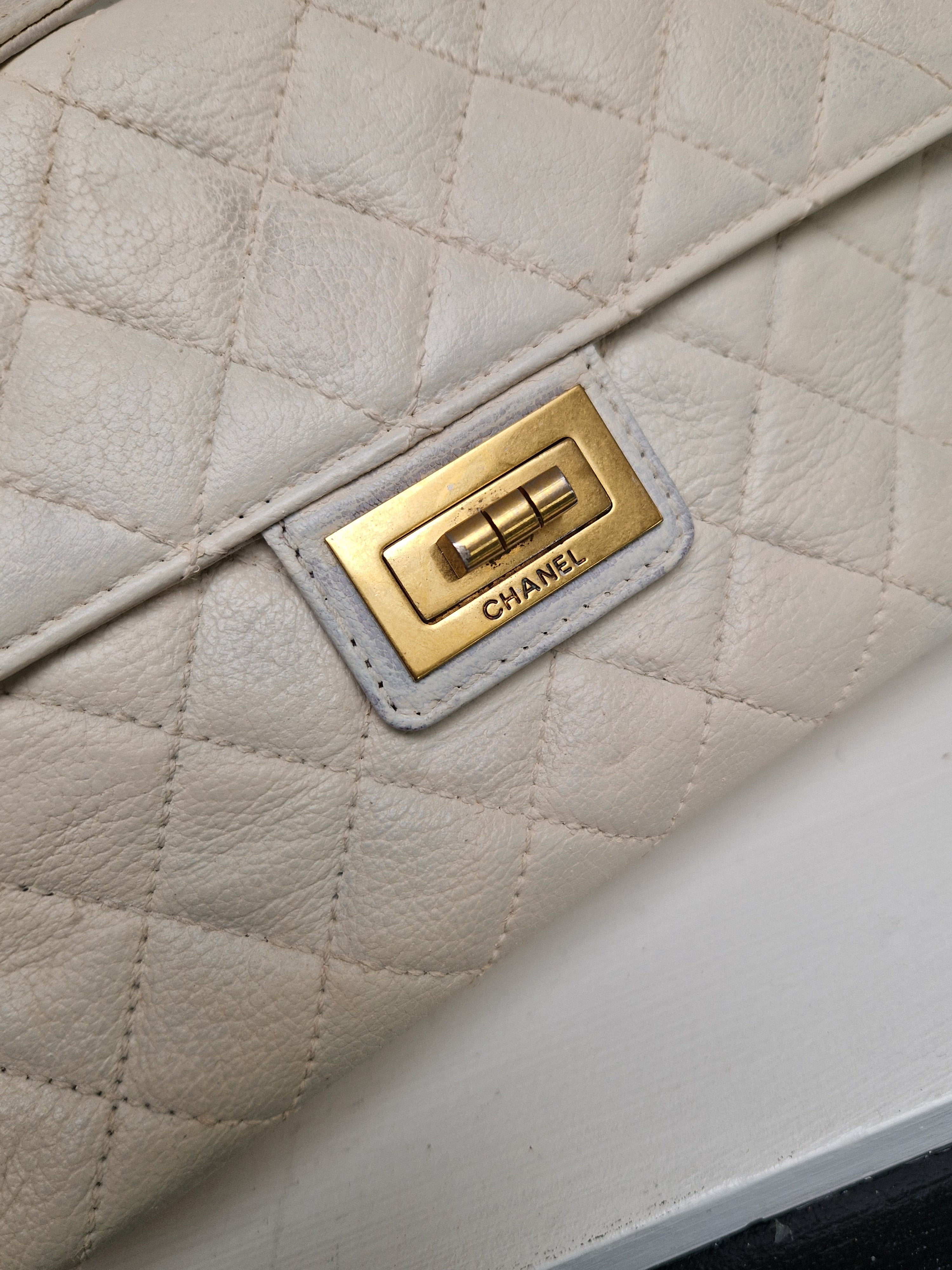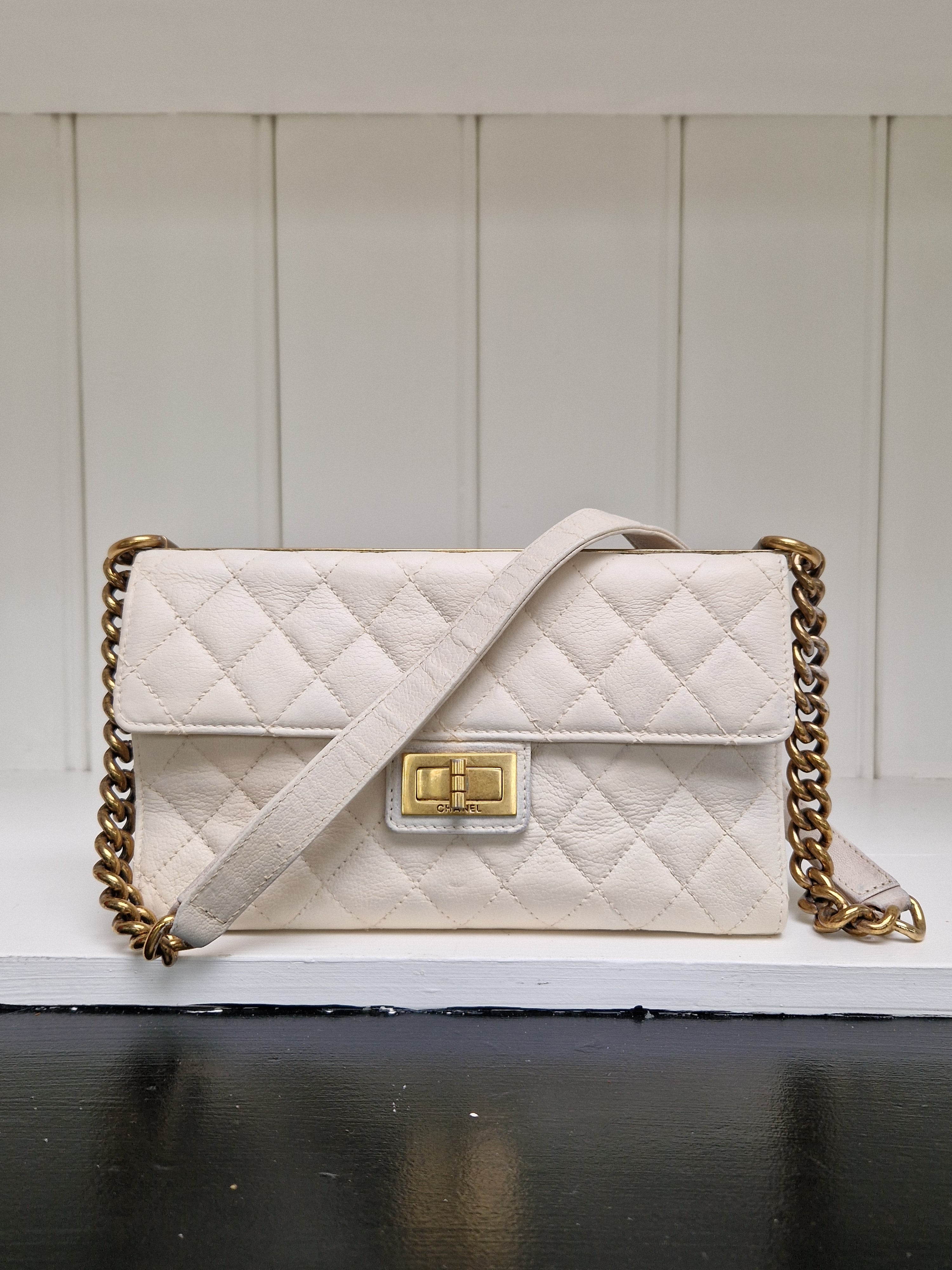 Brand:Chanel Model:re issue  Exterior material:leather Exterior colour:white Print:plain Interior material:fabric Closure:twist lock Hardware tone:gold Type:crossbody  Accessories: Features:long chain strap can... Read more Read more