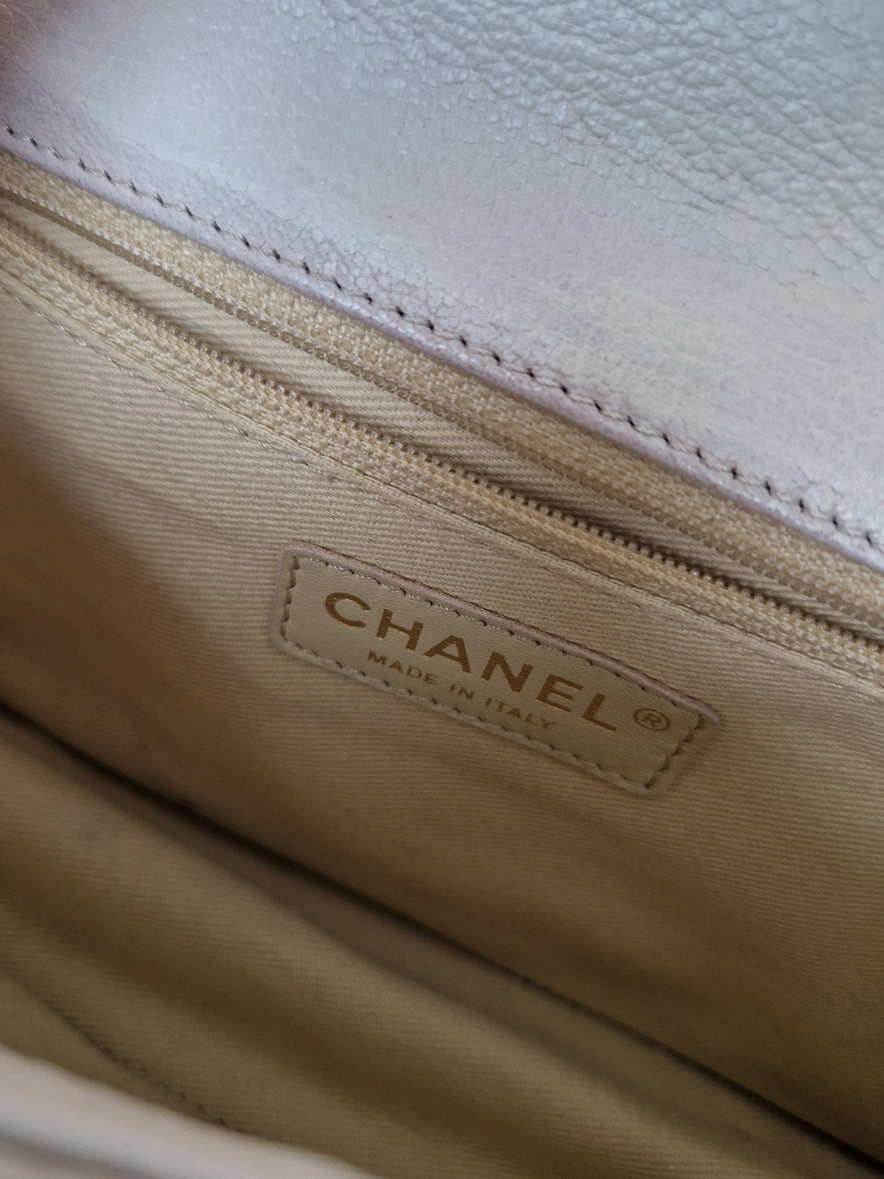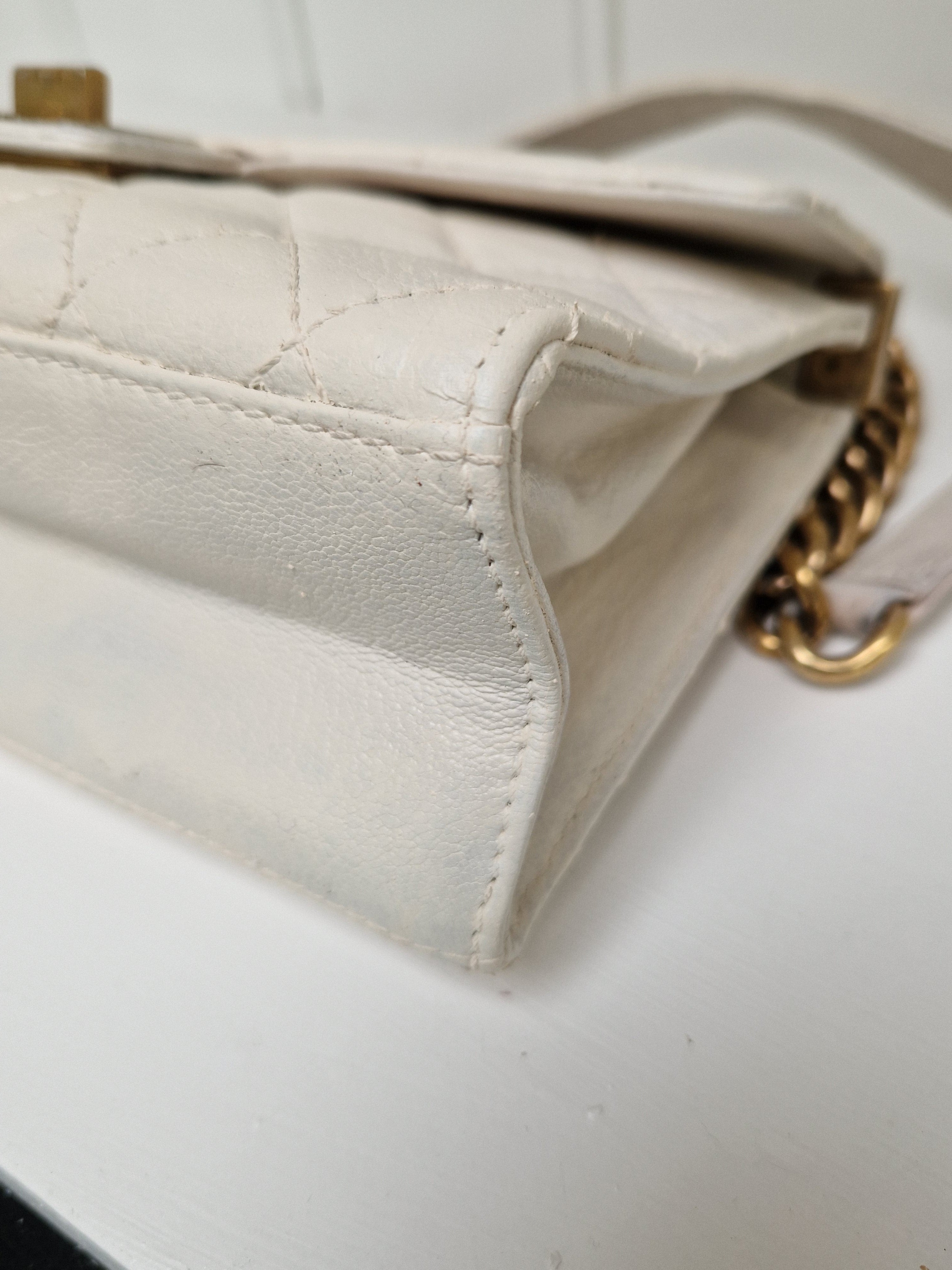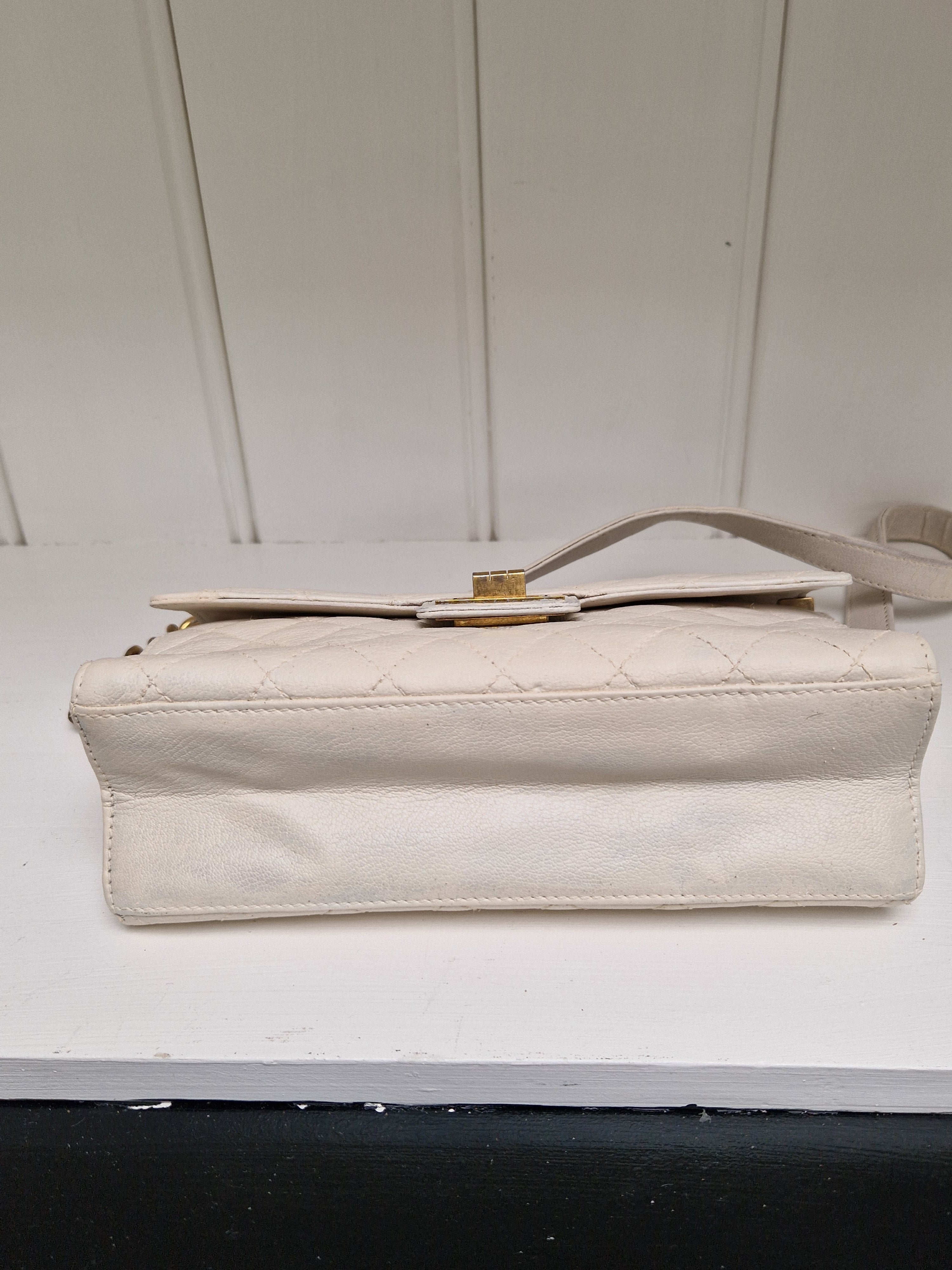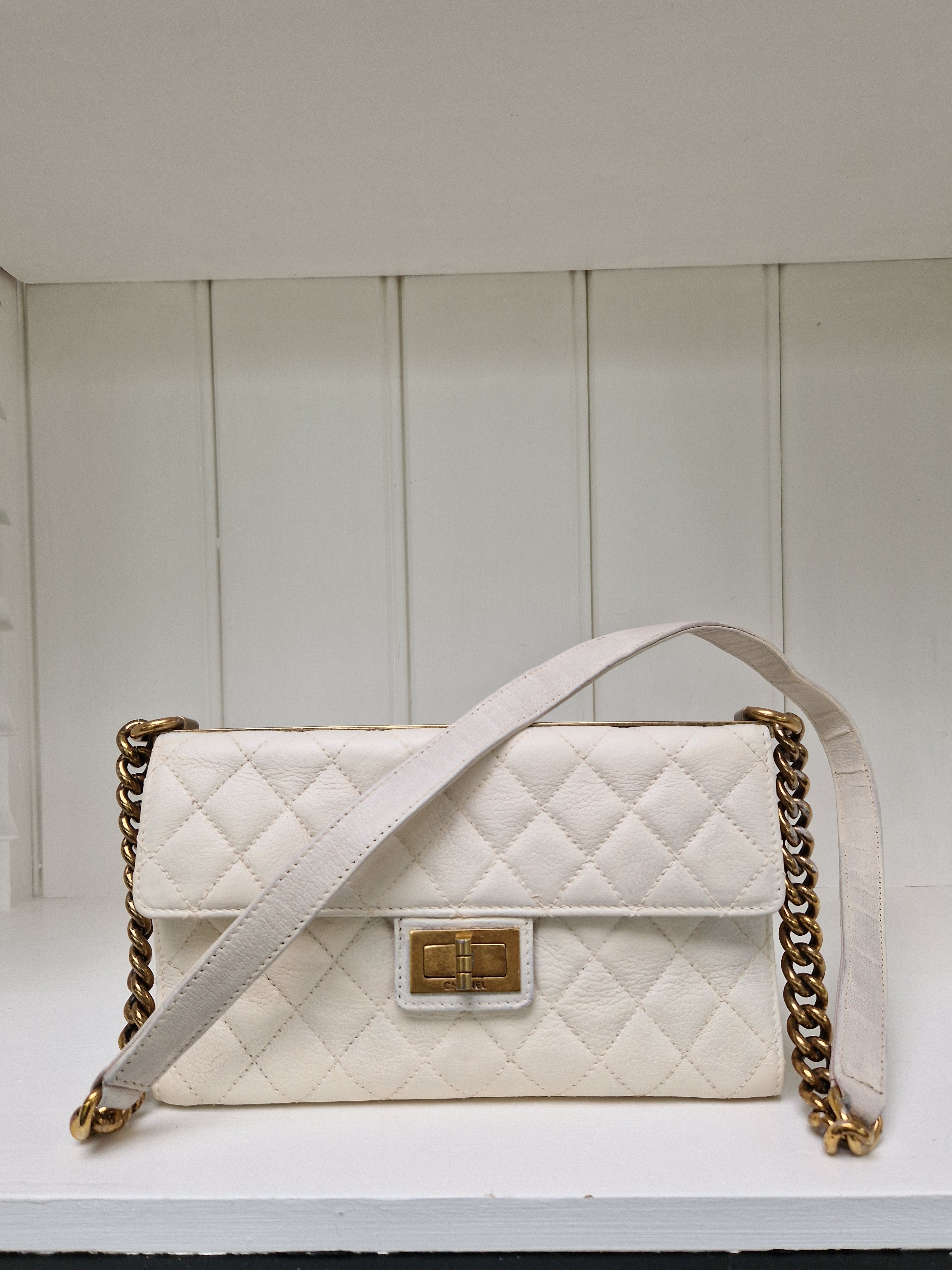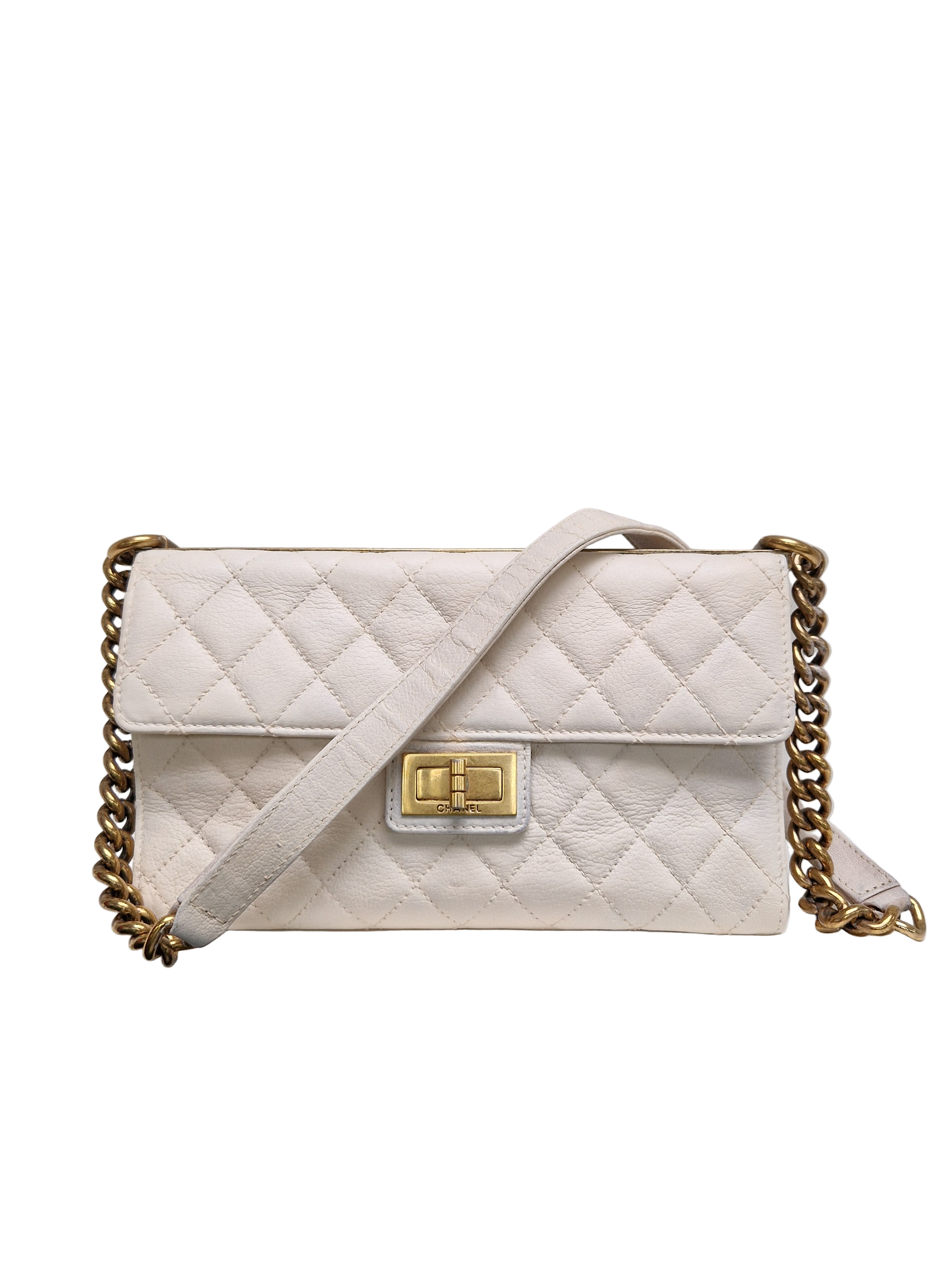 Brand:Chanel Model:re issue  Exterior material:leather Exterior colour:white Print:plain Interior material:fabric Closure:twist lock Hardware tone:gold Type:crossbody  Accessories: Features:long chain strap can... Read more Read more