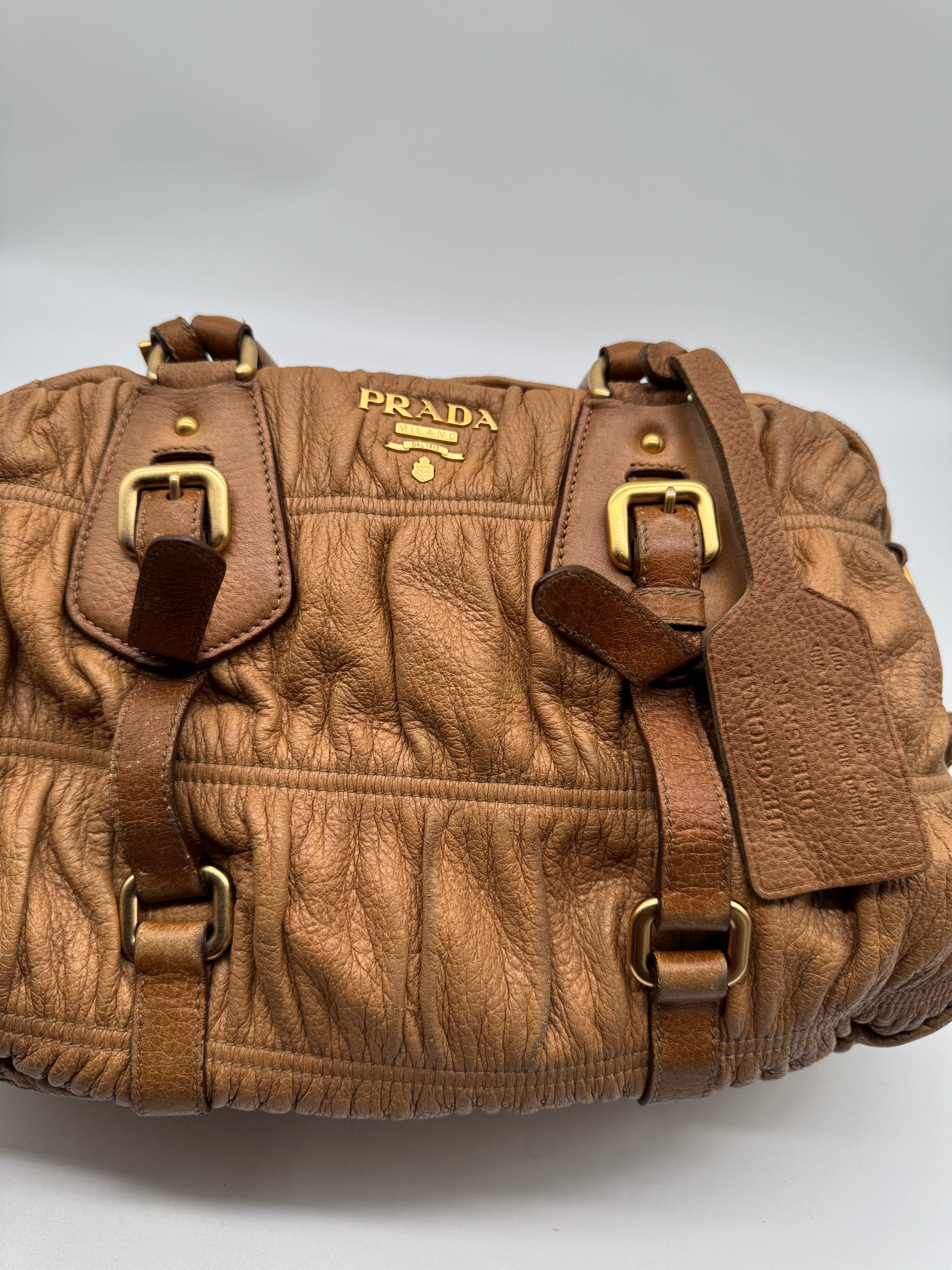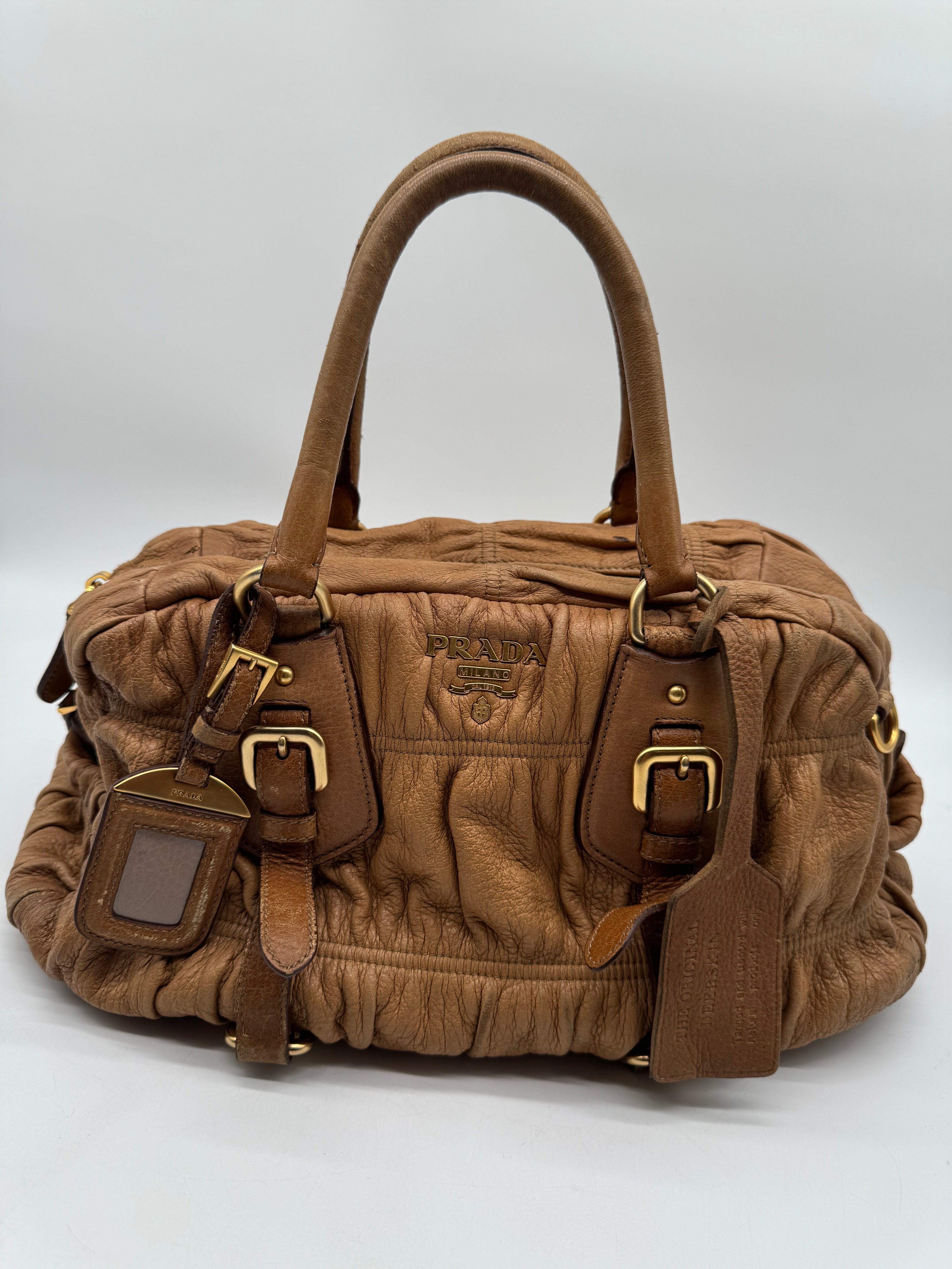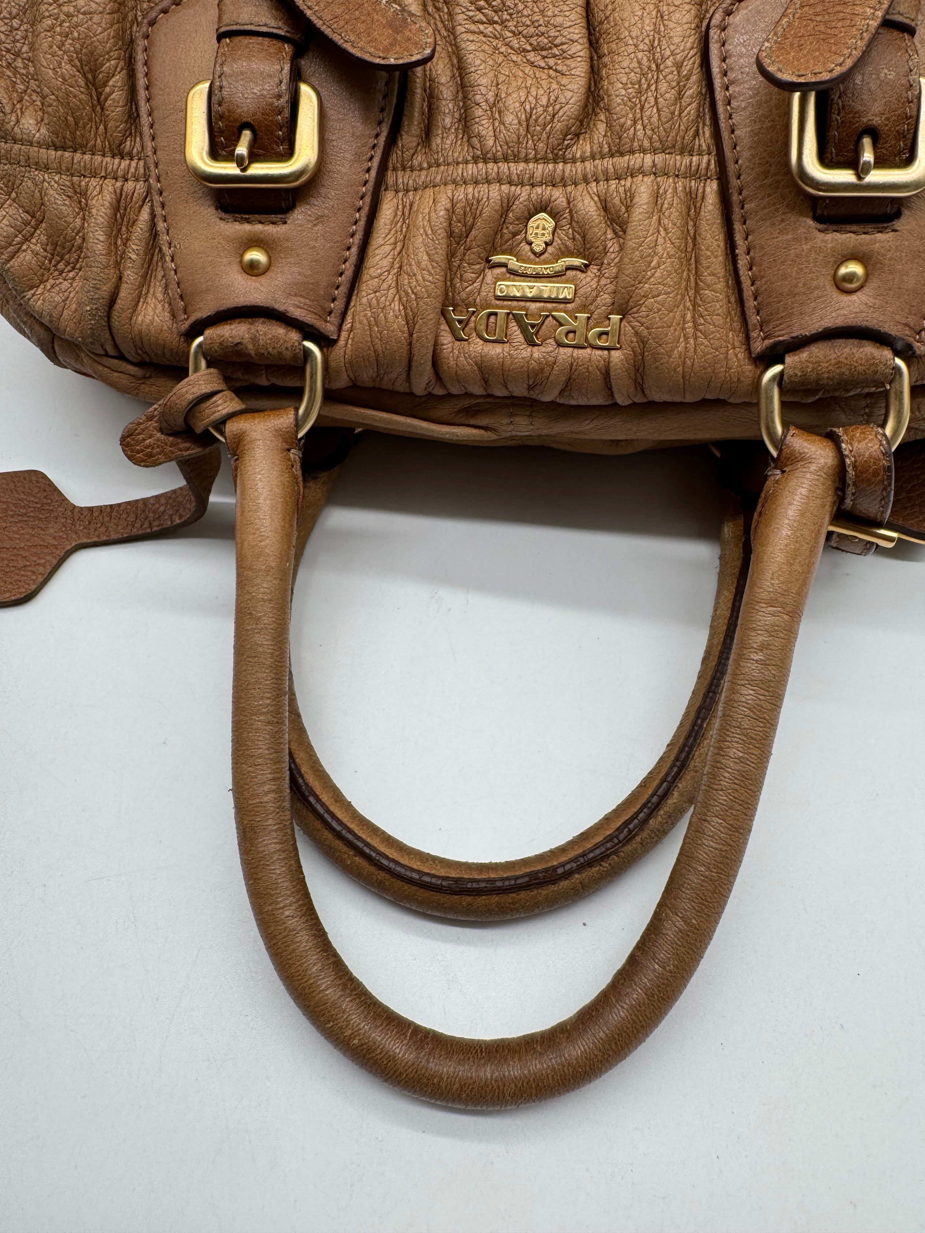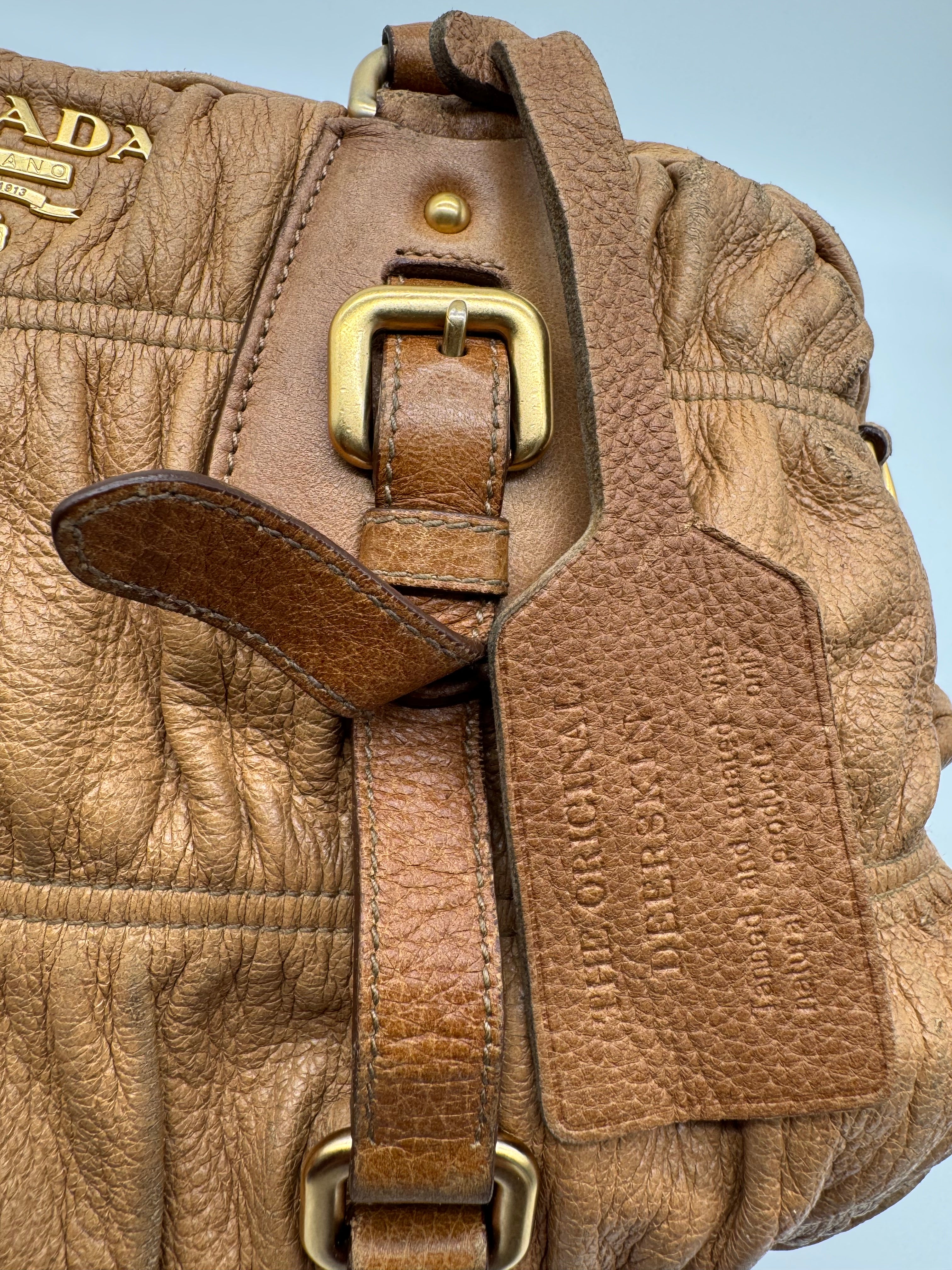 Brand:Prada Model:deer skin gathered leather bag Exterior material:leather Exterior colour:camel Print:plain Interior material:nylon Closure:zip Hardware tone:gold Type:shoulder bag Accessories: Features:a... Read more Read more