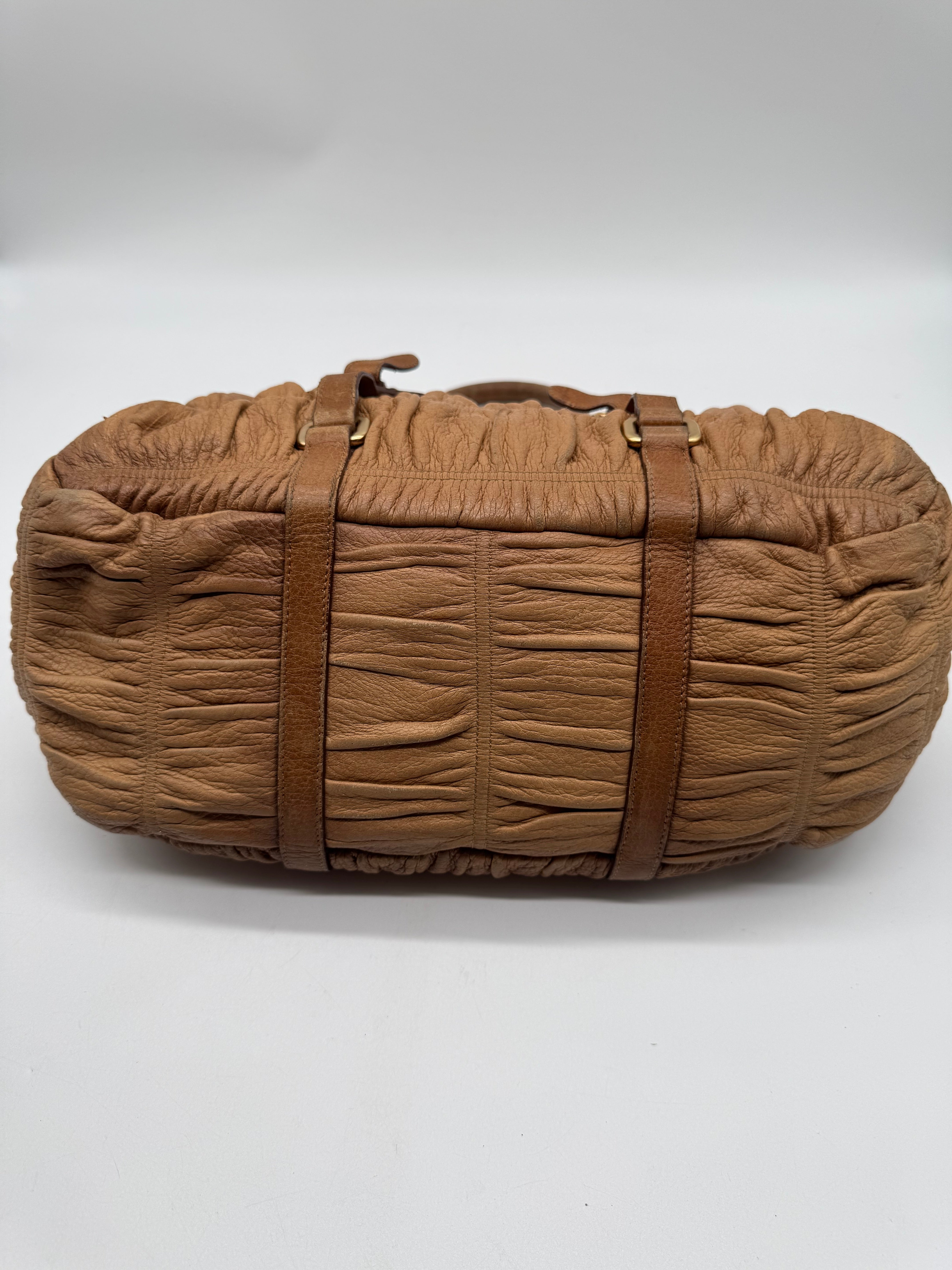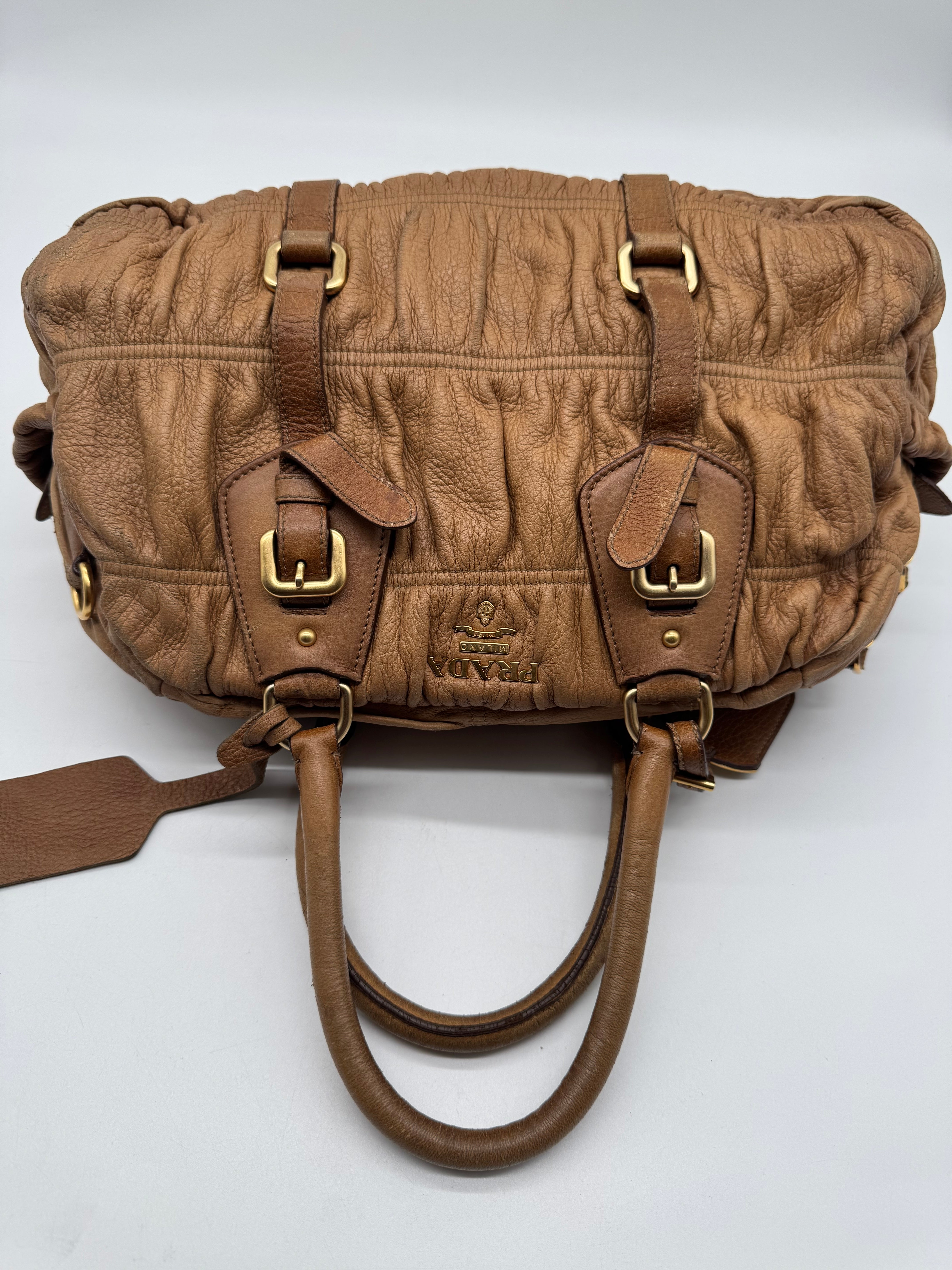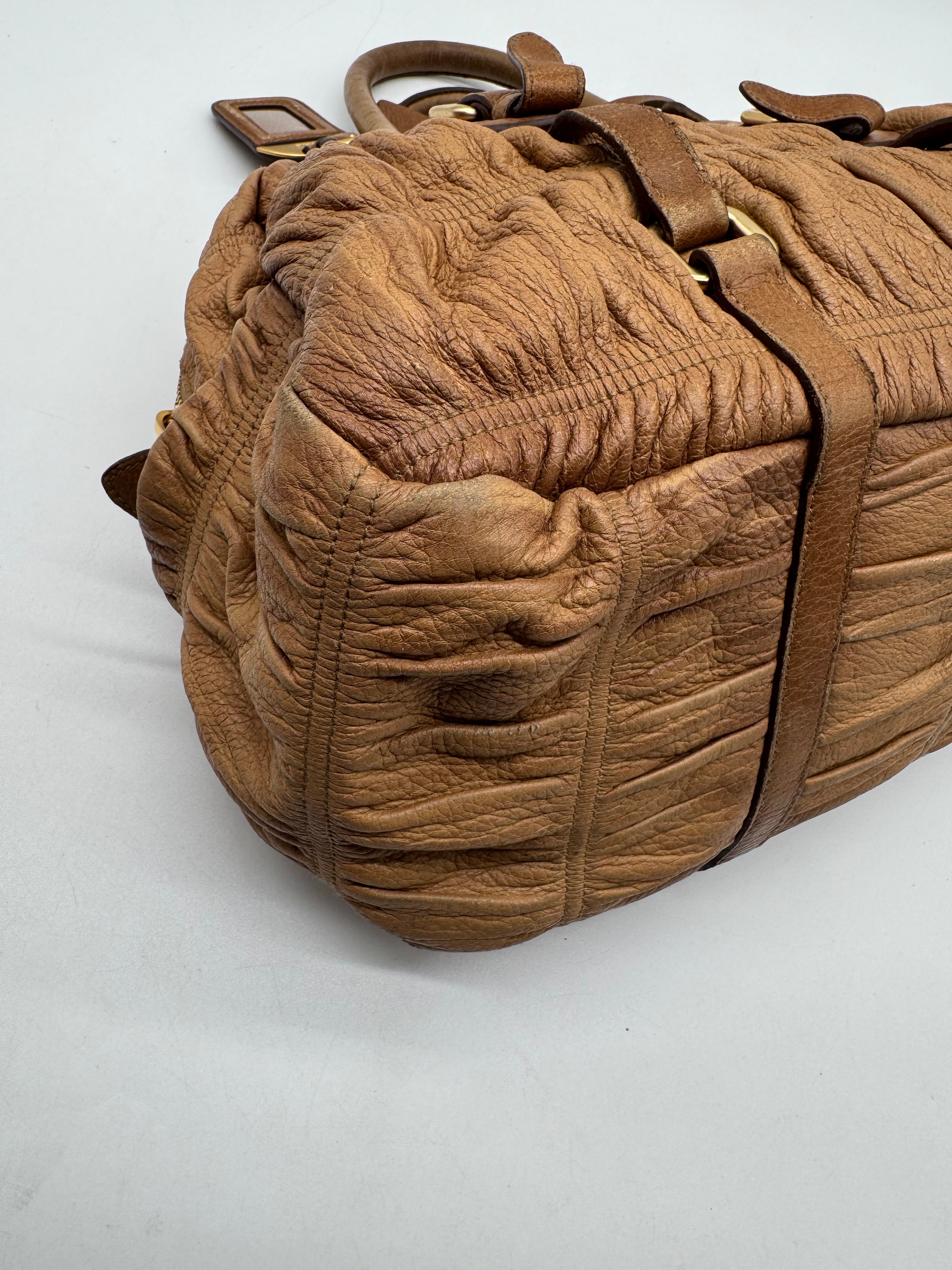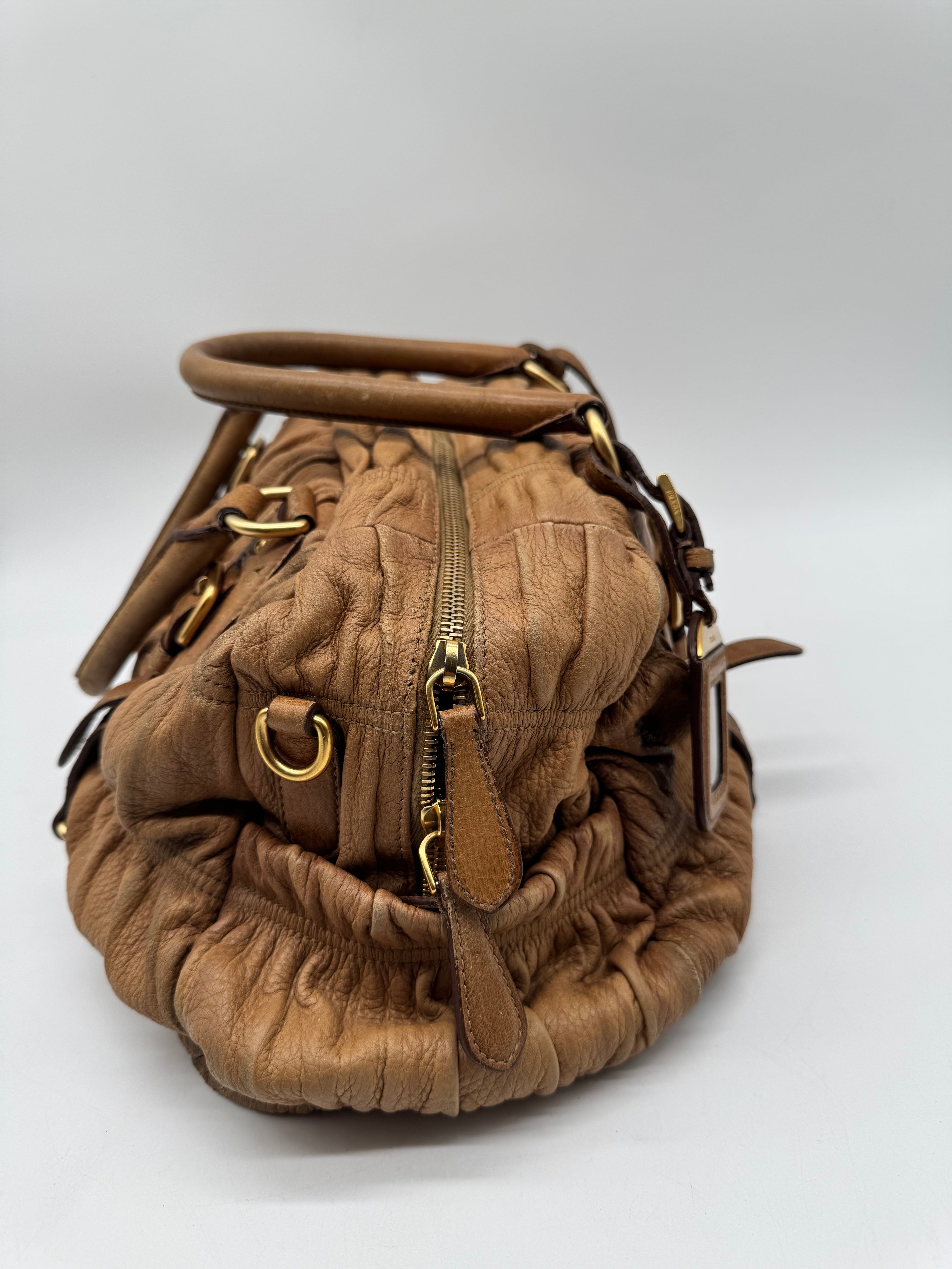 Brand:Prada Model:deer skin gathered leather bag Exterior material:leather Exterior colour:camel Print:plain Interior material:nylon Closure:zip Hardware tone:gold Type:shoulder bag Accessories: Features:a... Read more Read more
