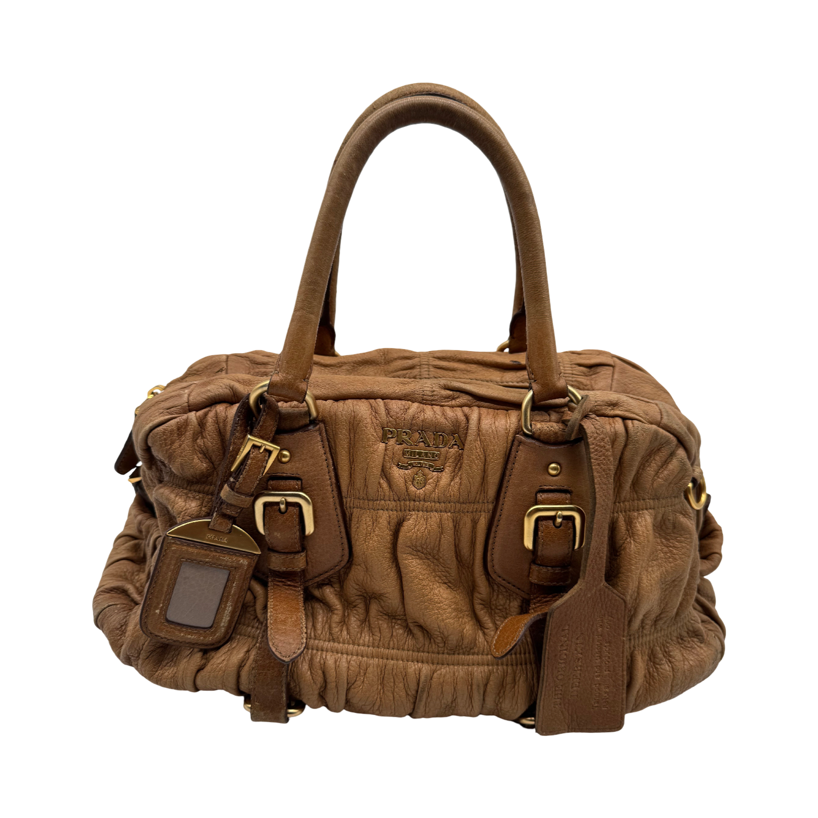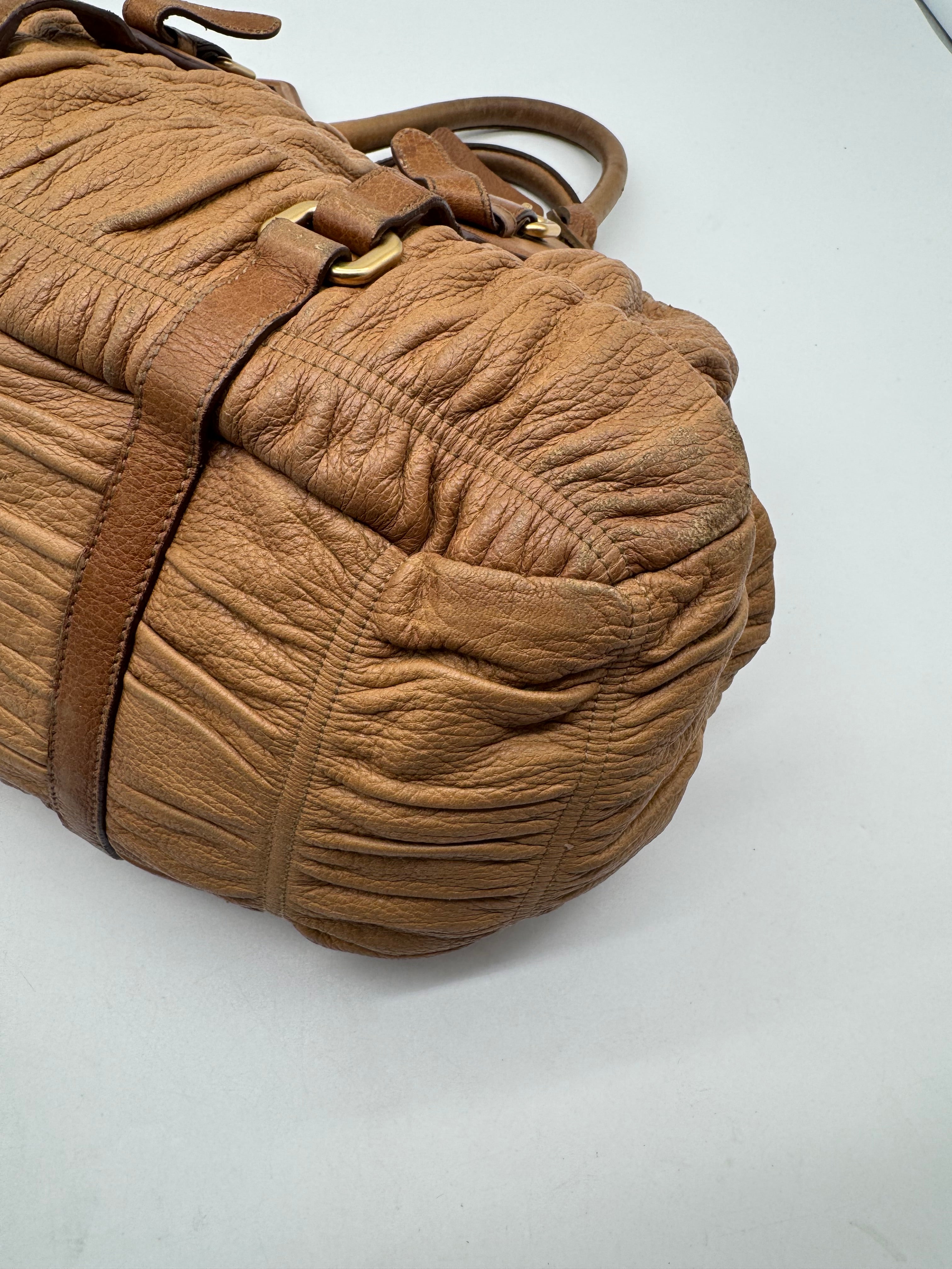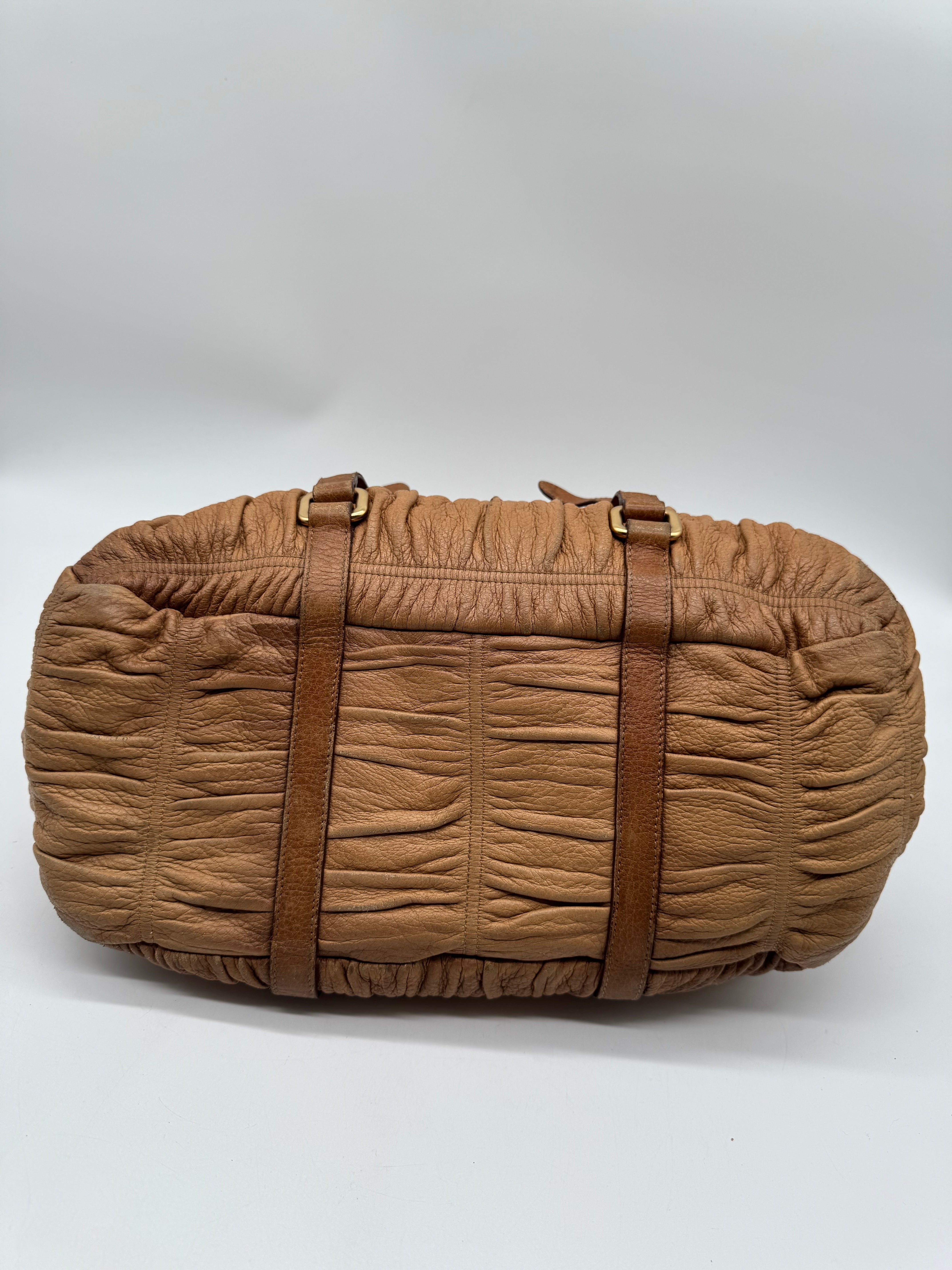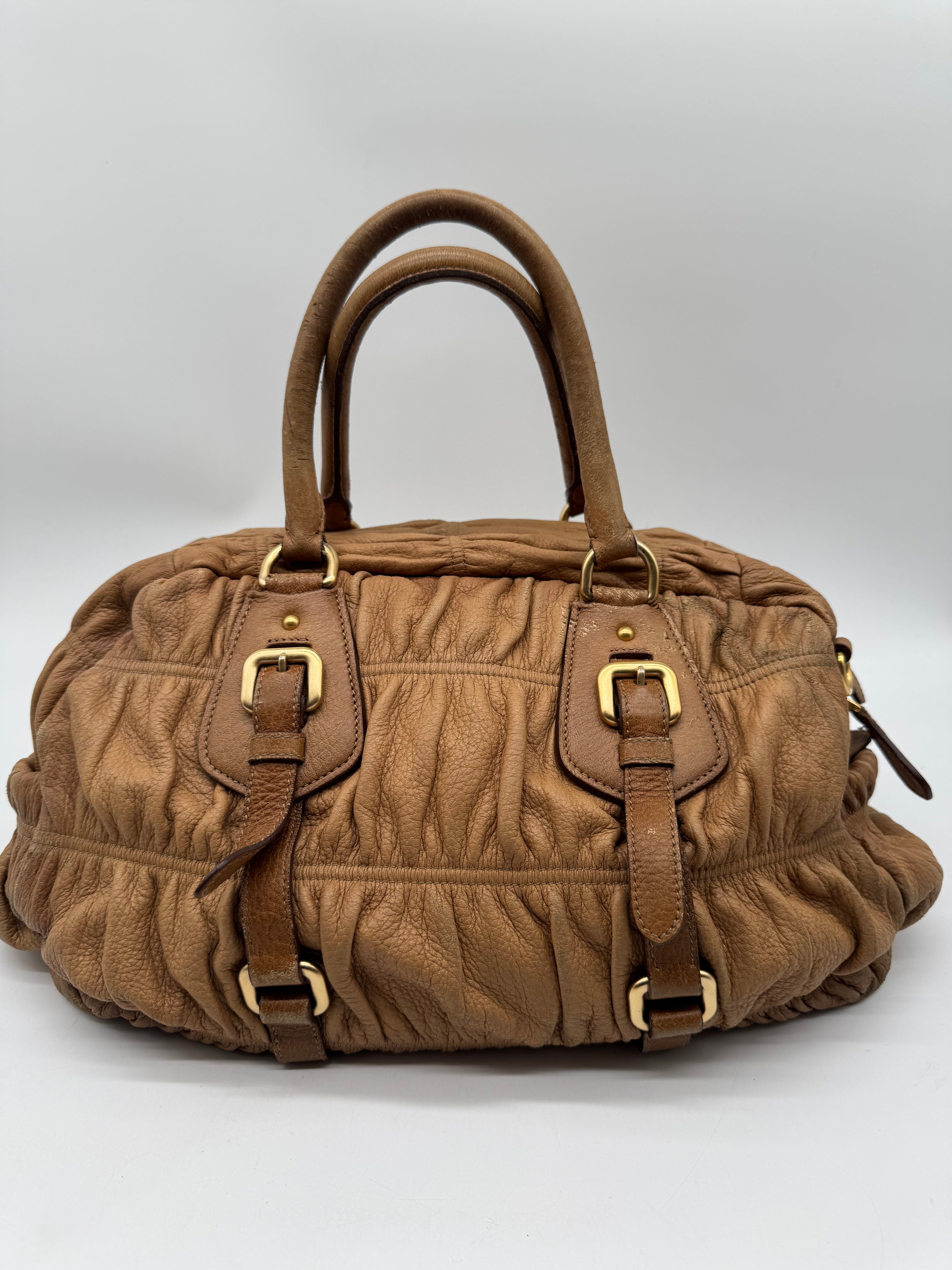 Brand:Prada Model:deer skin gathered leather bag Exterior material:leather Exterior colour:camel Print:plain Interior material:nylon Closure:zip Hardware tone:gold Type:shoulder bag Accessories: Features:a... Read more Read more