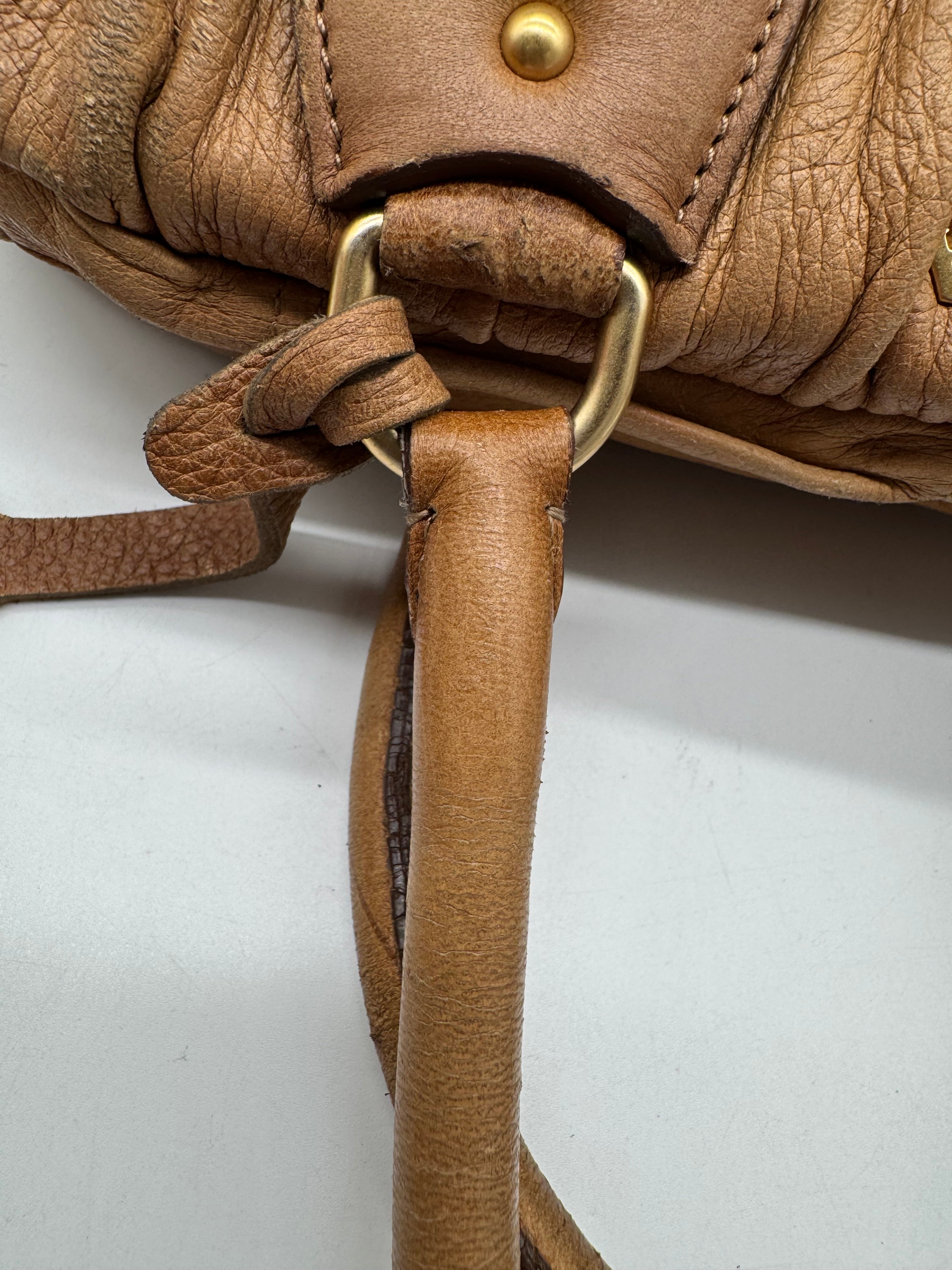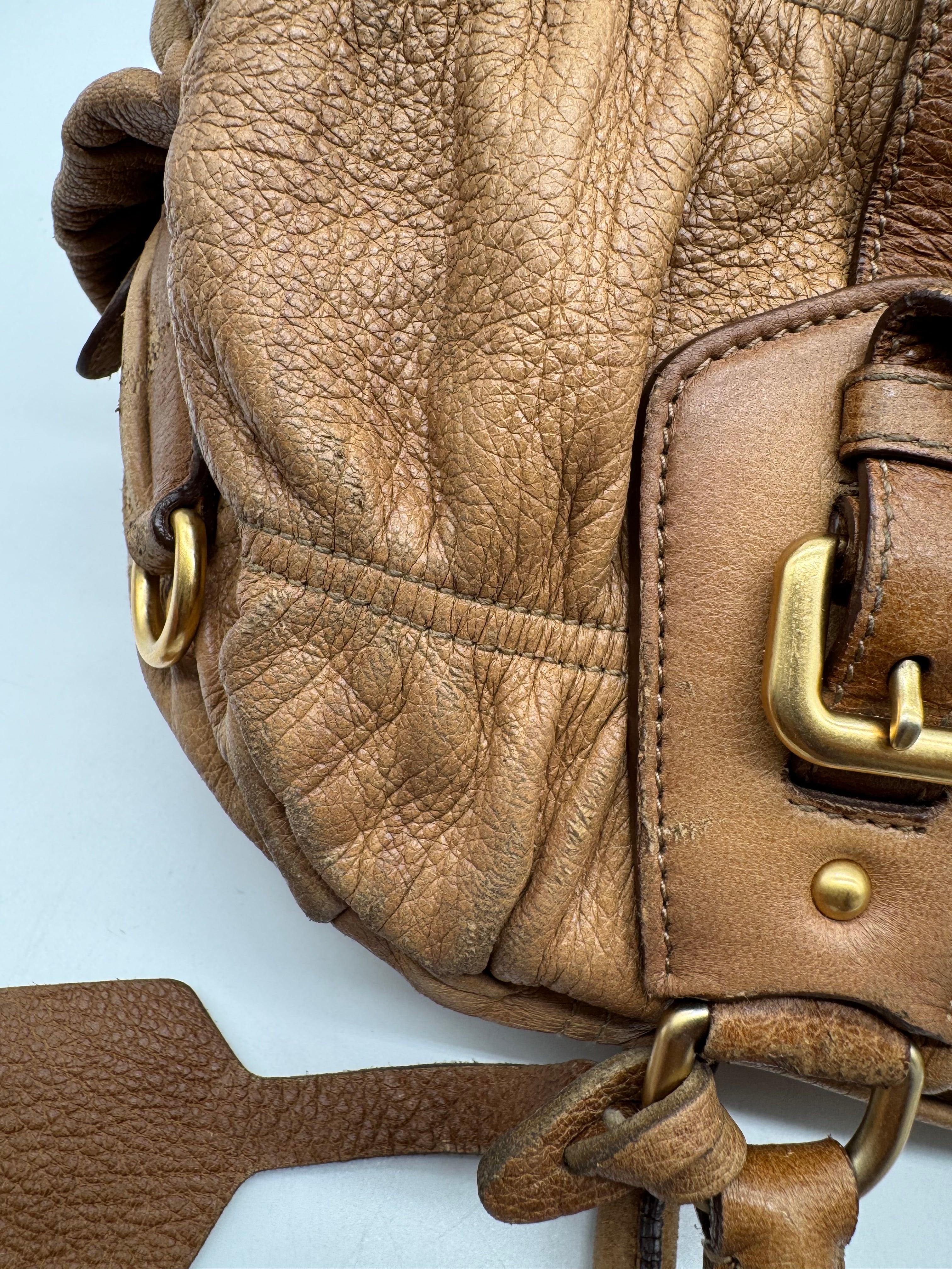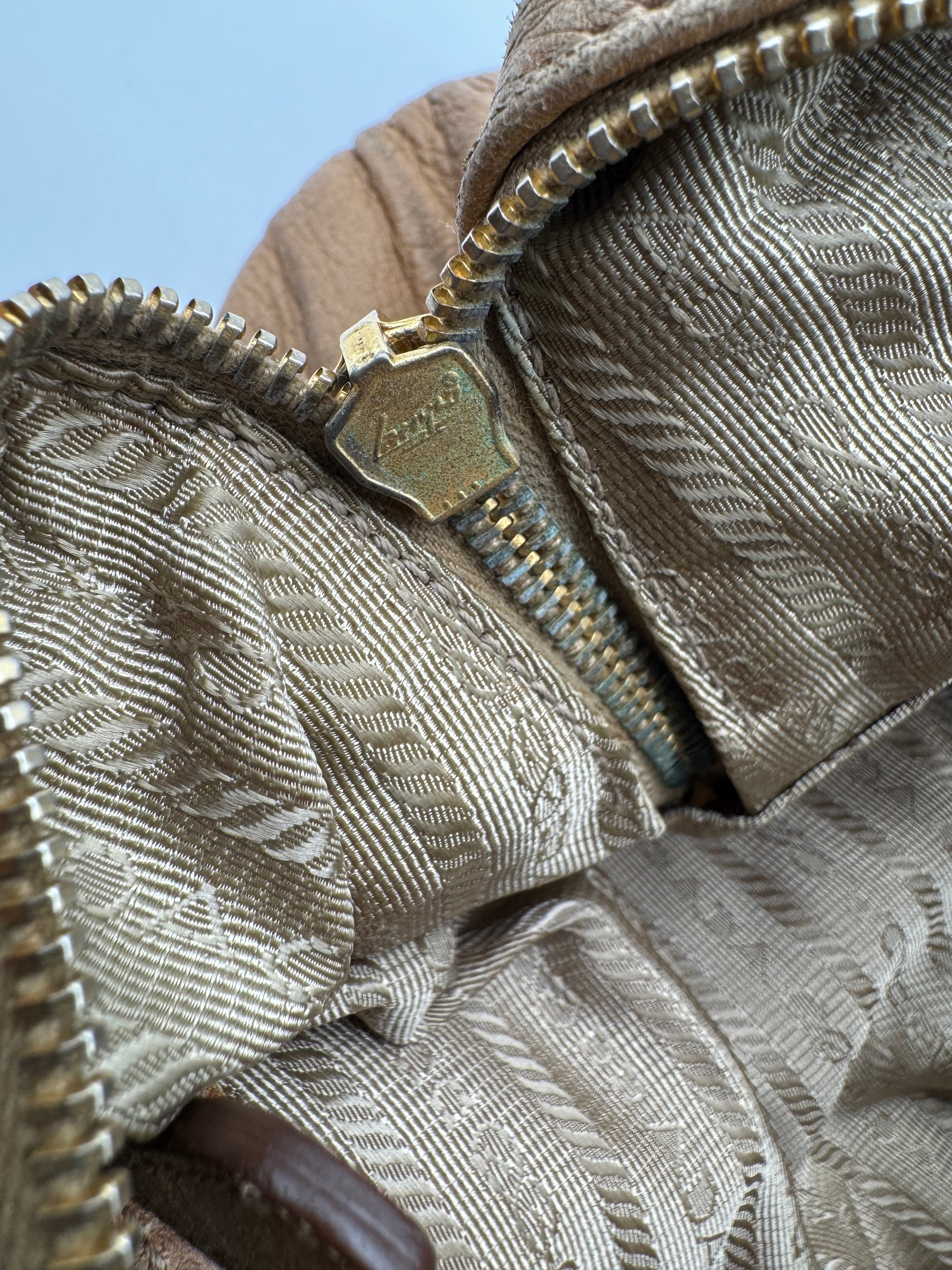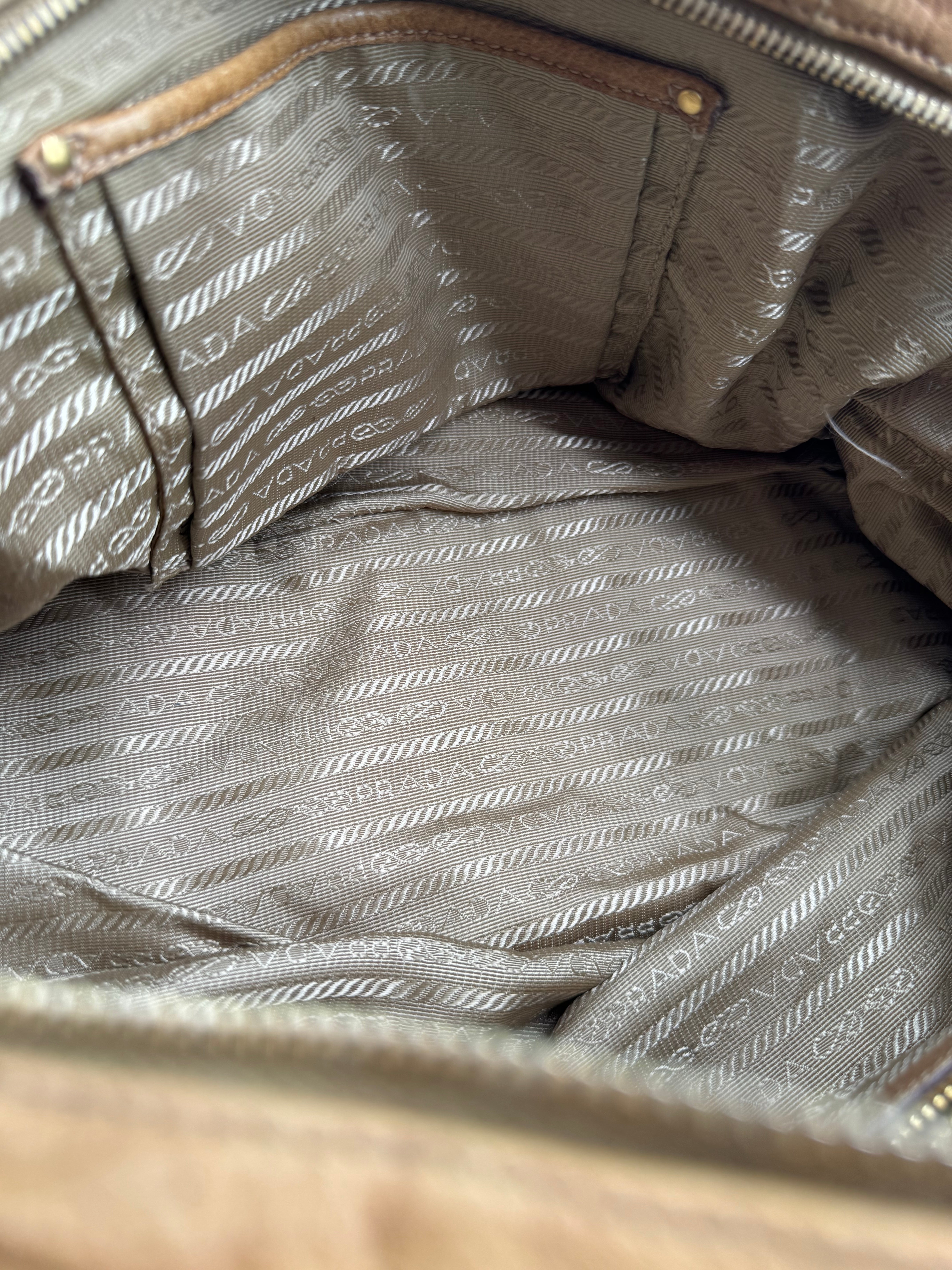 Brand:Prada Model:deer skin gathered leather bag Exterior material:leather Exterior colour:camel Print:plain Interior material:nylon Closure:zip Hardware tone:gold Type:shoulder bag Accessories: Features:a... Read more Read more
