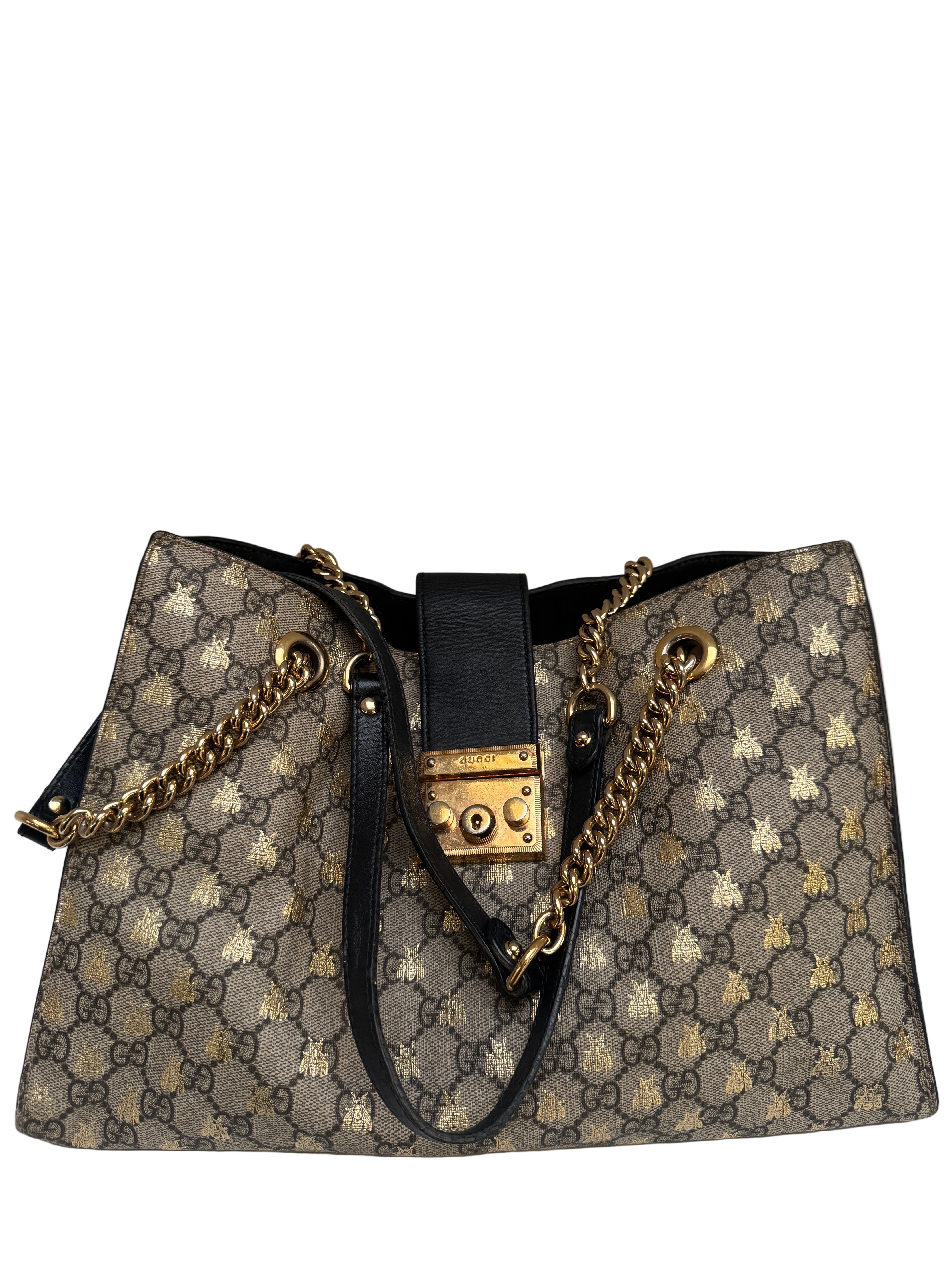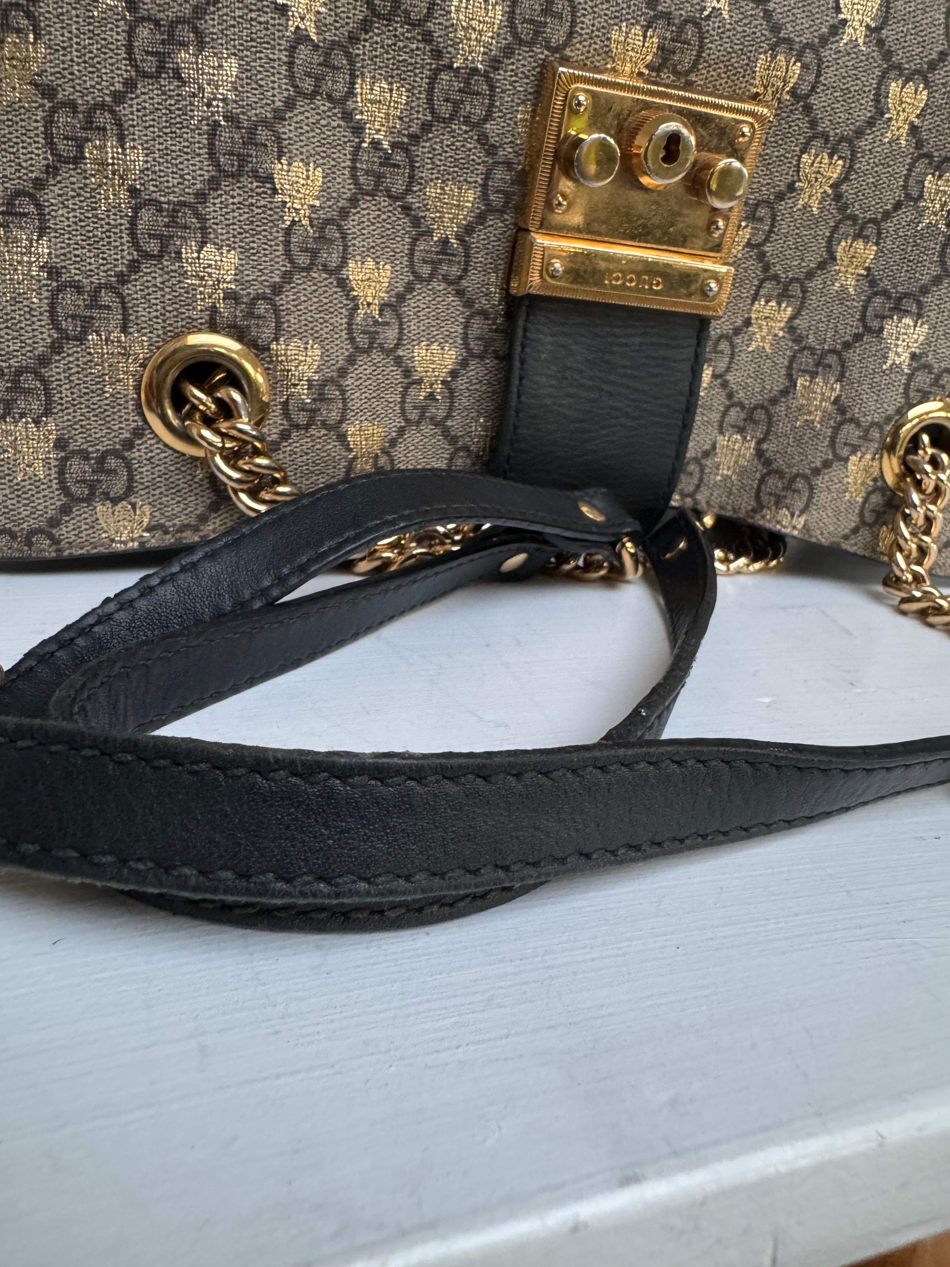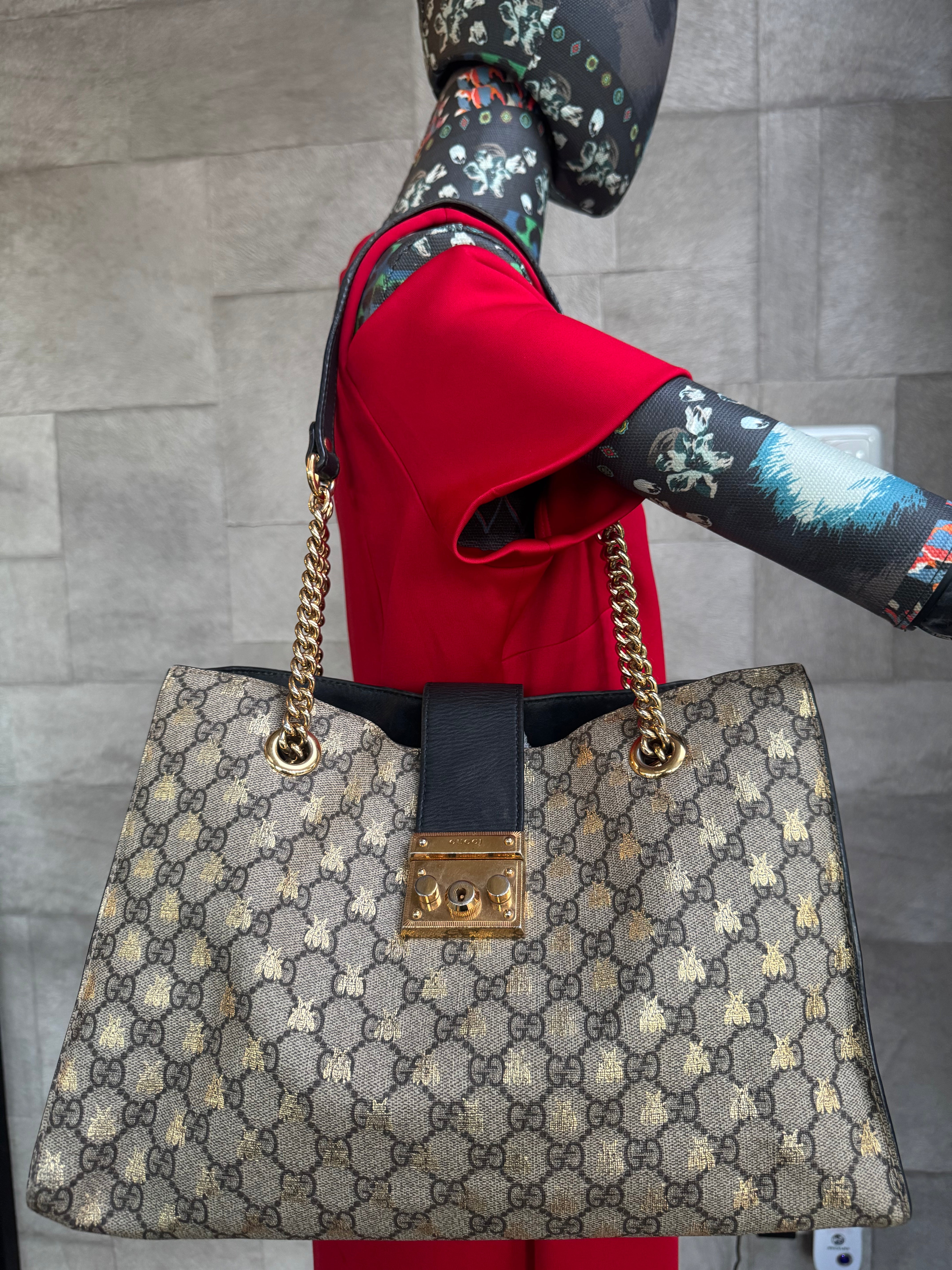 Brand:Gucci Model:Gucci padlock shoulder bag Exterior material:leather Exterior colour:multi Print:bee print Interior material:suede Closure:lock Hardware tone:gold Type:shoulder bag Accessories: Features:...