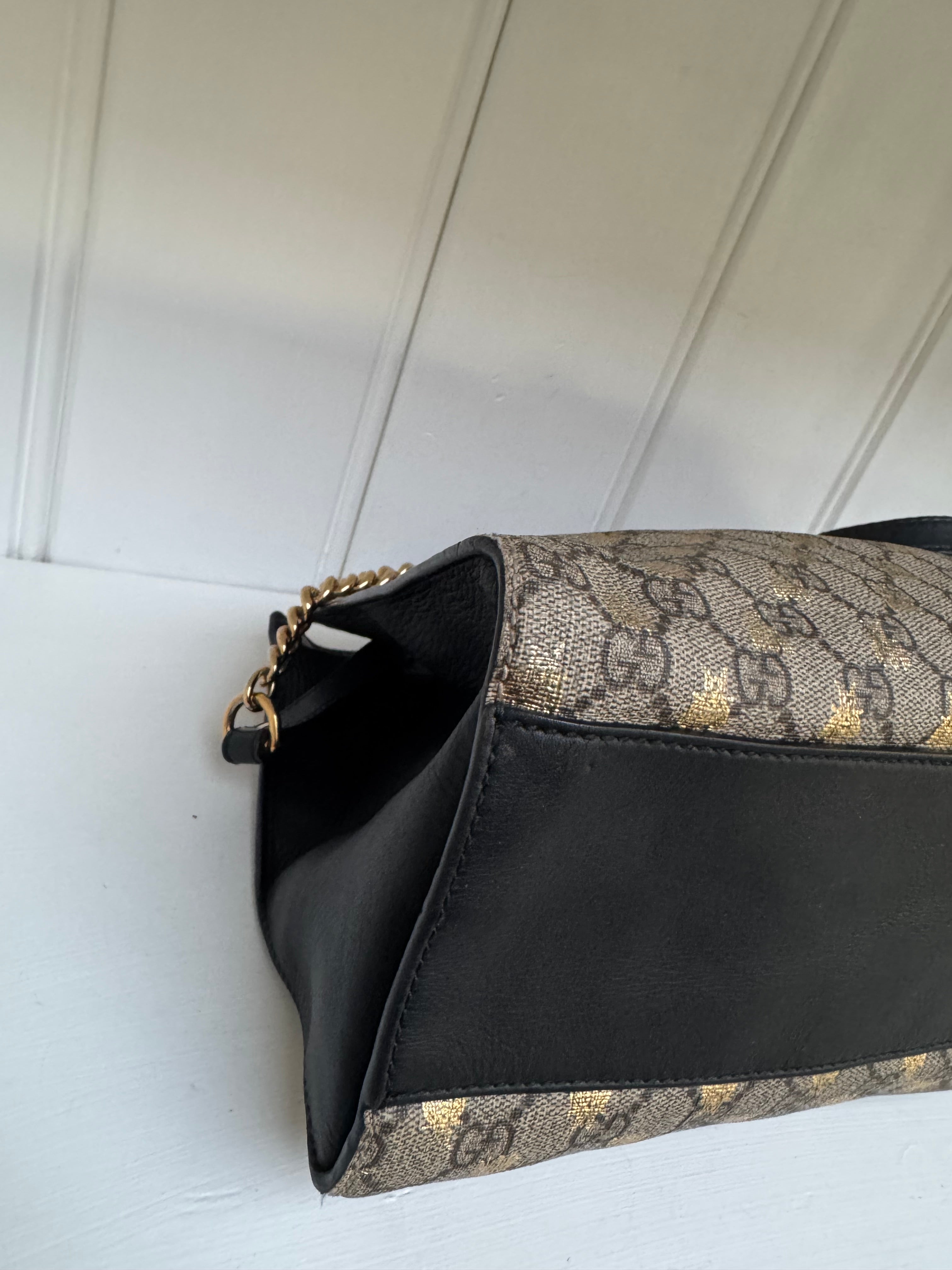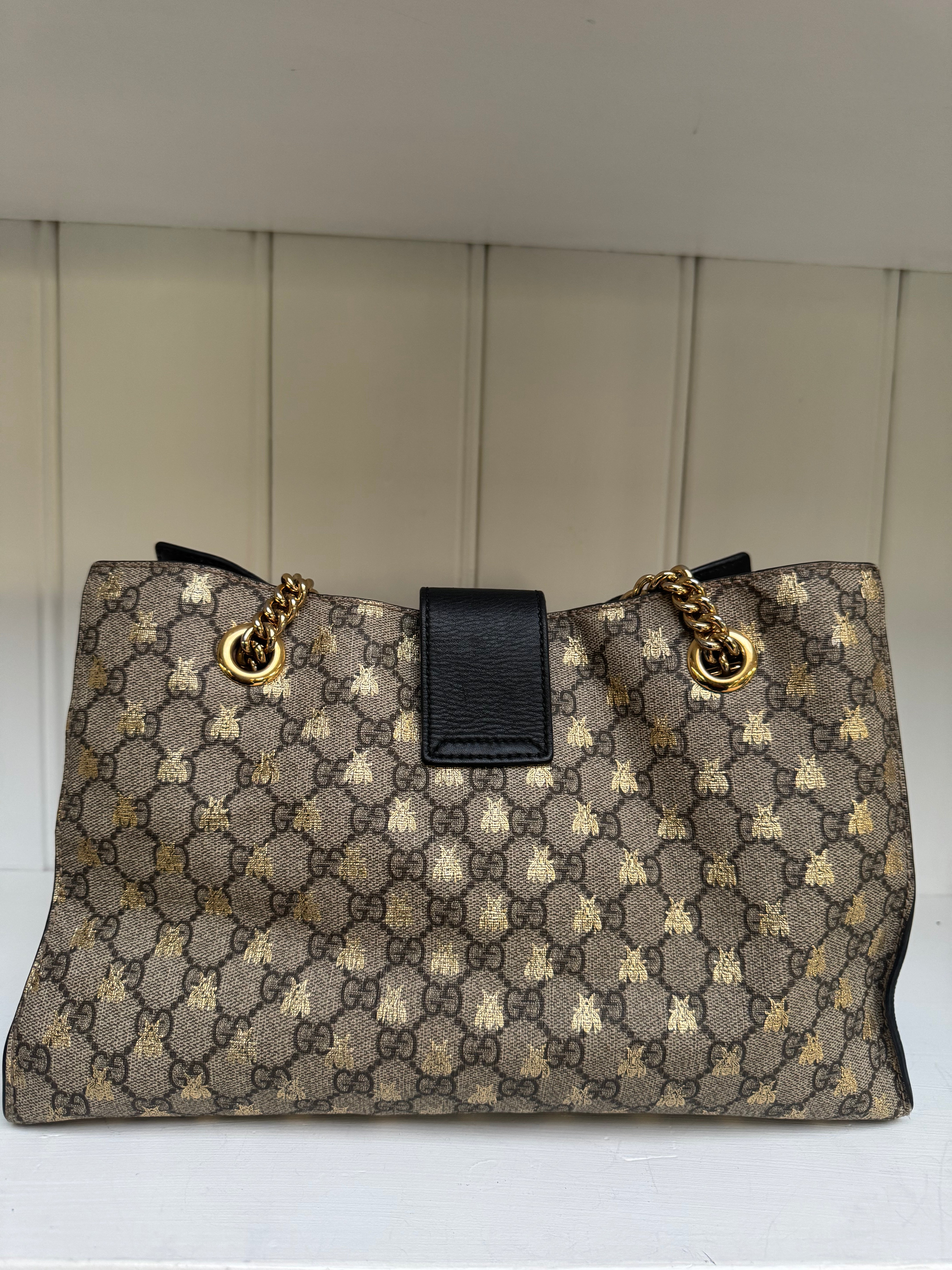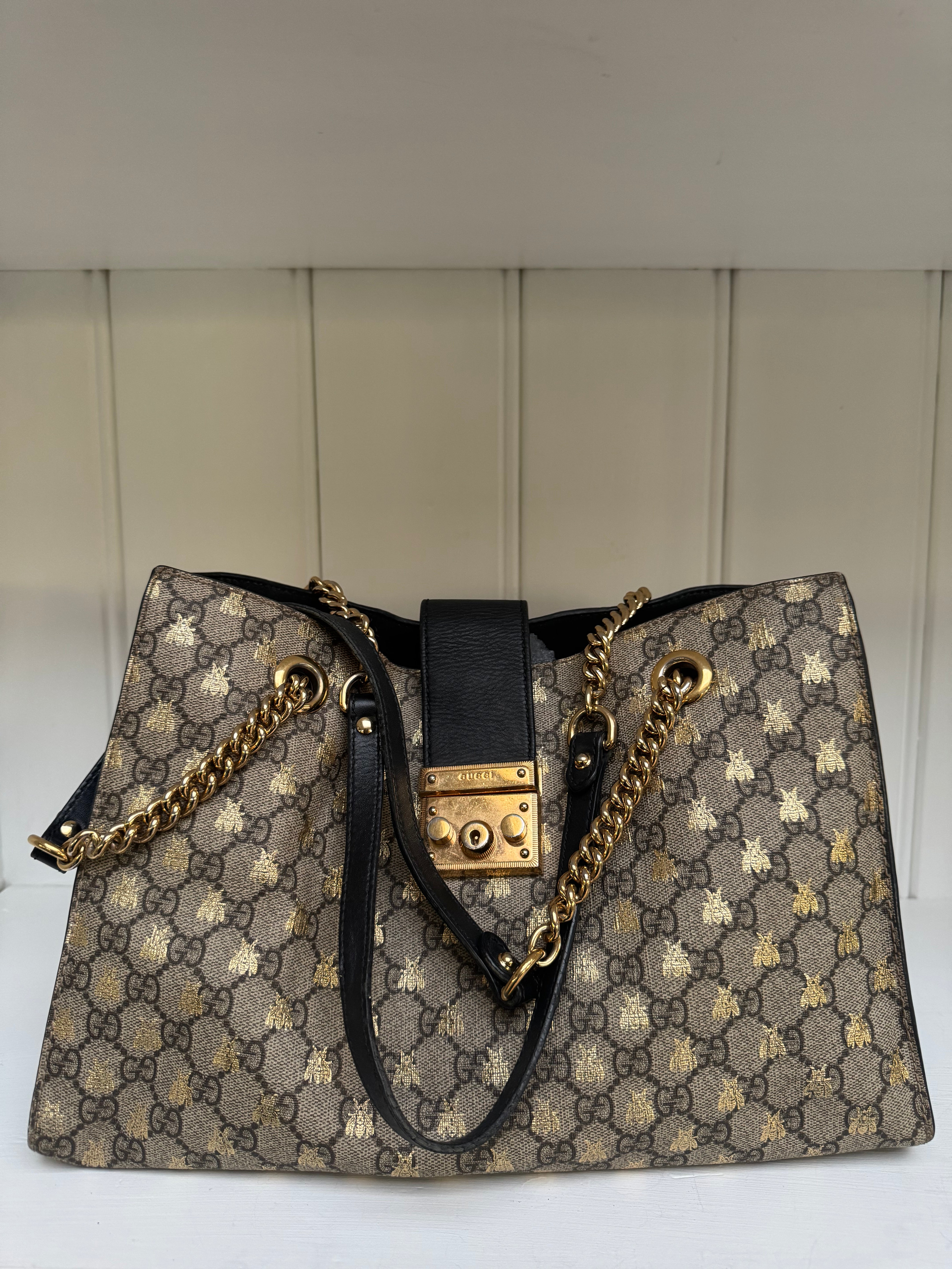 Brand:Gucci Model:Gucci padlock shoulder bag Exterior material:leather Exterior colour:multi Print:bee print Interior material:suede Closure:lock Hardware tone:gold Type:shoulder bag Accessories: Features:...