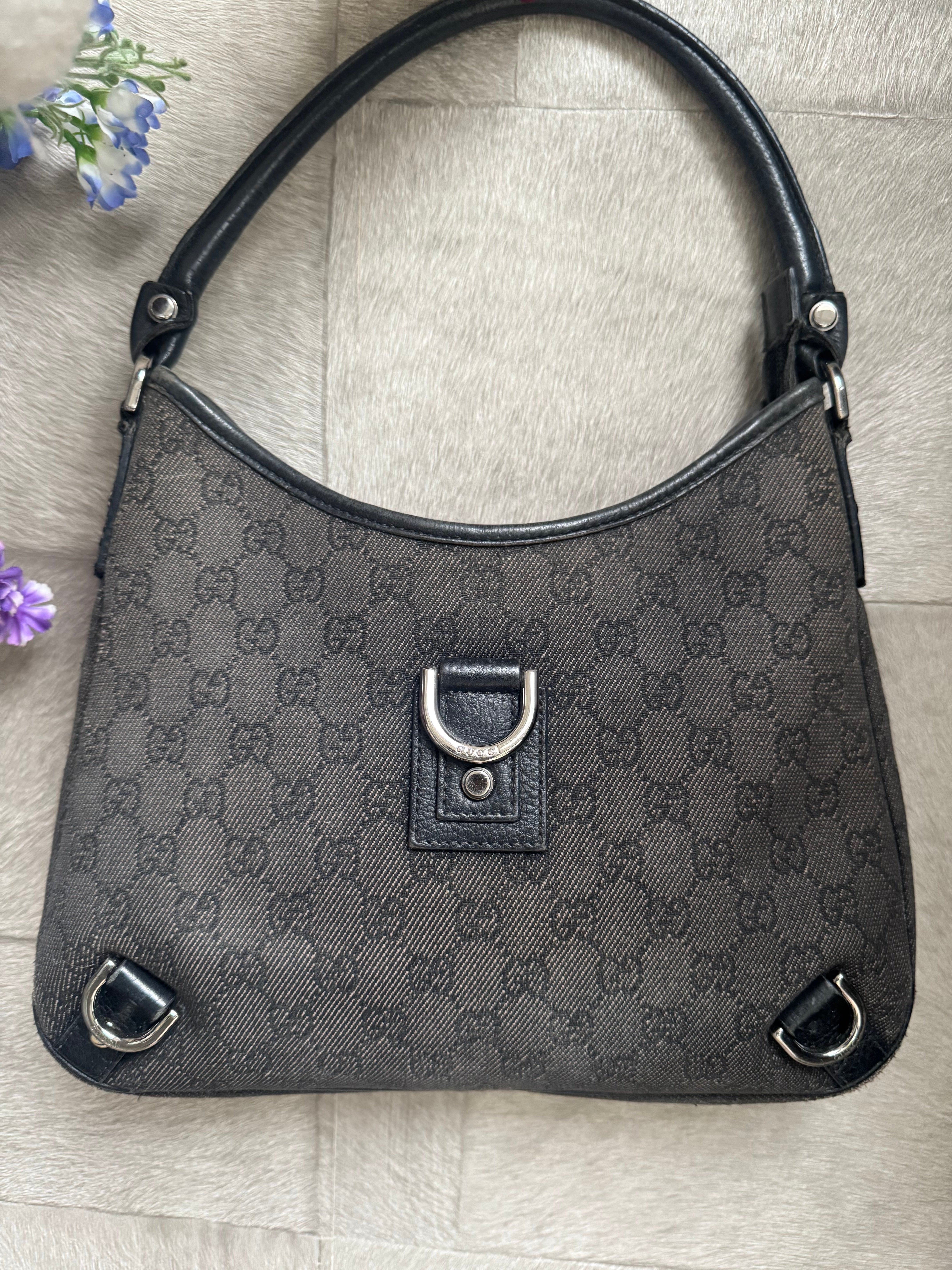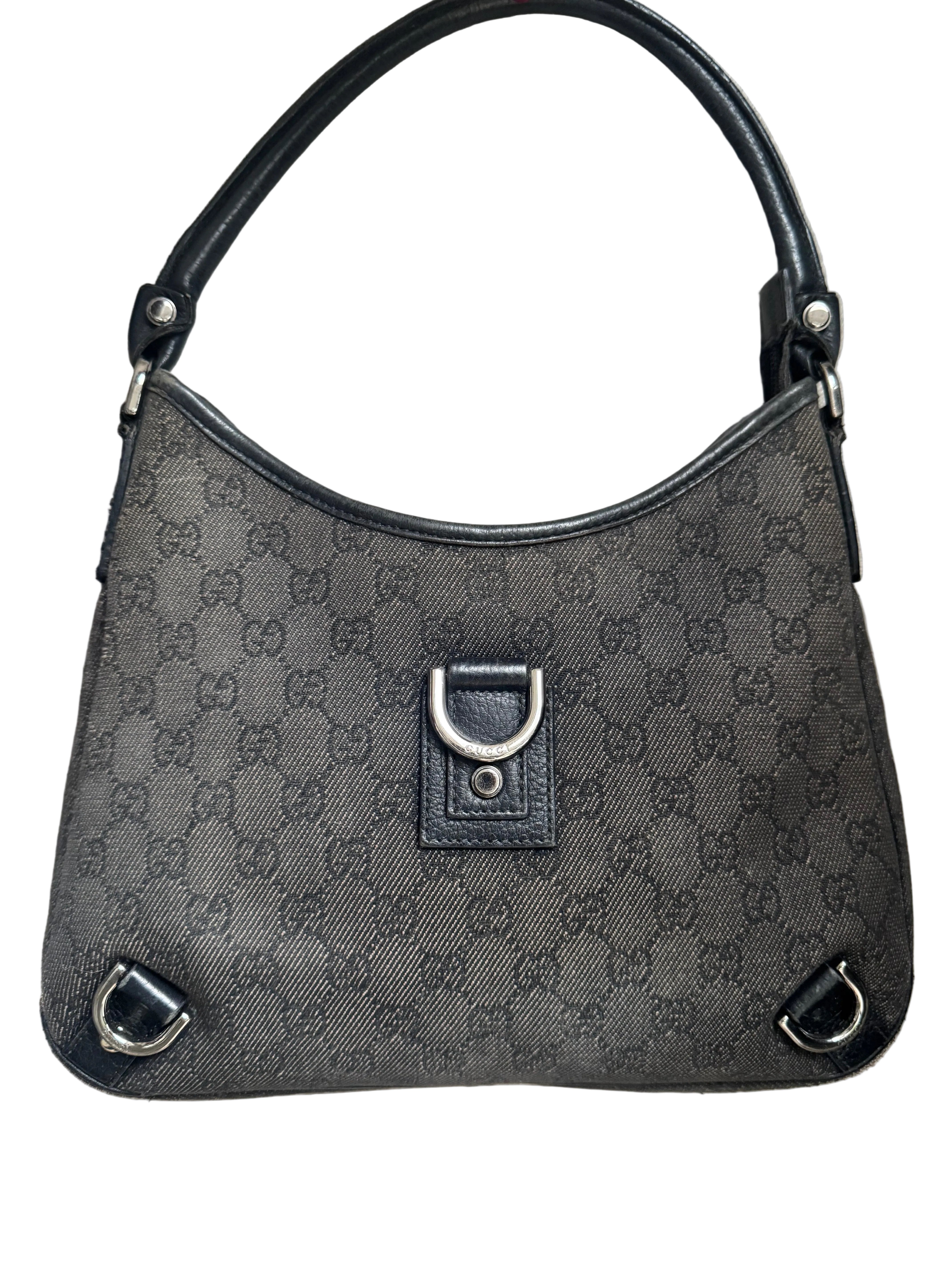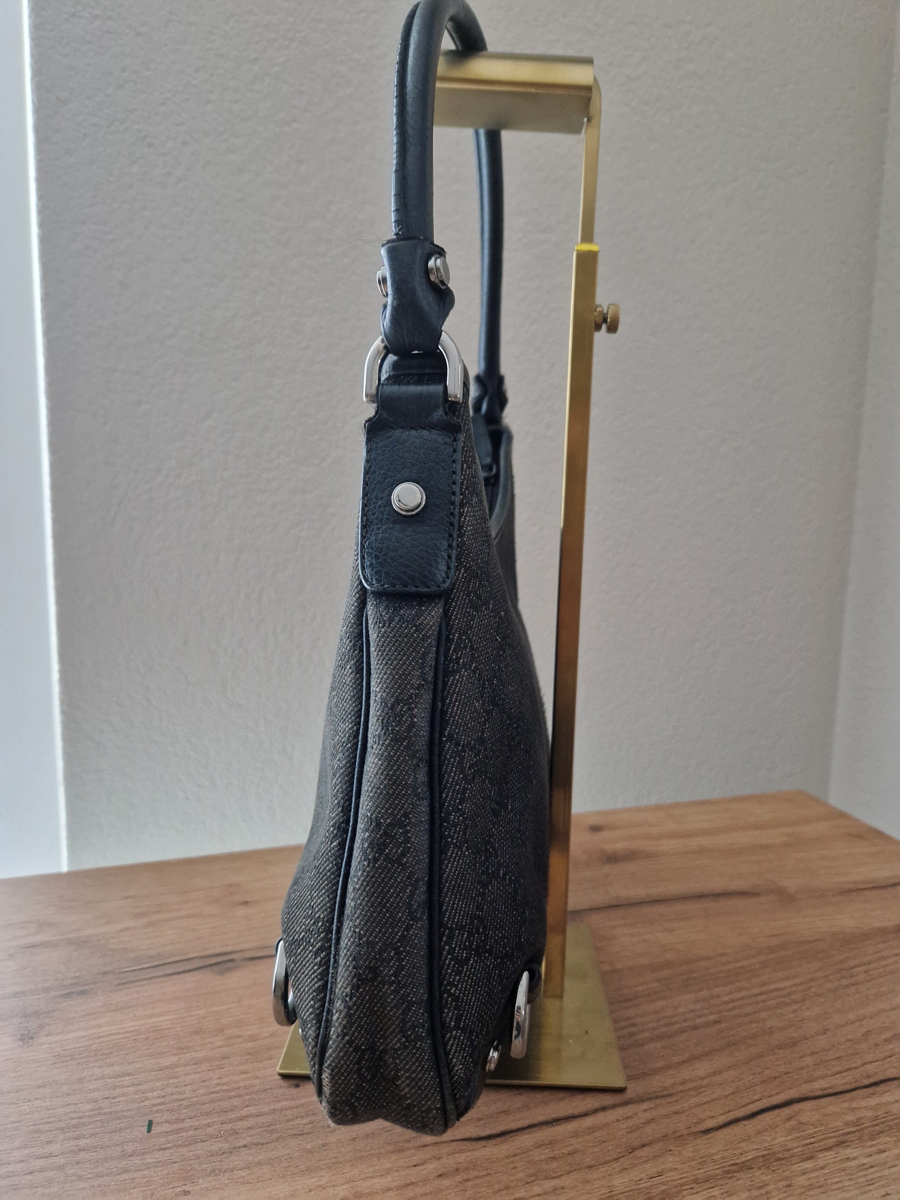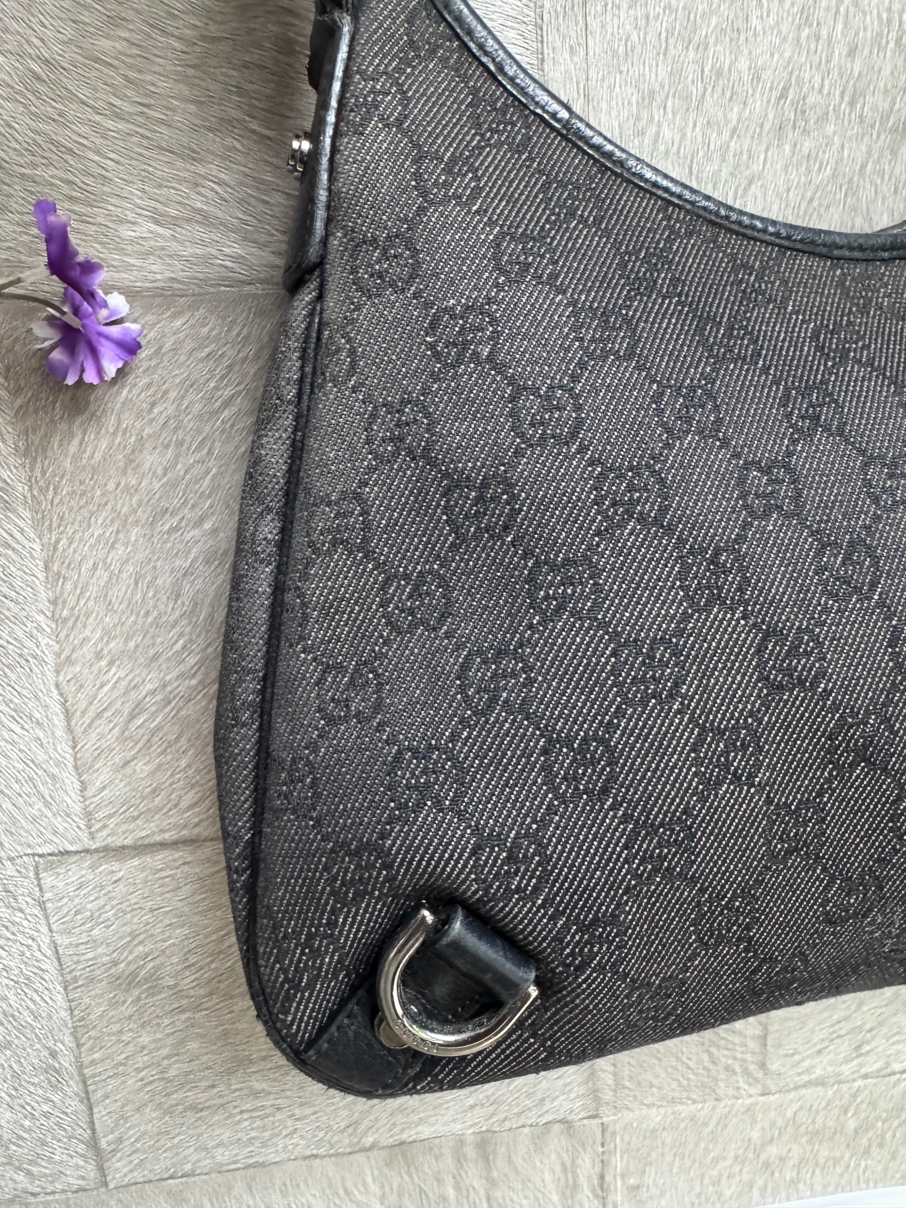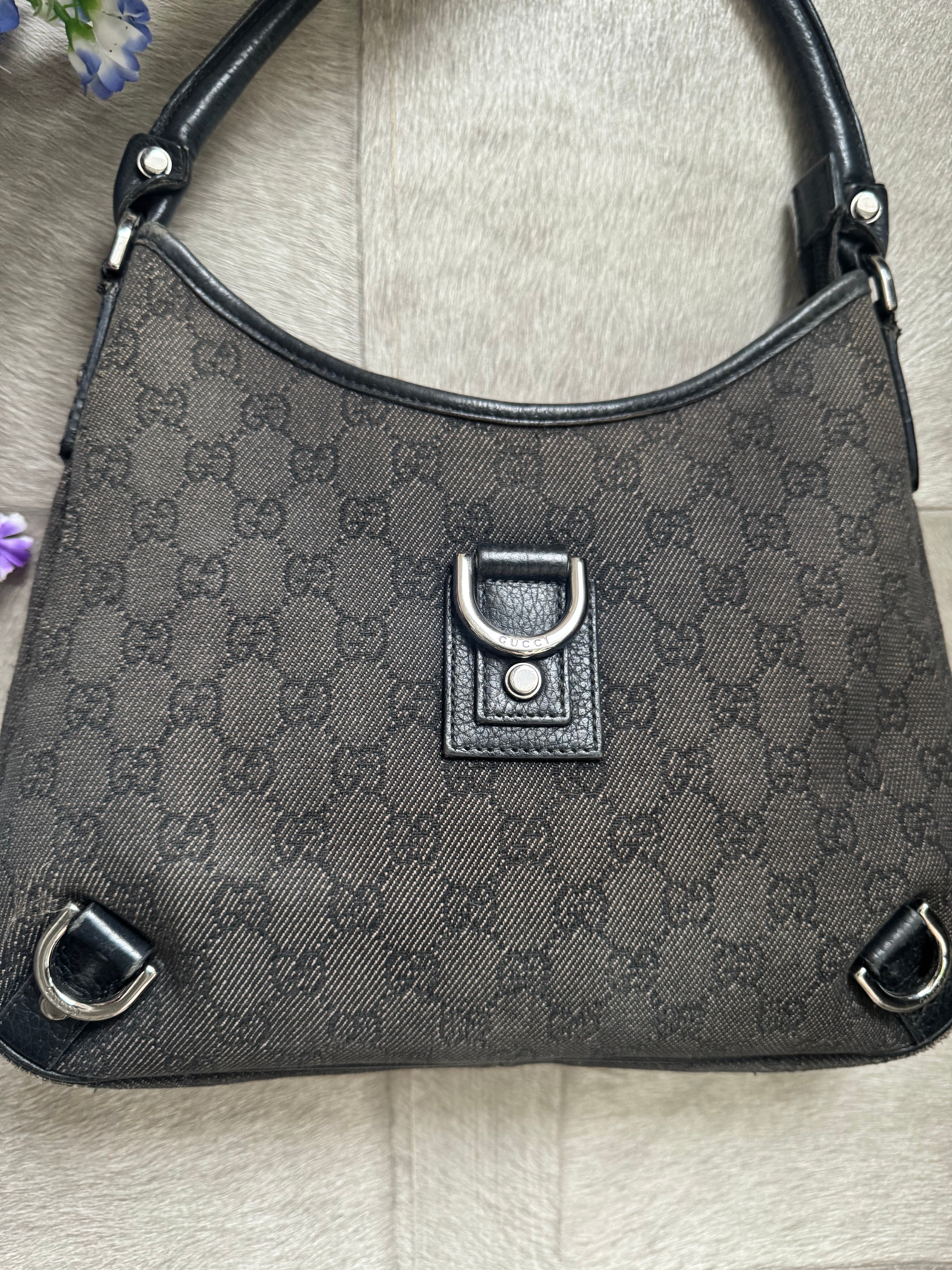 Authentic Gucci GG D ring denim hobo shoulder bag crafted in grey/black monogram canvas with black leather trim and silver-tone... Read more Read more