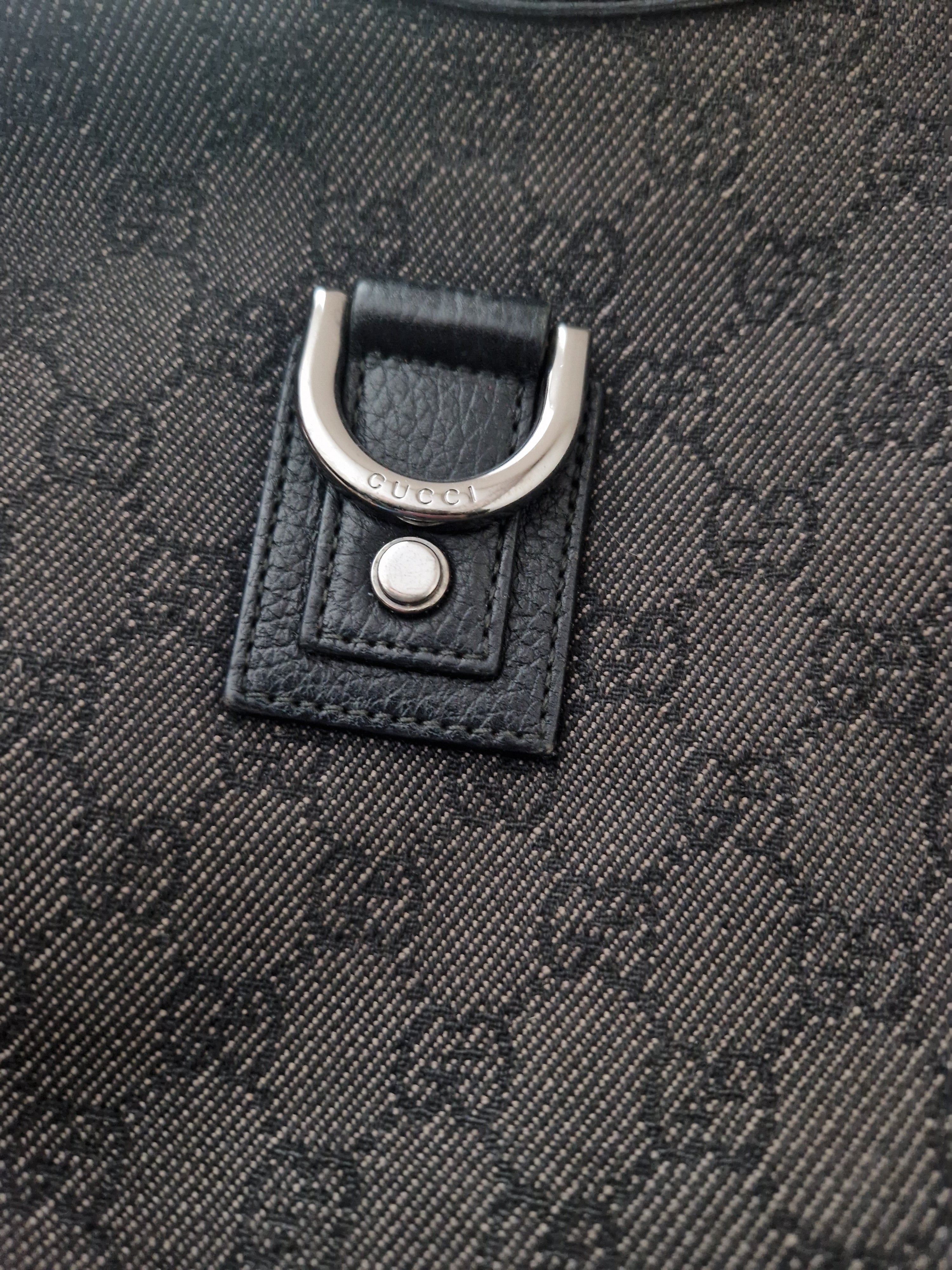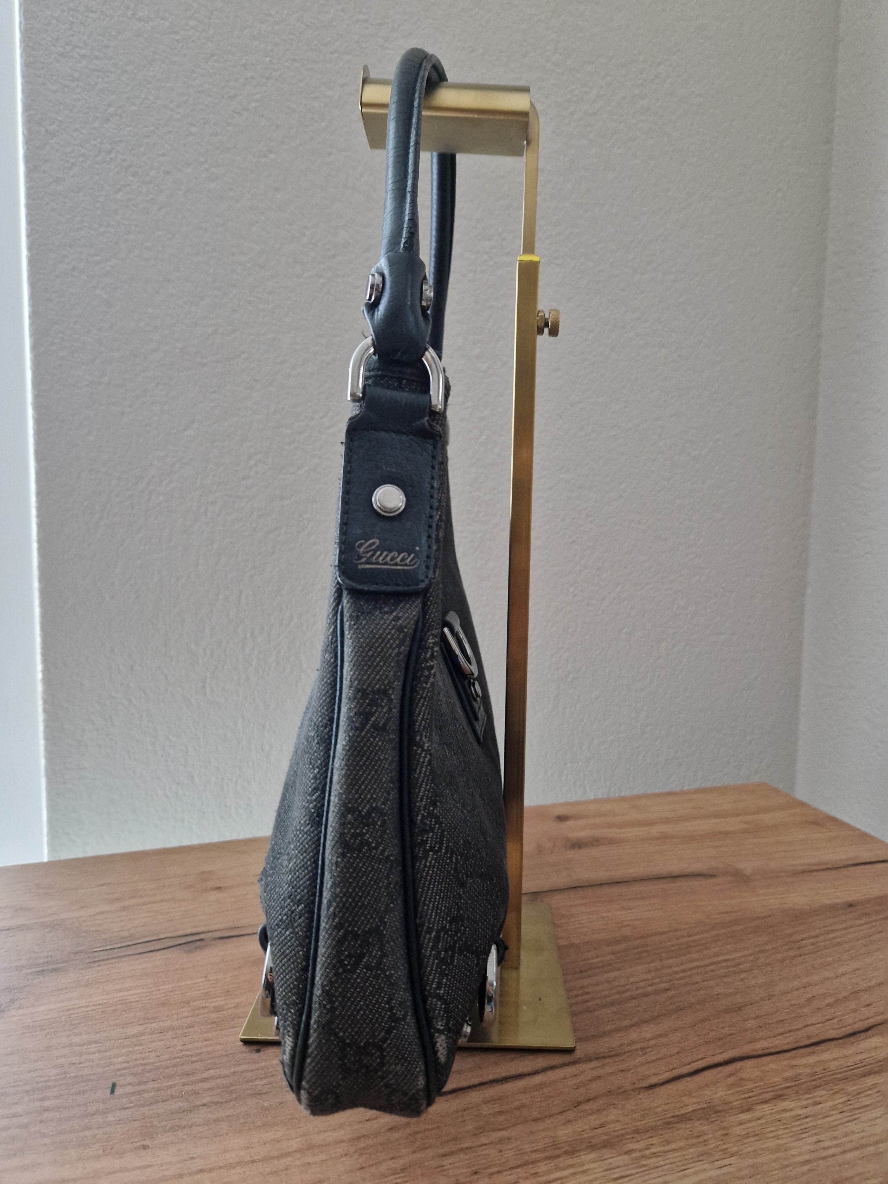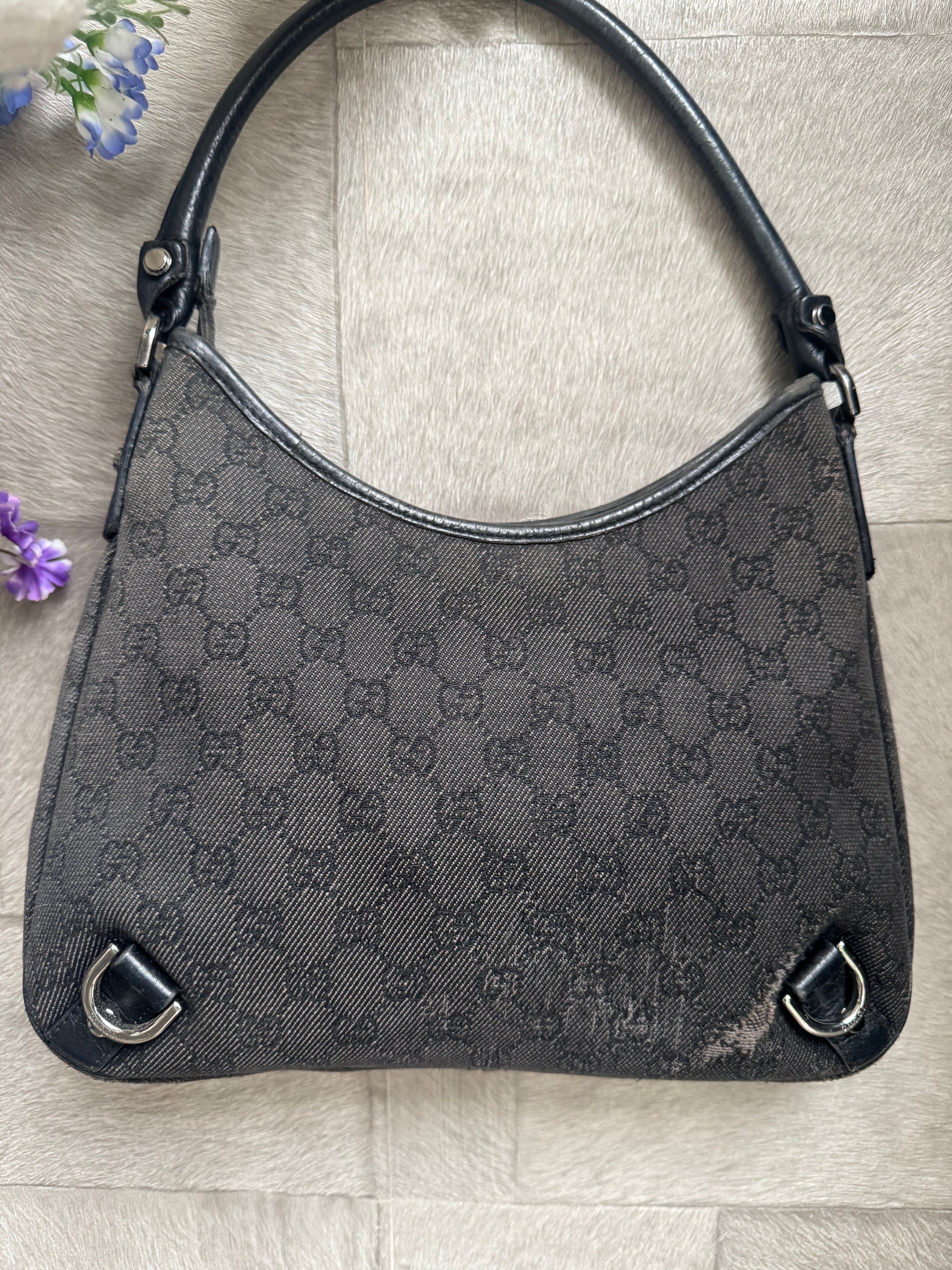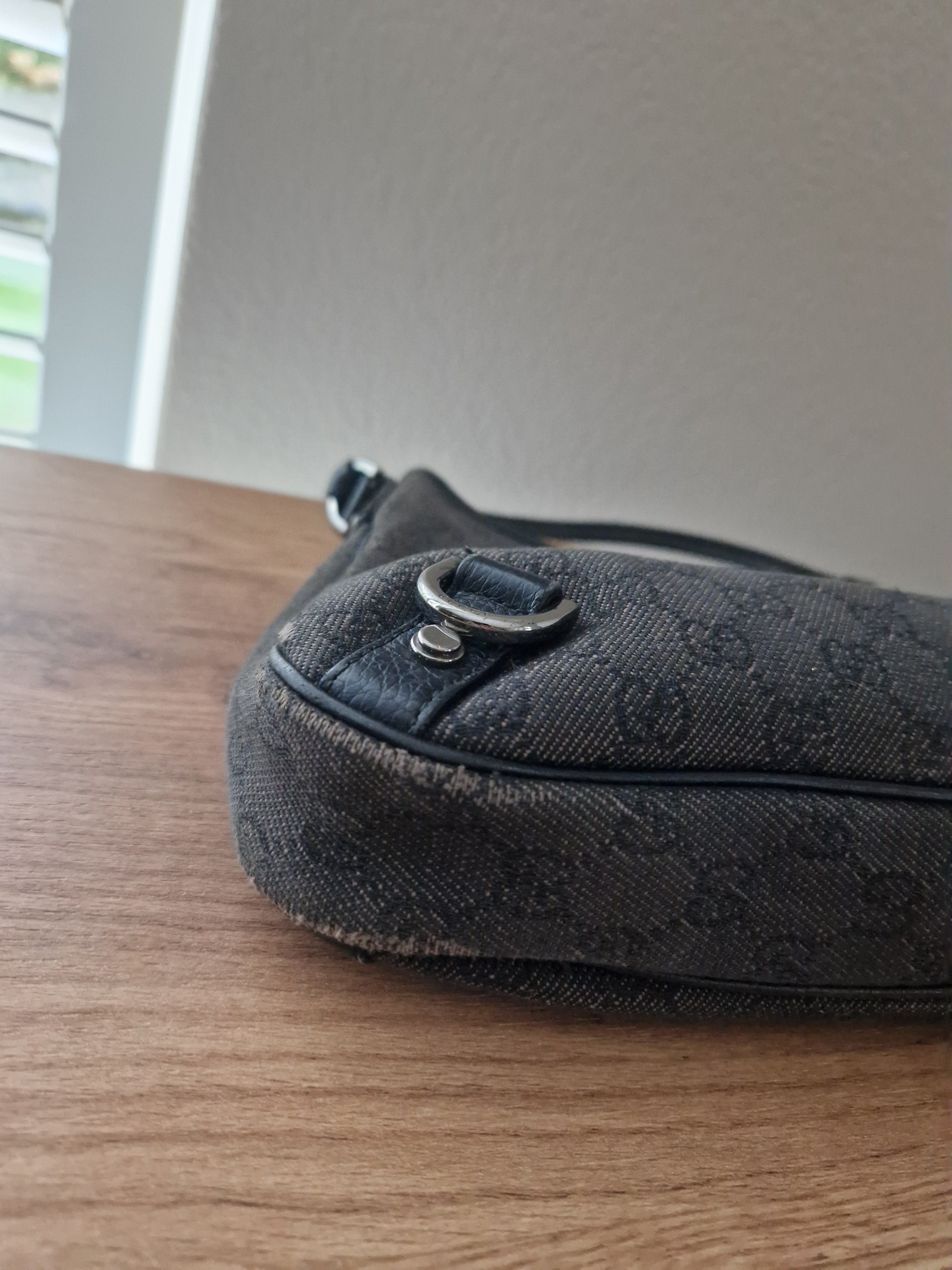 Authentic Gucci GG D ring denim hobo shoulder bag crafted in grey/black monogram canvas with black leather trim and silver-tone... Read more Read more