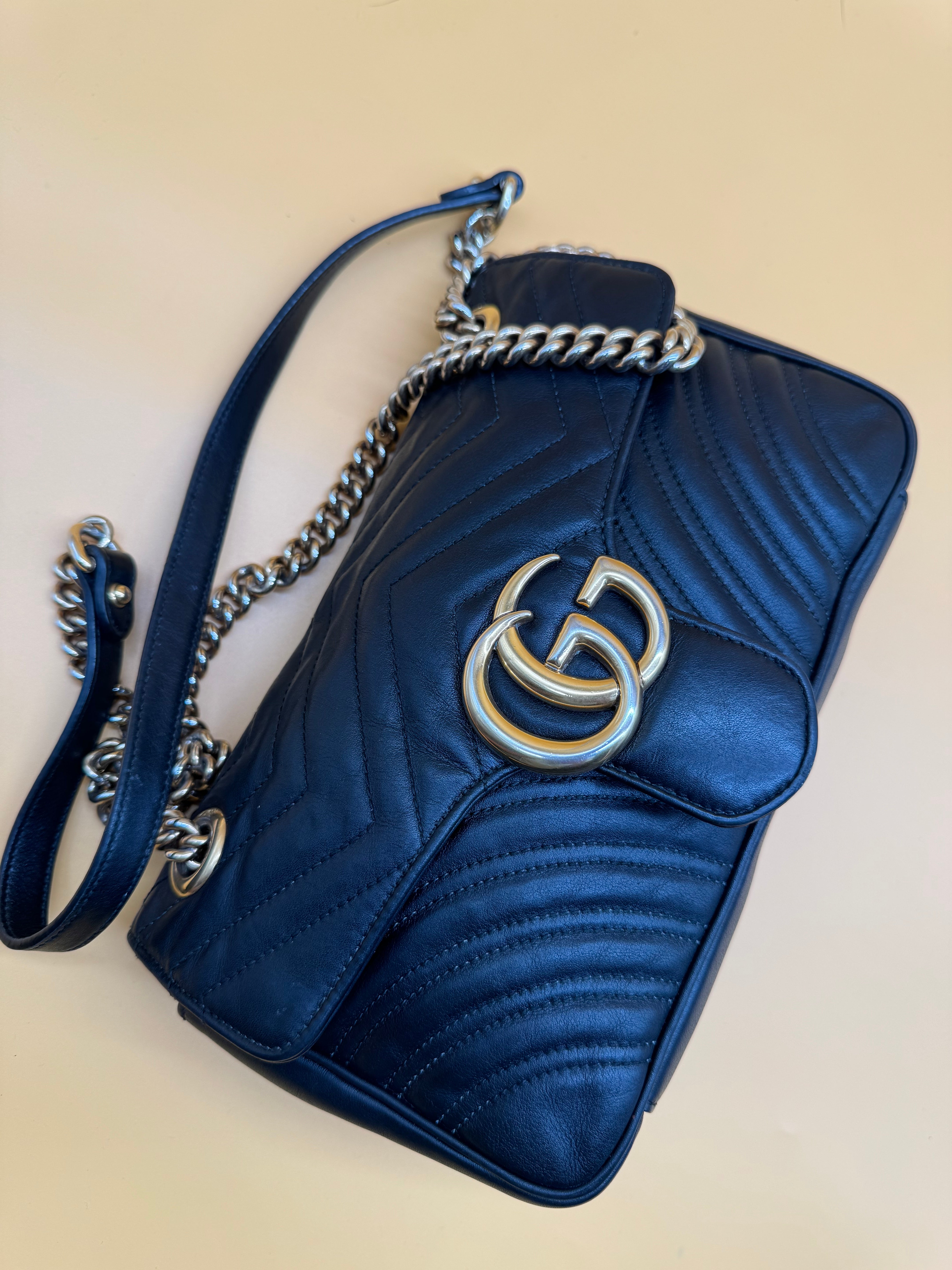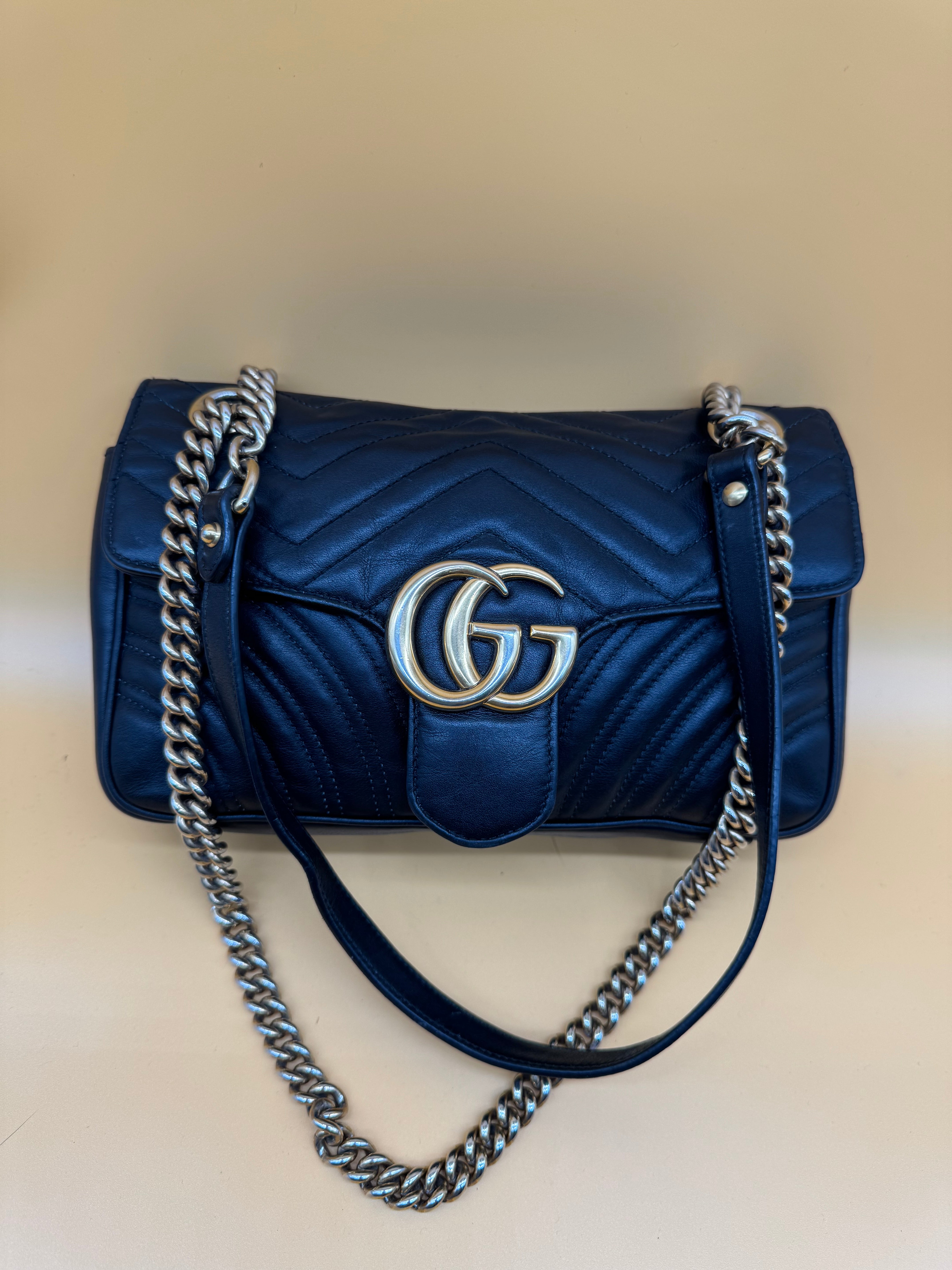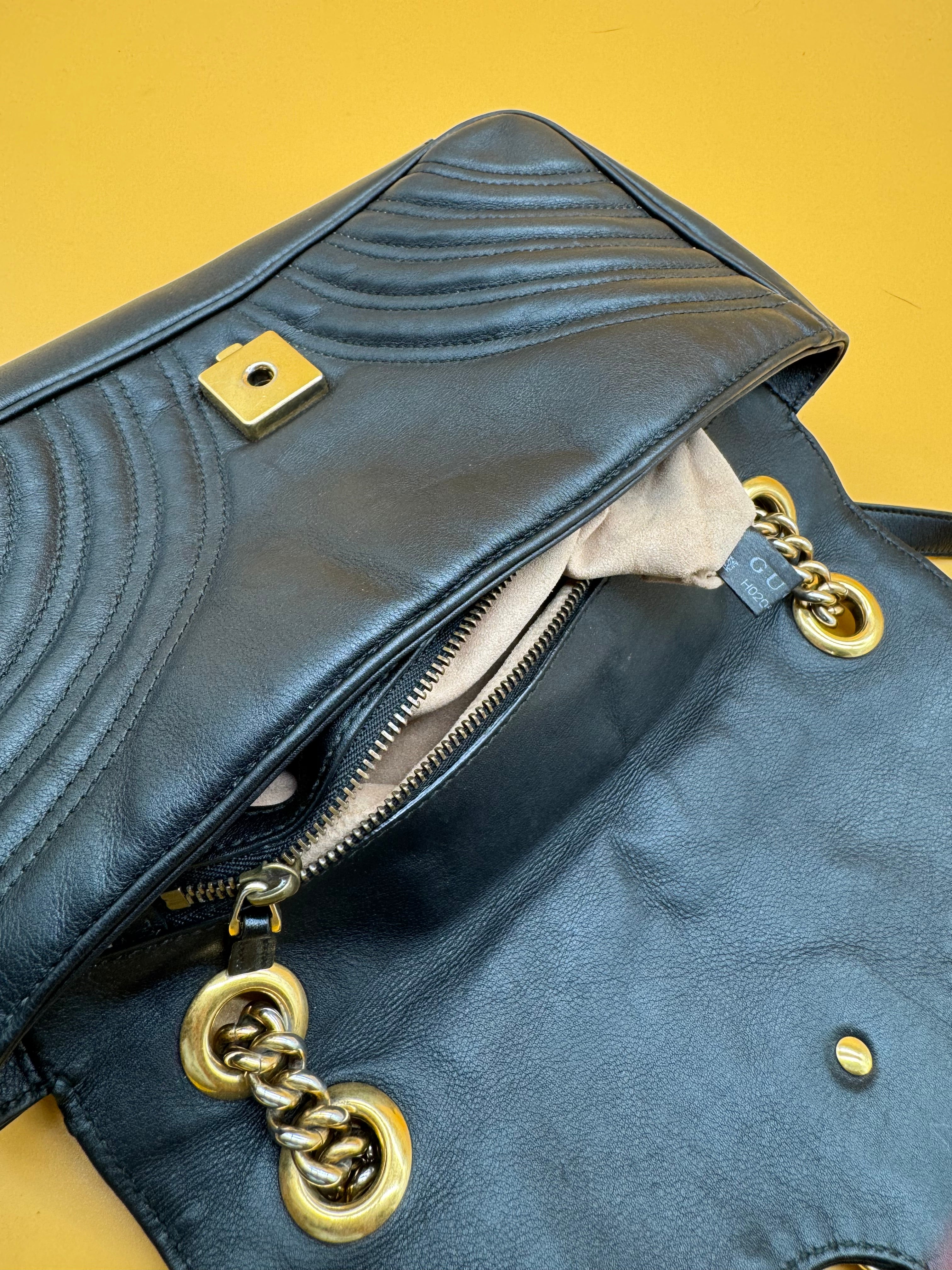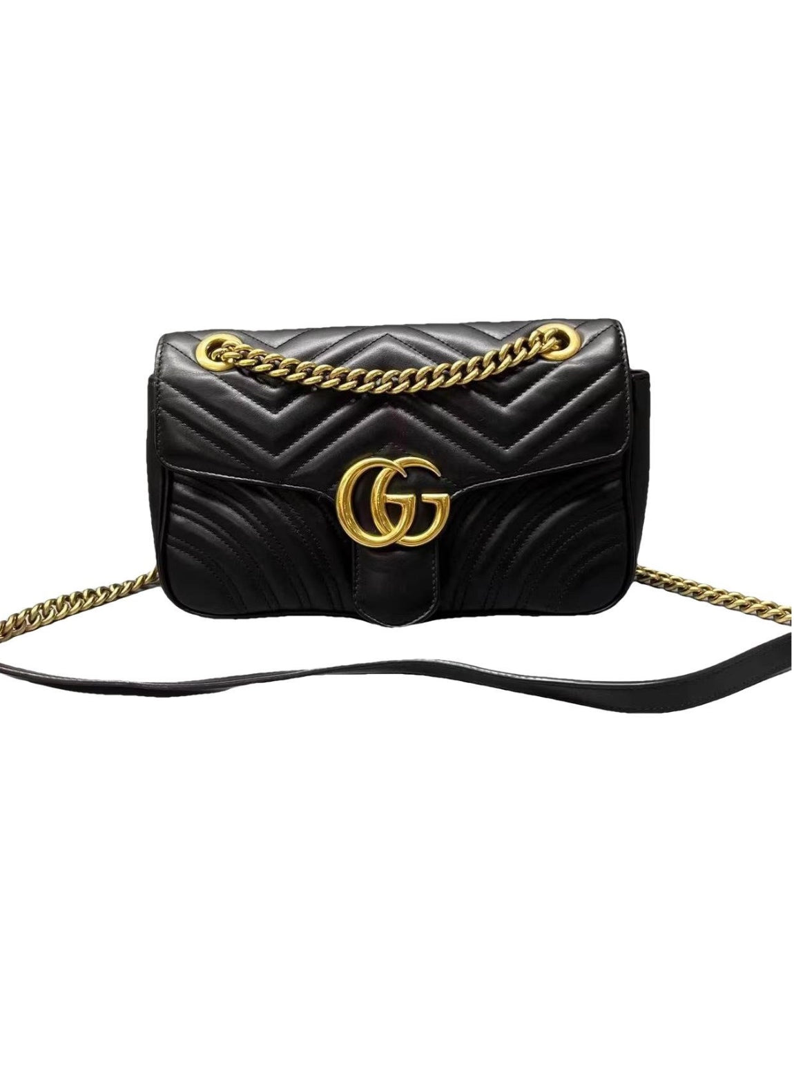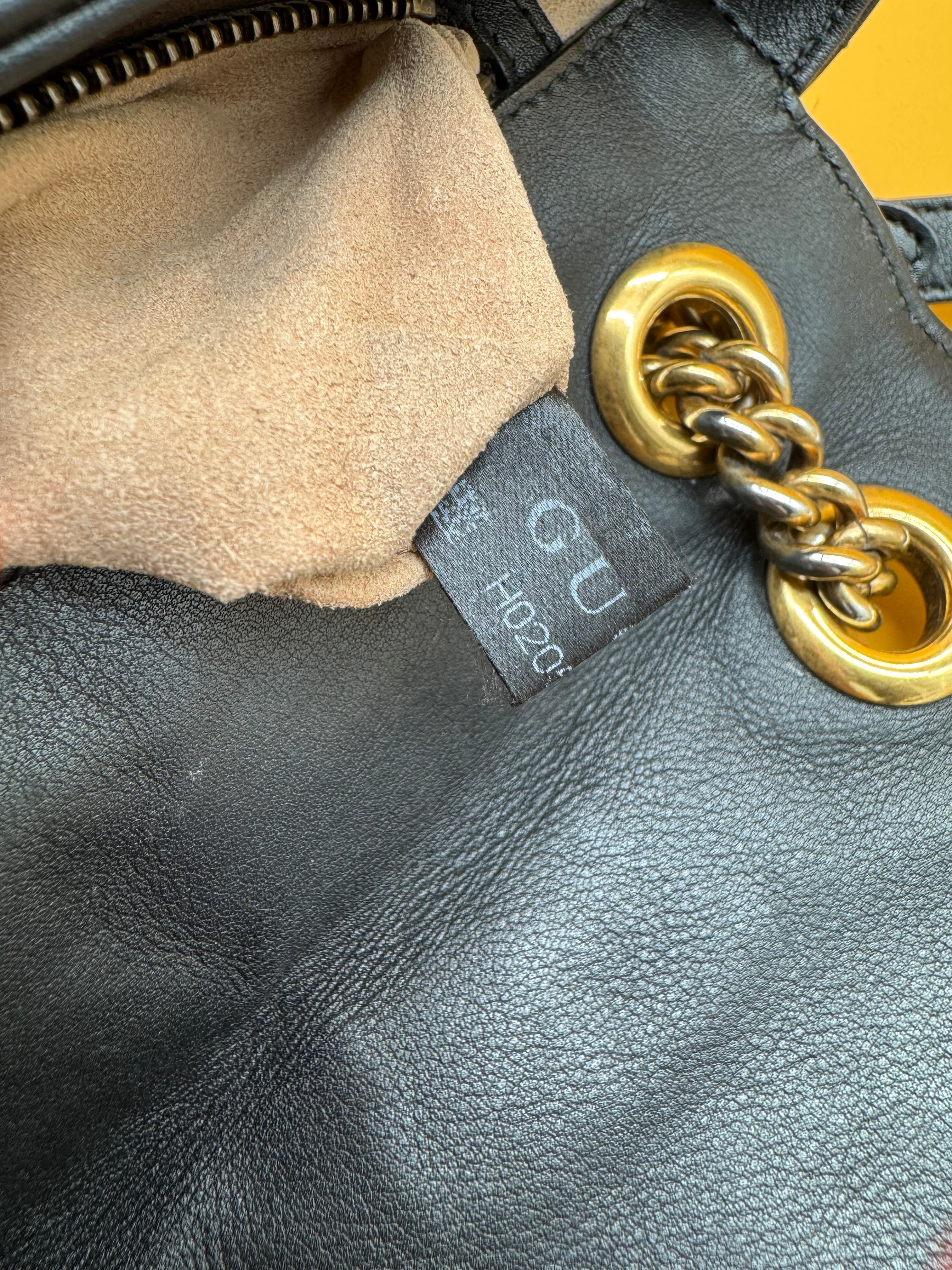 Brand:Gucci Model:GG Exterior material:leather Exterior colour:black Print:plain Interior material:leather Closure:flap Hardware tone:gold Type:Crossbody Accessories: Features: Serial number:present Condition:good Dimension; Height:26CM...