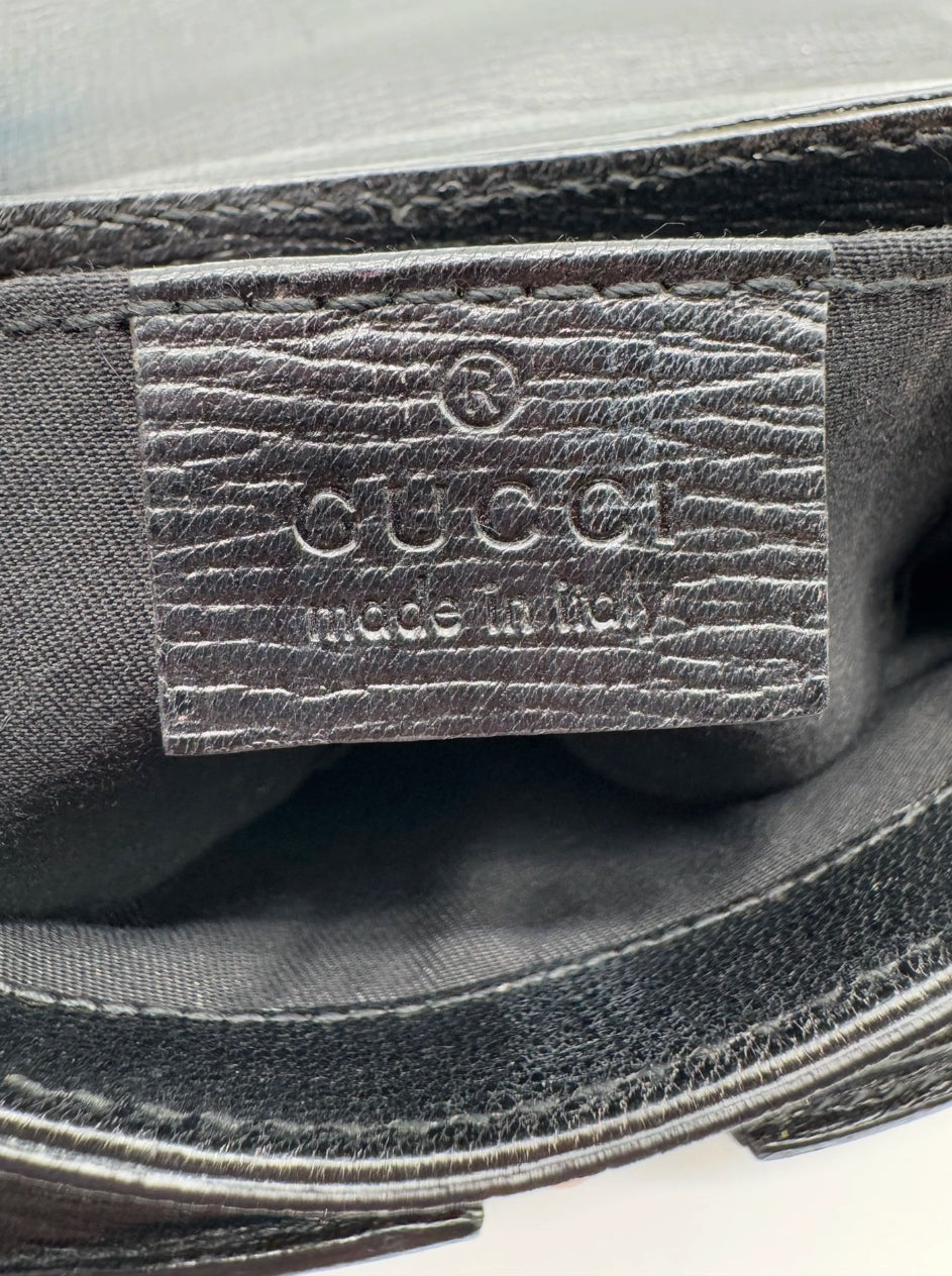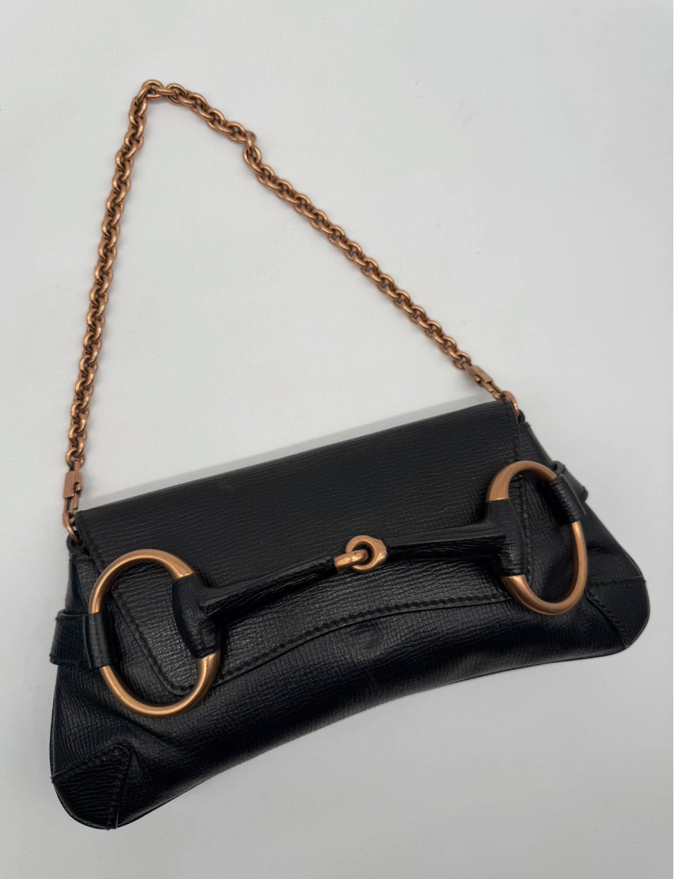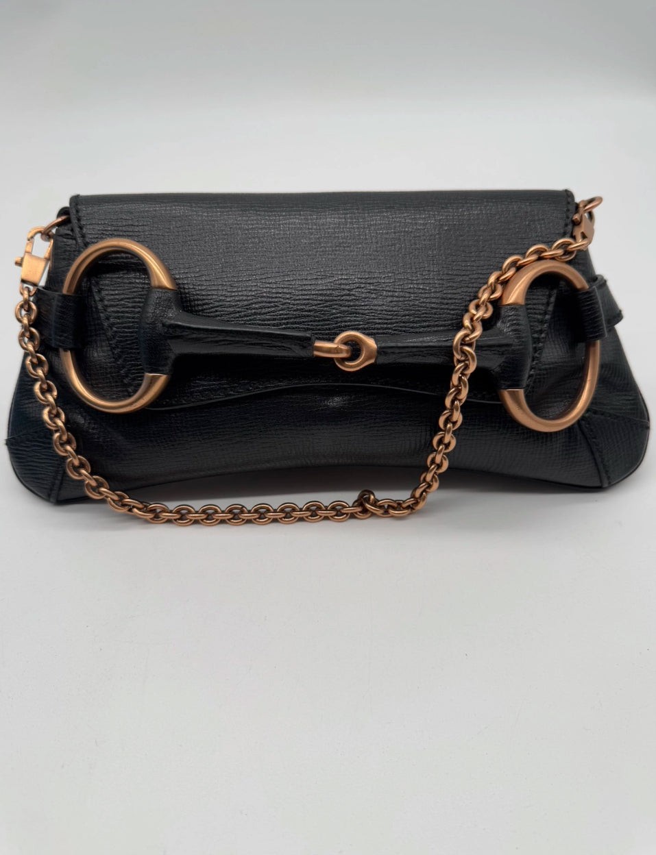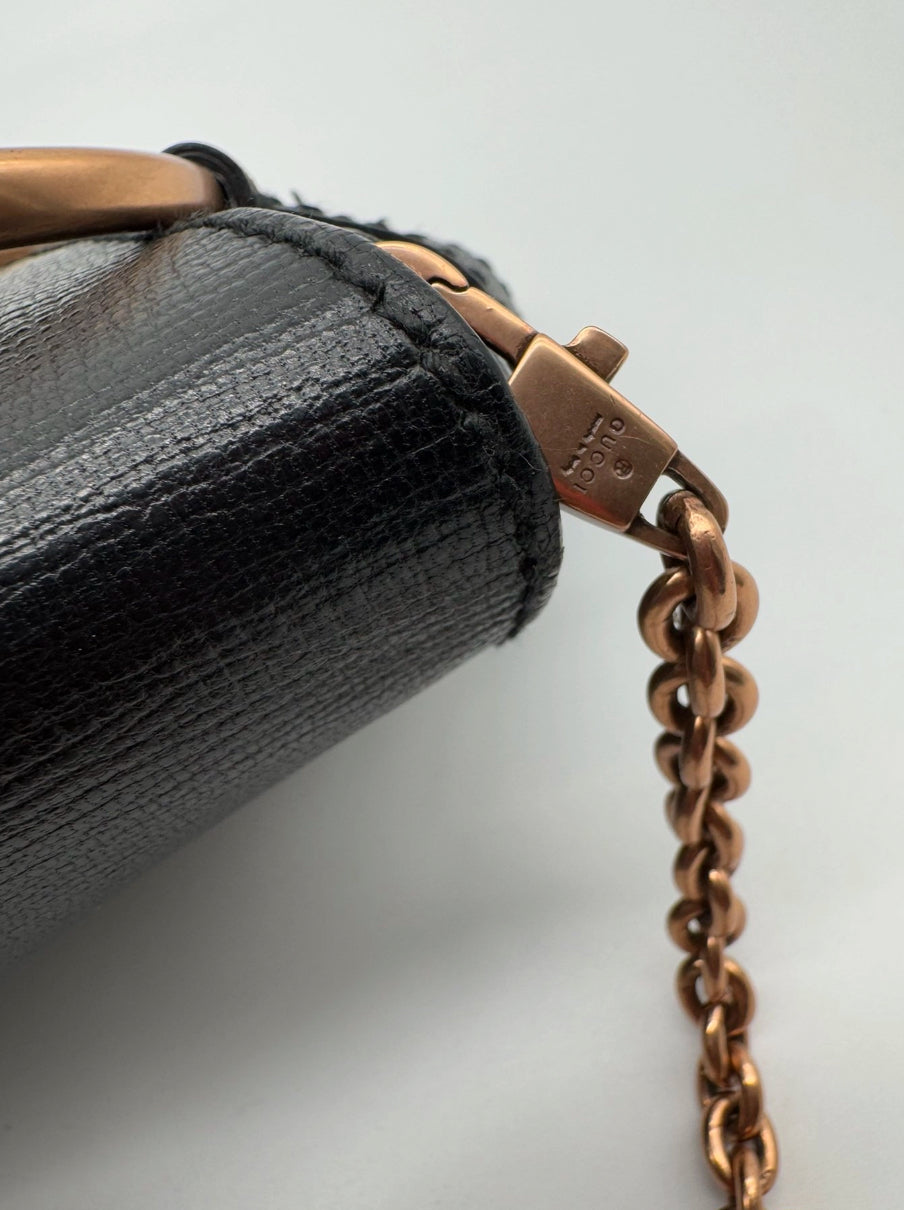 Brand:Gucci Model:horse bit Exterior material:leather Exterior colour:black Print:plain Interior material:fabric Closure:flap Hardware tone:gold Type:shoulder bag Accessories: Features: Serial number:present Condition:good...
