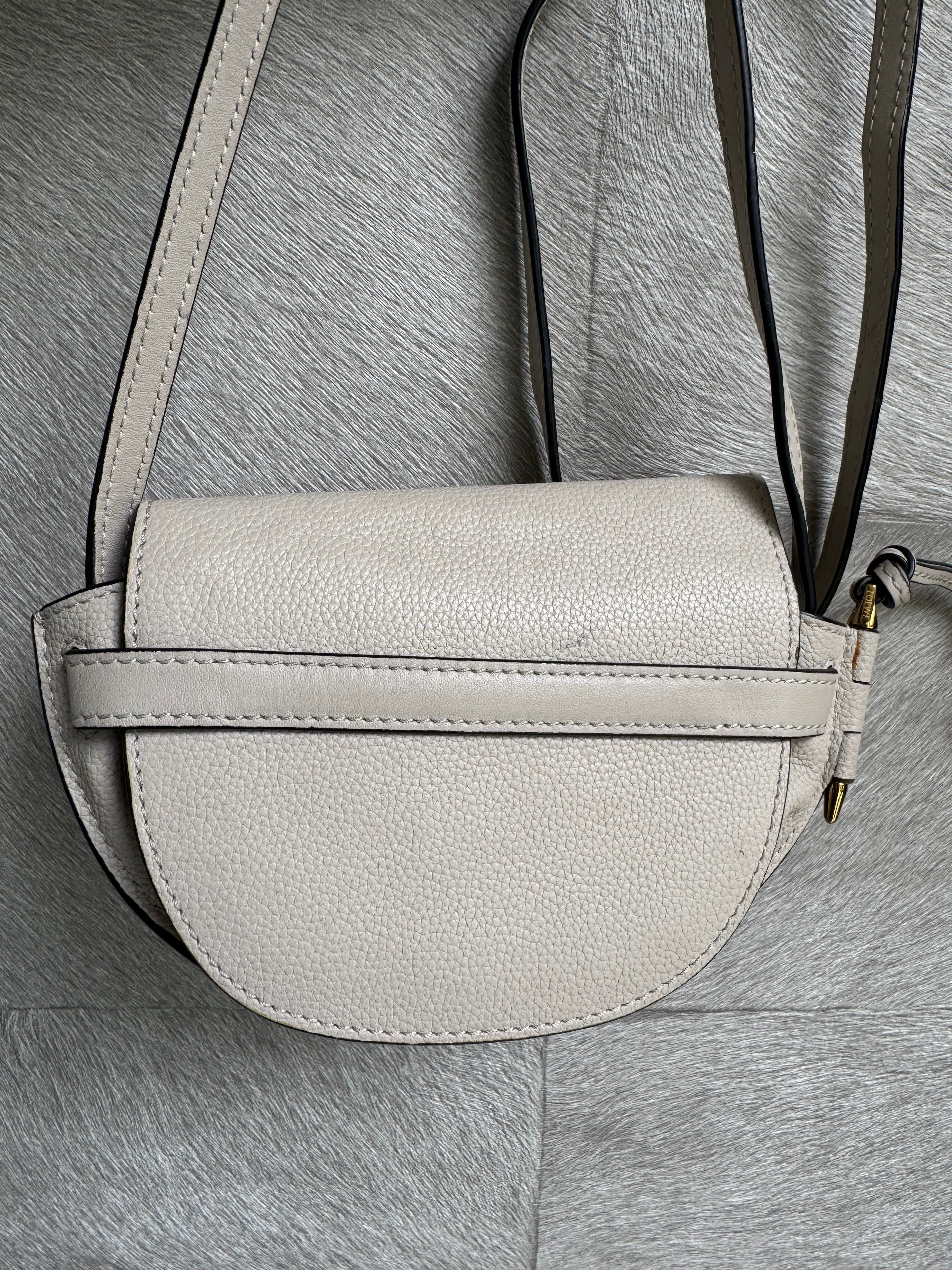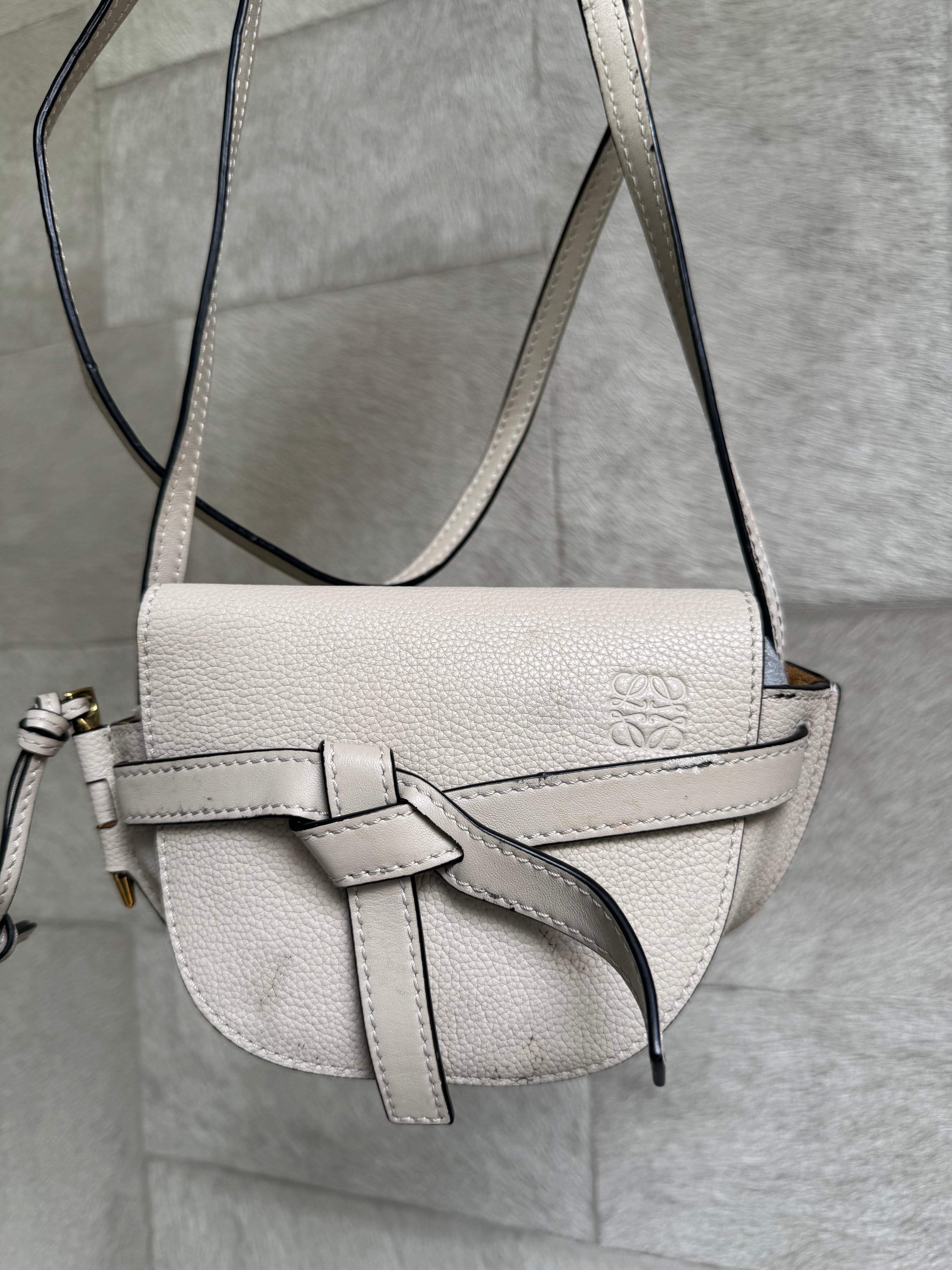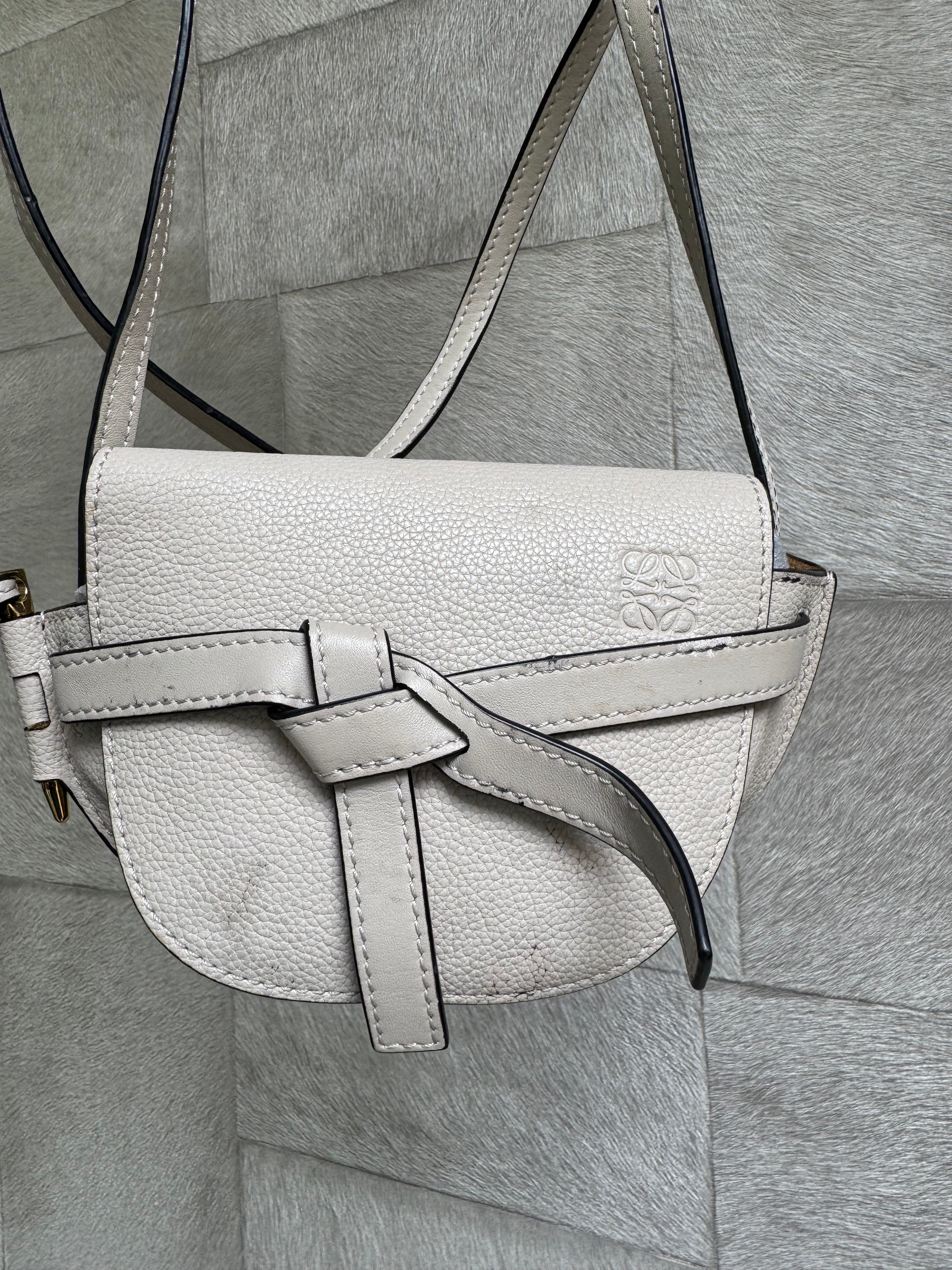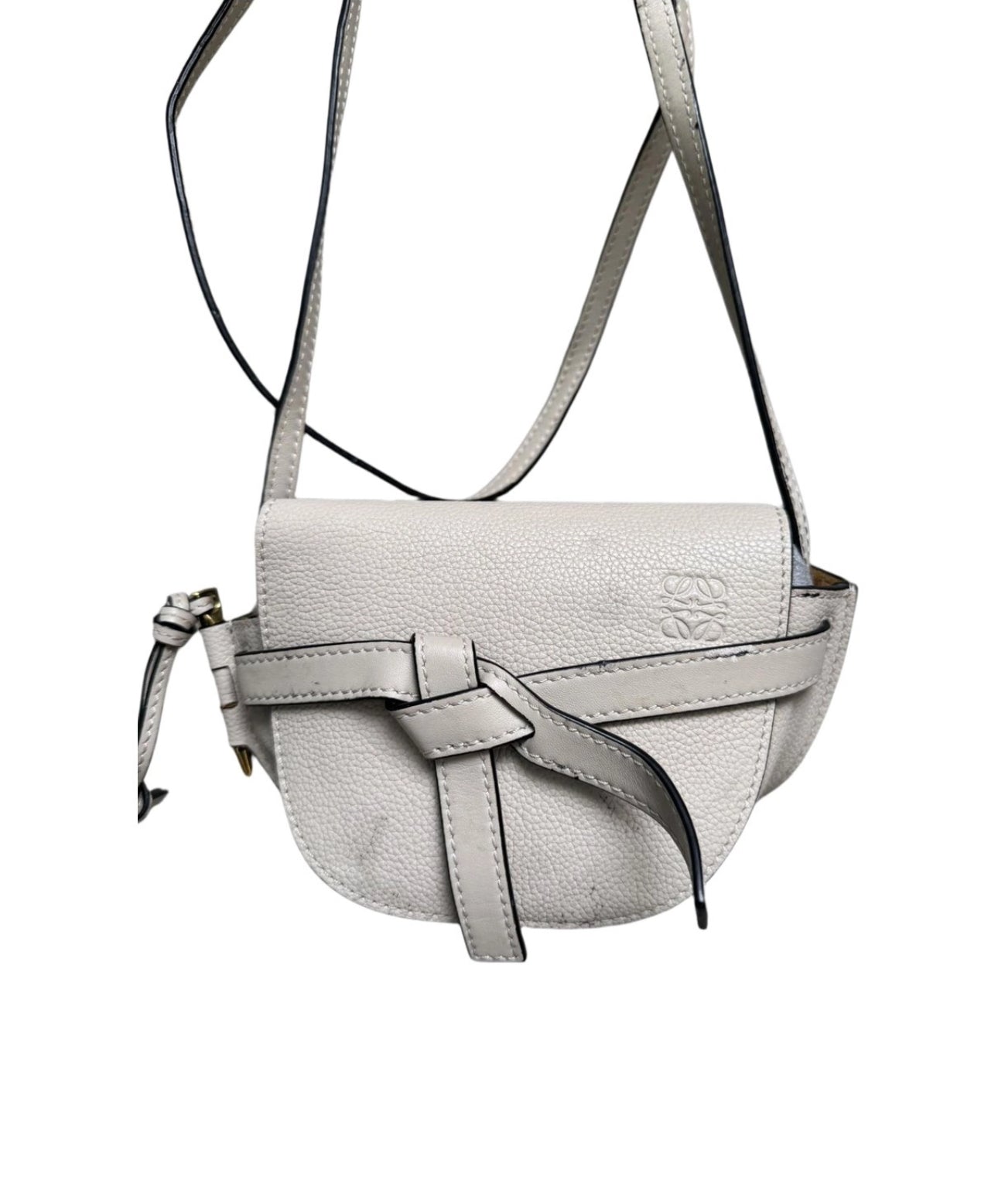 Brand:Loewe Model:gate Exterior material:leather Exterior colour:greyish white/ beige Print:plain Interior material:suede Closure:flap Hardware tone:gold Type:crossbody Accessories: Features: Serial number:present Condition:good...