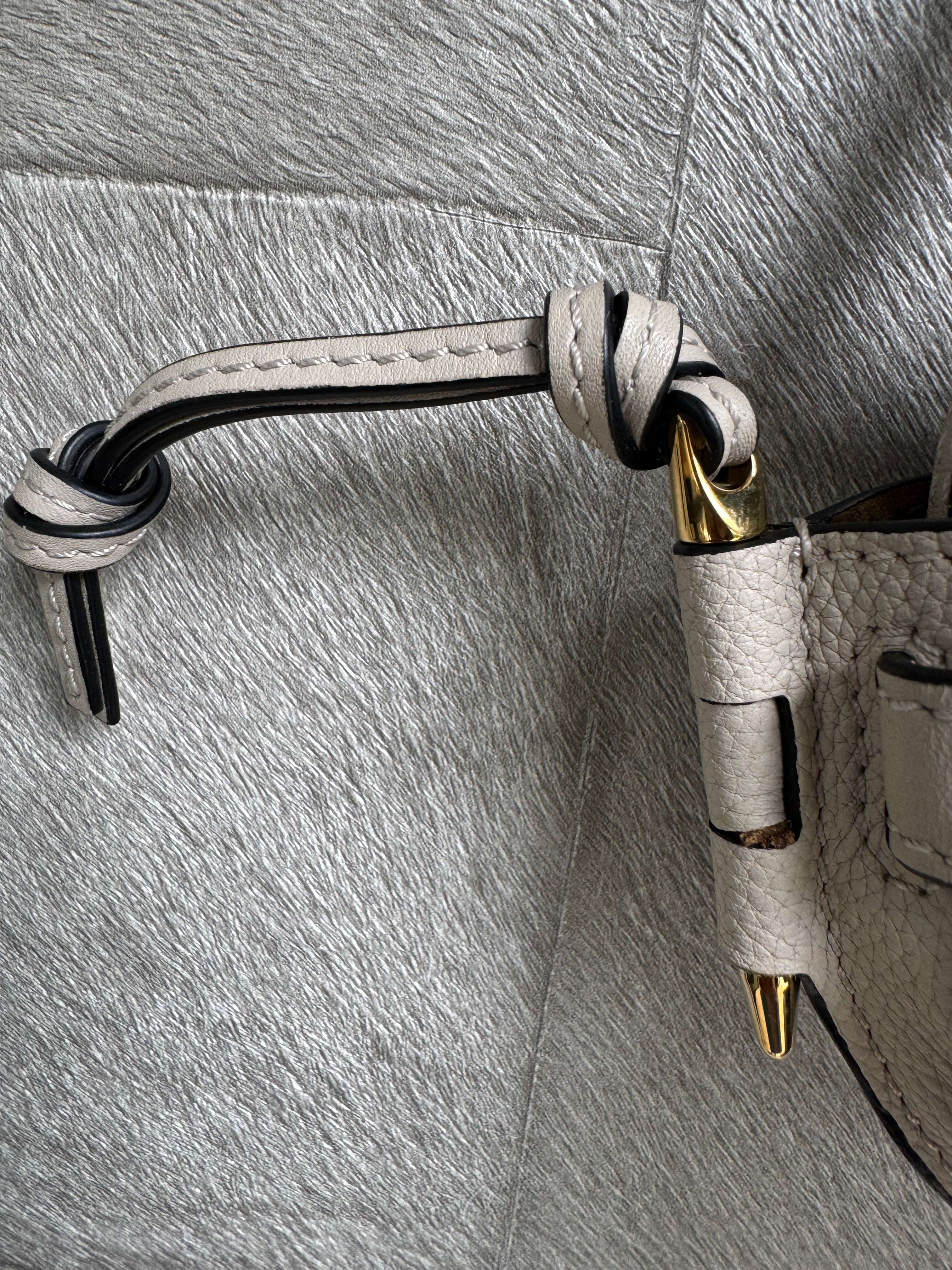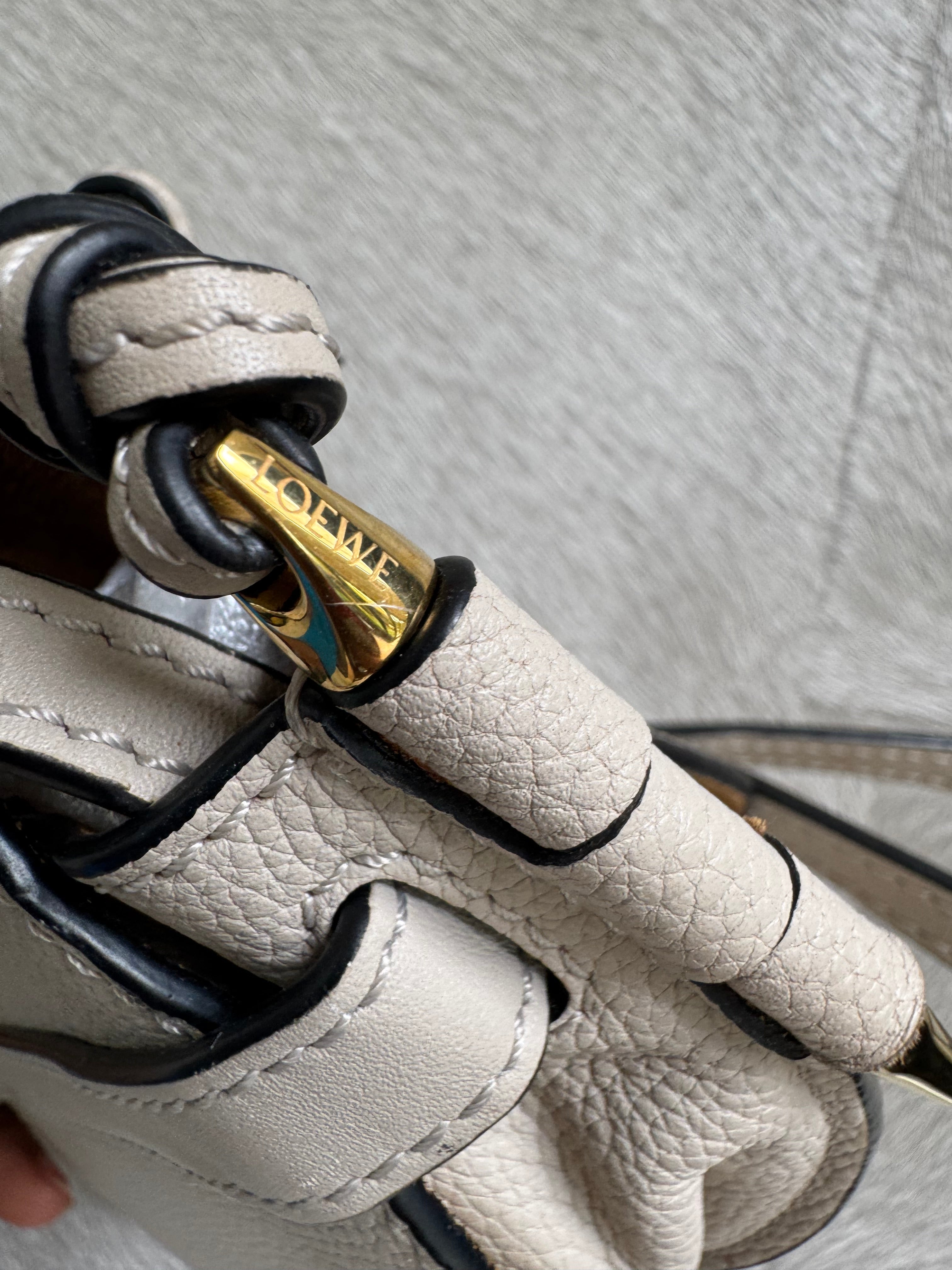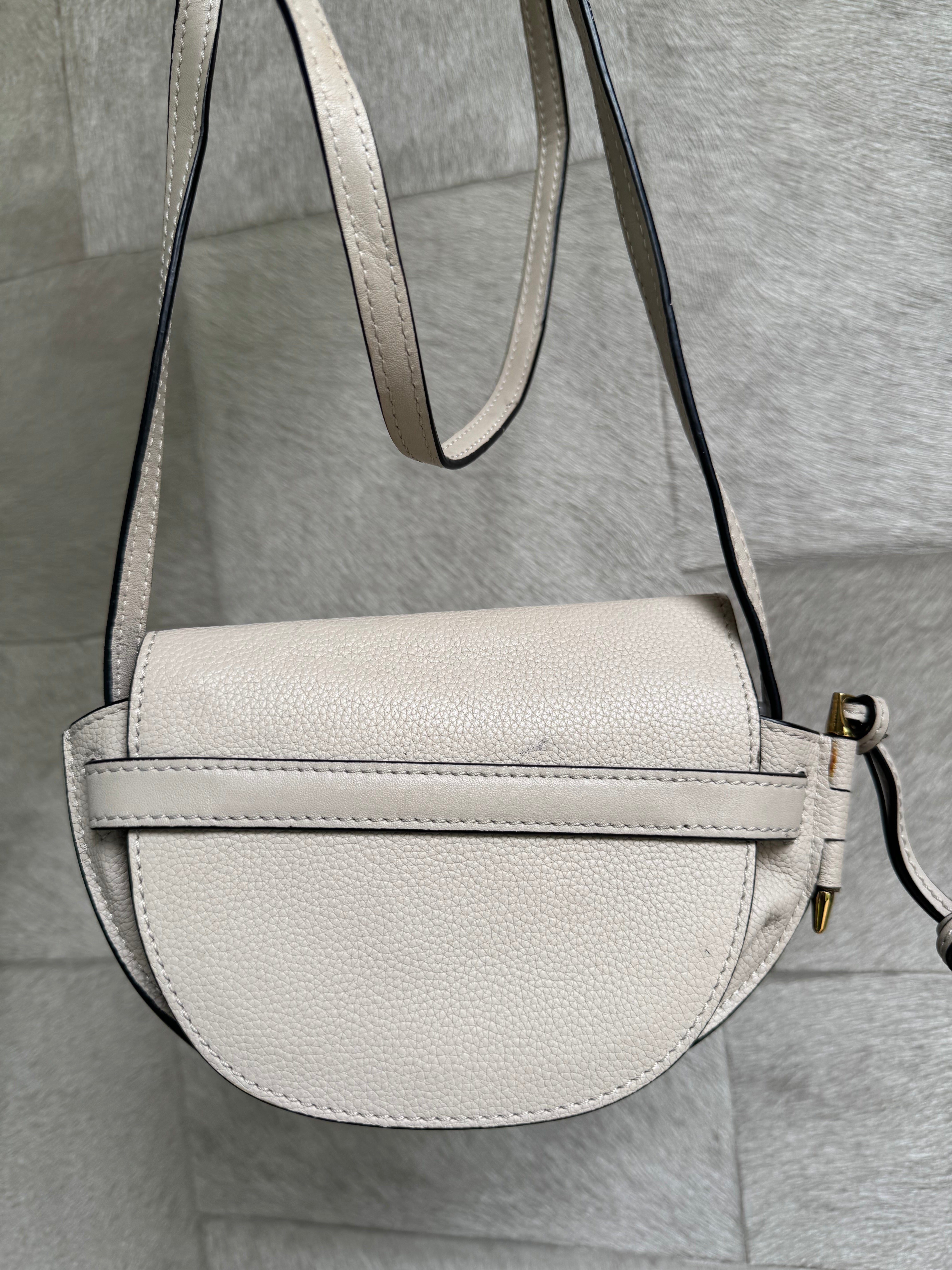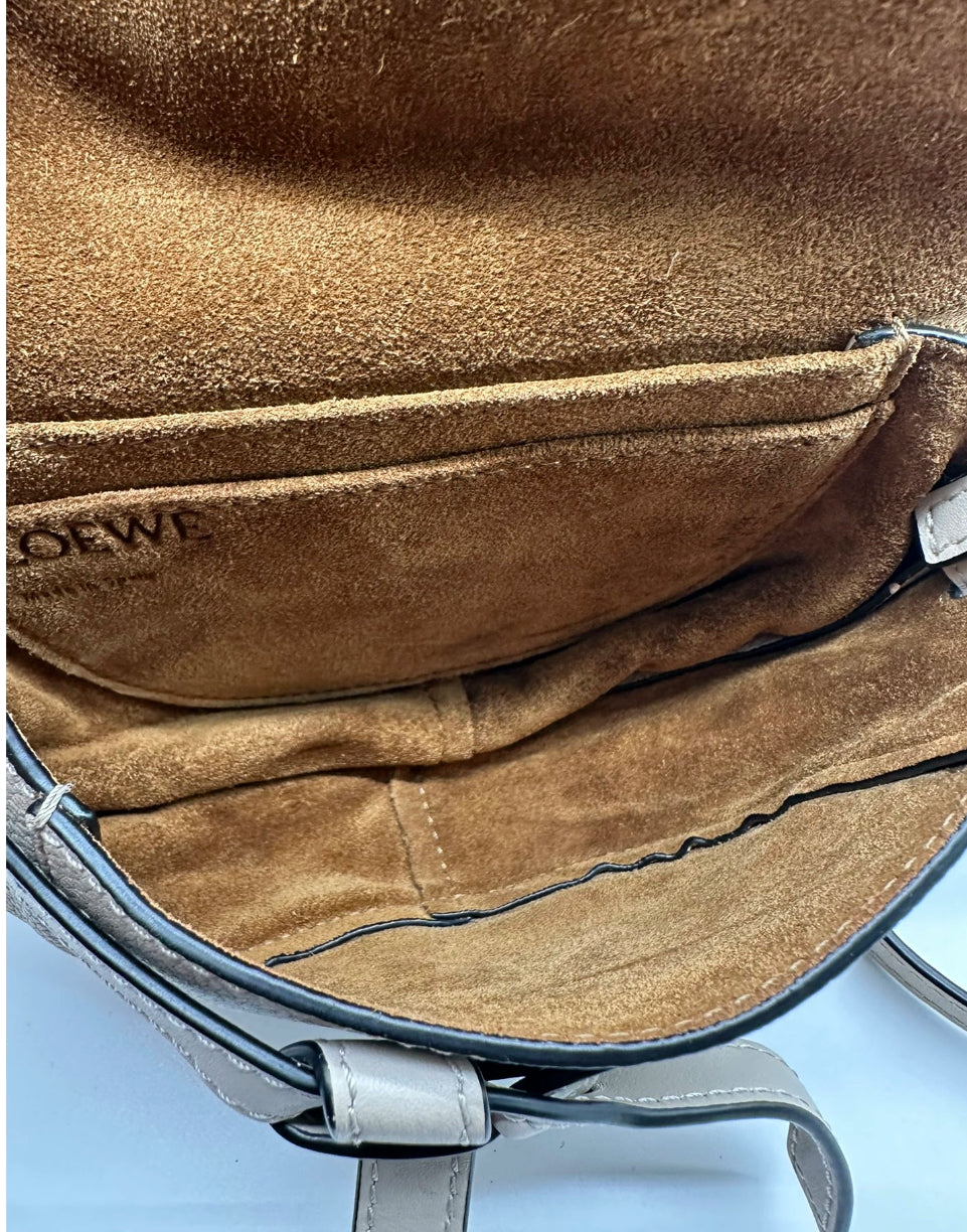 Brand:Loewe Model:gate Exterior material:leather Exterior colour:greyish white/ beige Print:plain Interior material:suede Closure:flap Hardware tone:gold Type:crossbody Accessories: Features: Serial number:present Condition:good...