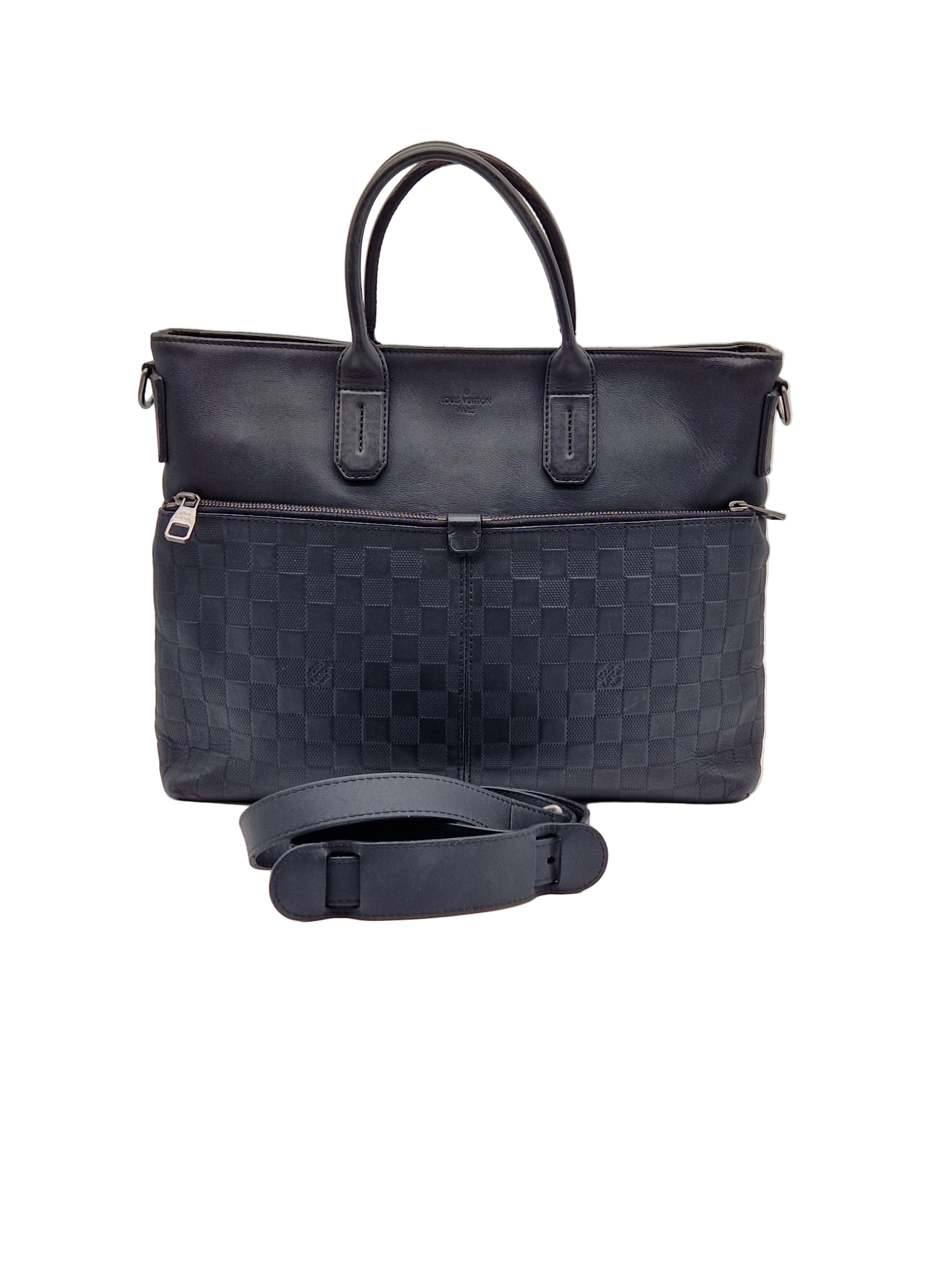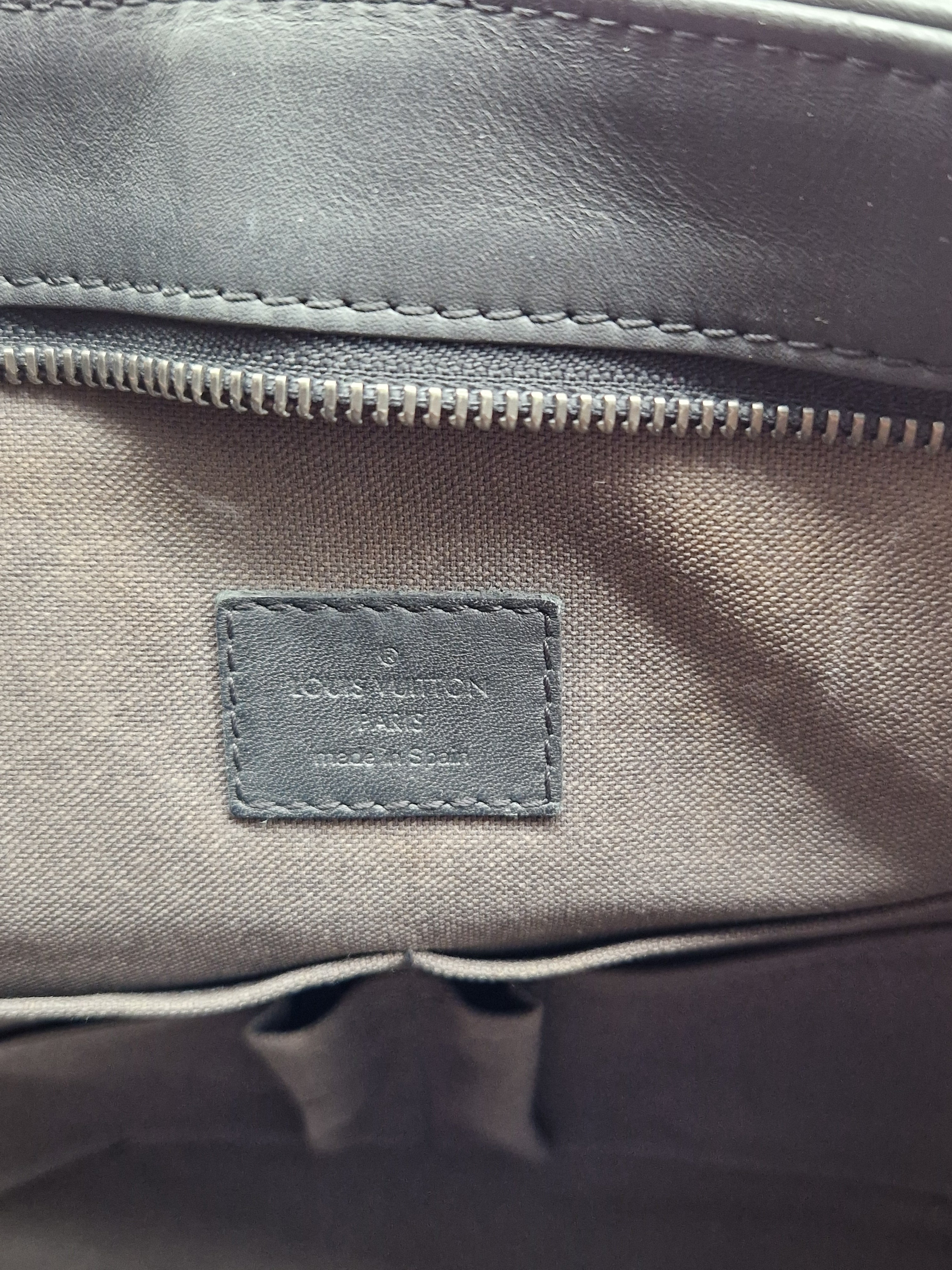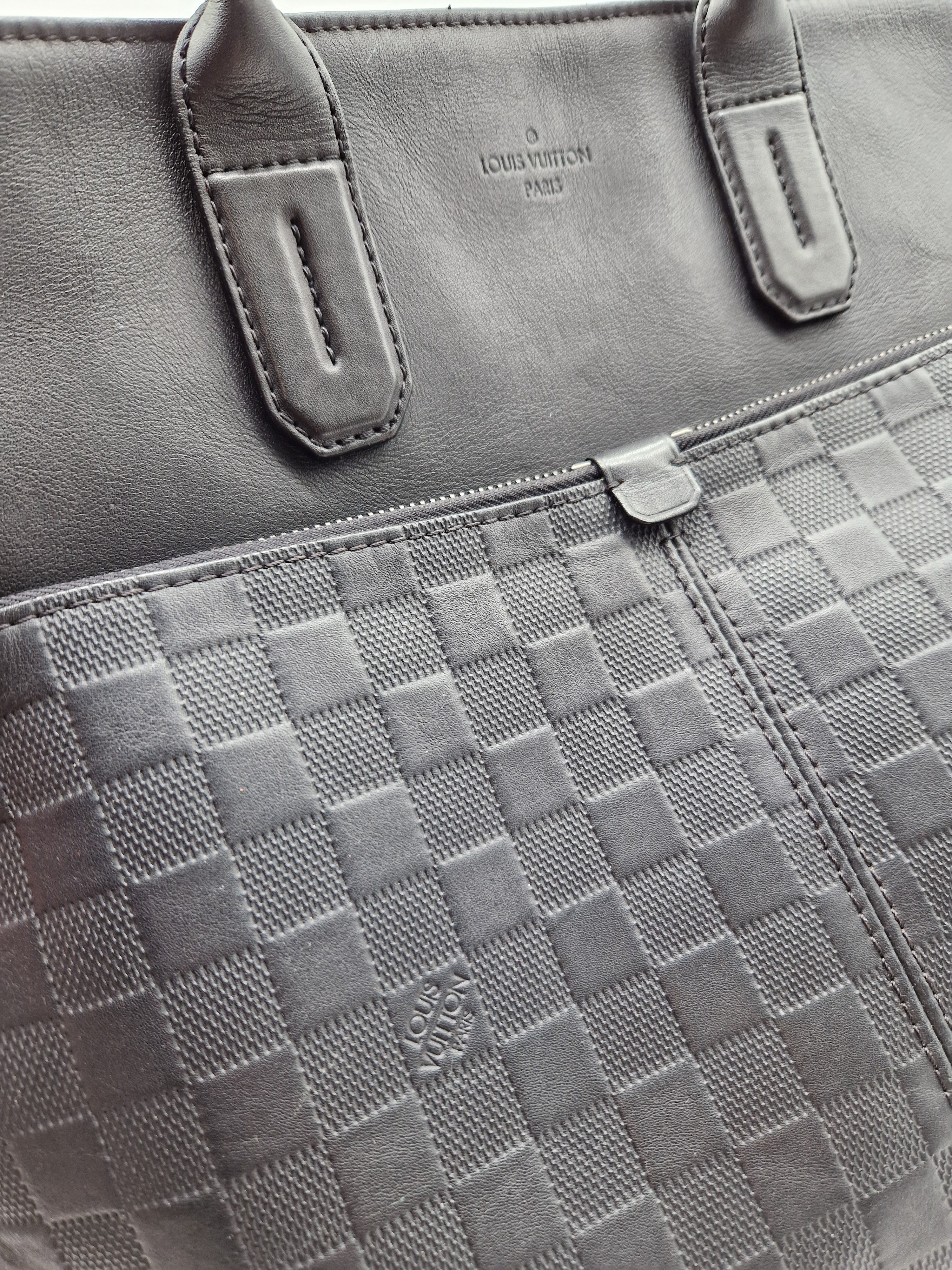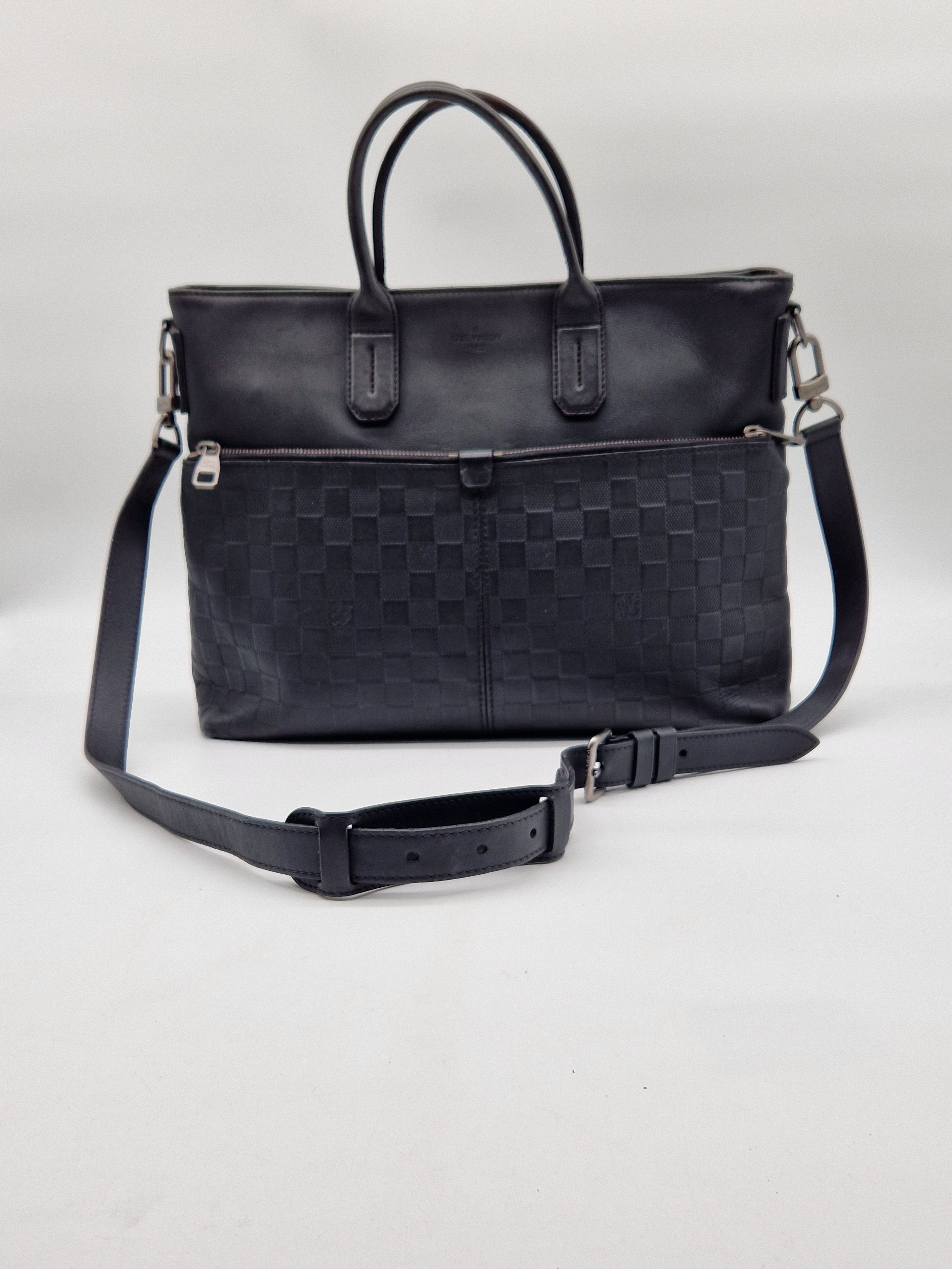 Brand:Louis Vuitton Model: Exterior material:leather Exterior colour:black Print:check Interior material: Closure:zip Hardware tone:black Type:laptop bag Accessories: Features:double top handles and...